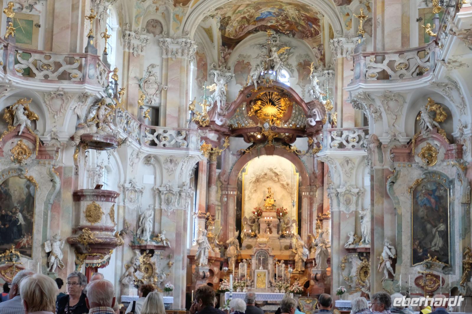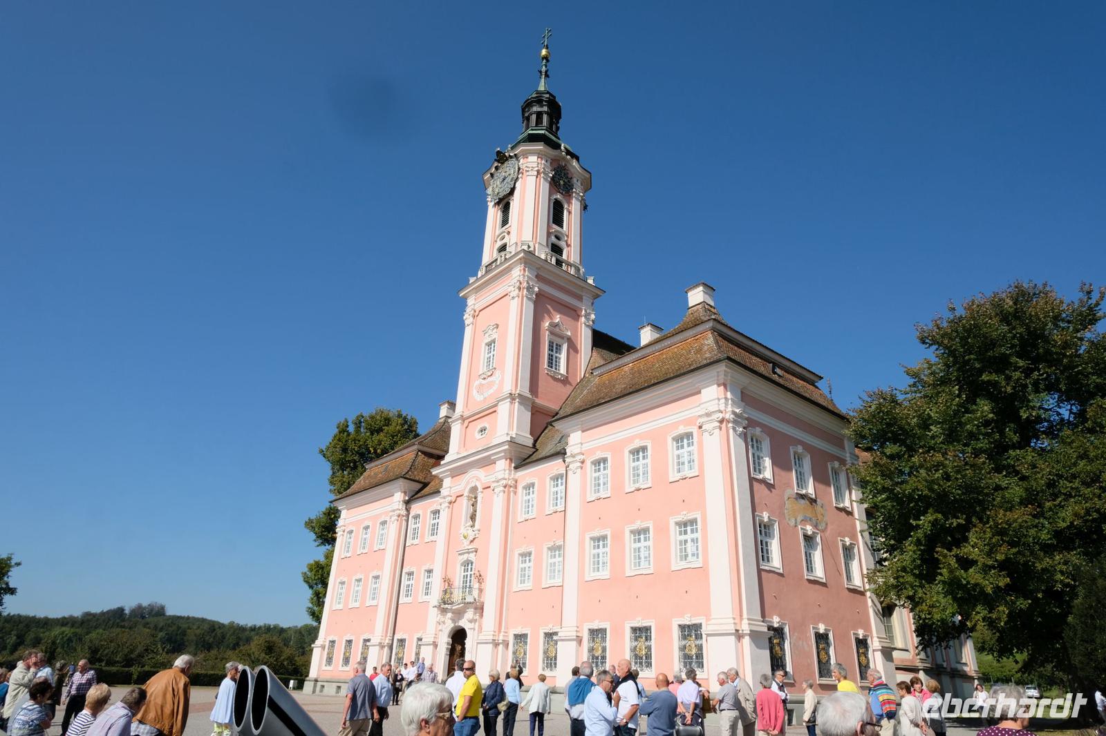 Dann ging es auf die „Konstanz“ und wir genossen die Ufernähe bis nach Friedrichshafen. Die Stadt des Zeppelinbaus empfing uns mit Sonnenscheinund alle Gäste unternahmen einen kleinen Ausflug, um die Stadt zu erkunden. Nach dem Mittag holte uns unser Bus dort ab und wir fuhren nach Birnau, wo eine wunderschöne barocke Basilika anzuschauen war. Mitten in den Weinbergen stand dieses barocke Juwel.