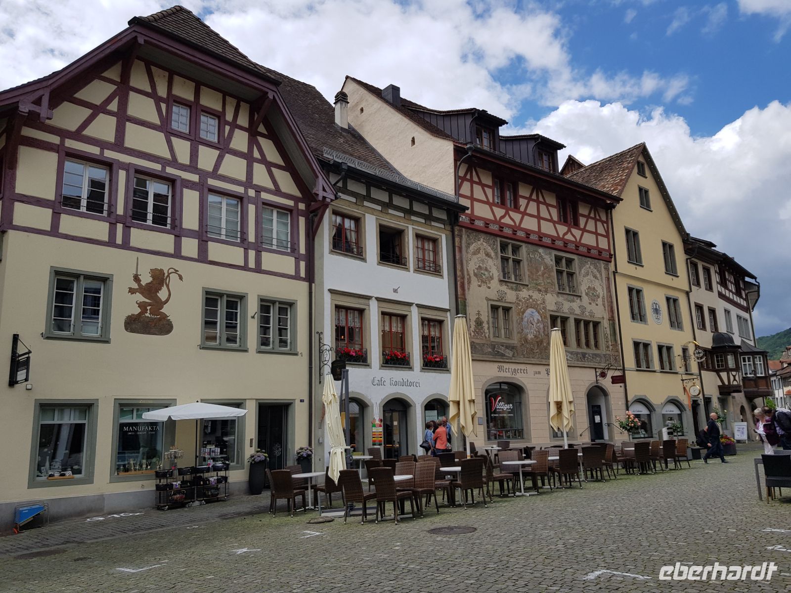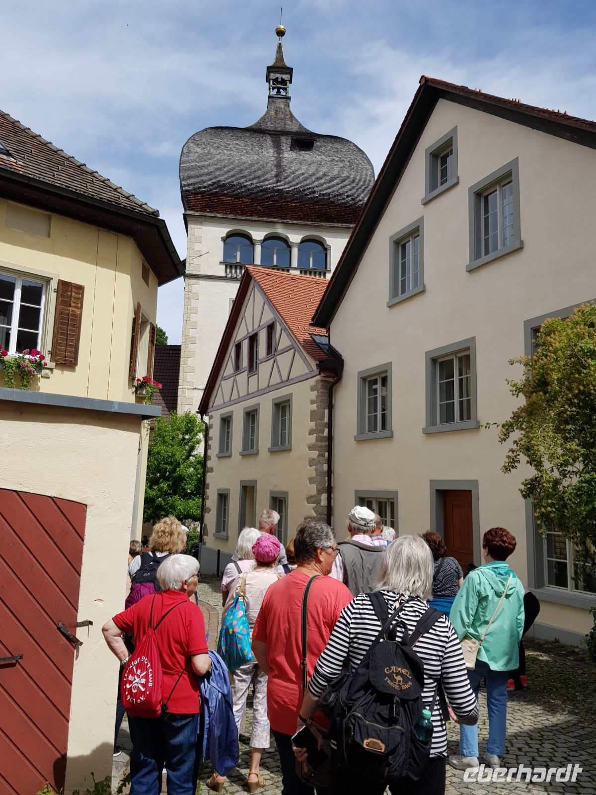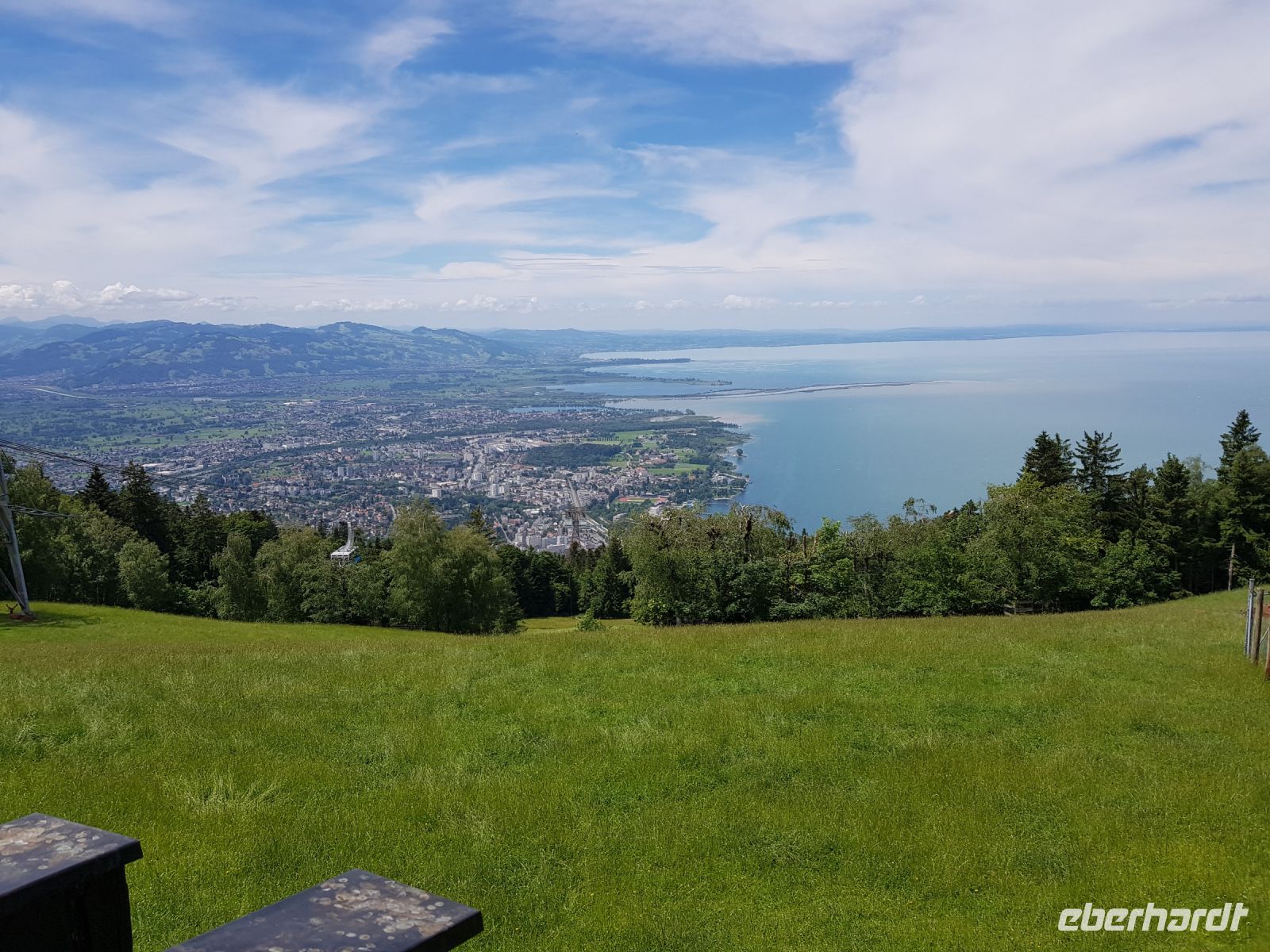 Nach einem kräftigen und sehr guten Frühstück starten wir erwartungsfroh 09:30 Uhr mit der Stadtführung. Unser Wunsch, das Festspielgelände am See besichtigen zu können, geht in Erfüllung, da gerade keine Proben stattfinden. Wir nehmen Platz und geniessen die Atmosphäre. Dafür ist Bregenz bekannt: Bleibende Momente unter freiem Himmel versprechen die Aufführungen auf der grössten Seebühne der Welt. Alle 2 Jahre entstehen hier neue spektakuläre Bühnenbilder, die weltweite Aufmerksamkeit erregen. Vorbei am Fischersteg, der ursprünglich für Angler vorgesehen war und heute in den Sommermonaten als Bar genutzt wird, werden wir in die Altstadt geführt, deren Sahnehaube die Oberstadt mit ihren mitelalterlichen Mauern, Wohnhäusern und dem Martinsturm ist. Da für den Nachmittag Regen angesagt ist, endet unser Stadtrundgang vor der Pfänderbahn .In Absprache mit den Reisegästen verlegen wir die Freizeit für einen privaten Bummel auf Nachmittag und starten gleich mit der Bahn auf den Pfänder, den Hausberg von Bregenz. Nach 2 Stunden Aufenthalt holt uns der Bus ab und wer in die Stadt möchte, verabschiedet sich hier. Der Regenguss kommt später, aber mit voller Wucht und anfänglichem Sturm. Zum Abendessen treffen wir die Entscheidung, die Ausflüge der nächsten 2 Tage zu tauschen, alle wollen bei Sonnenschein auf die Insel Mainau, aber mit Sonne können wir erst ab Freitag rechnen. Zum fakultativen Ausflug zum Rheinfall Schaffhausen und der kleinen Stadt Stein am Rhein wollen alle Gäste teilnehmen, auch wenn kleine Regenschauer vorausgesagt sind.