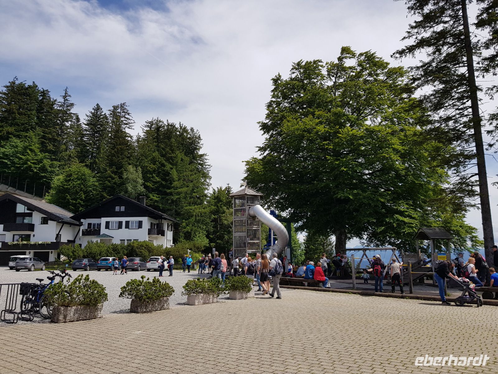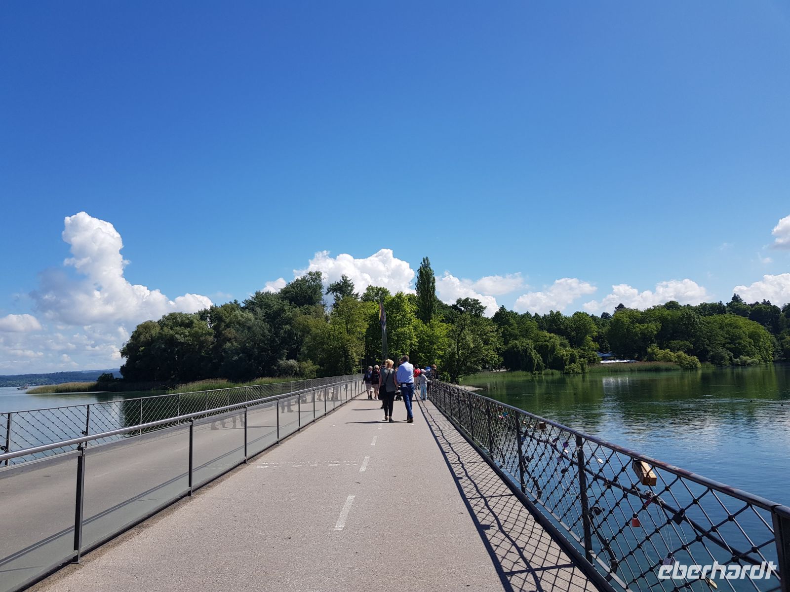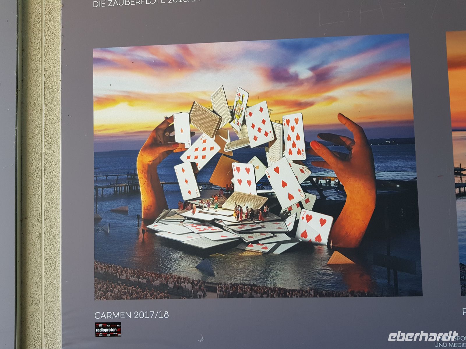 Nach einem kräftigen und sehr guten Frühstück starten wir erwartungsfroh 09:30 Uhr mit der Stadtführung. Unser Wunsch, das Festspielgelände am See besichtigen zu können, geht in Erfüllung, da gerade keine Proben stattfinden. Wir nehmen Platz und geniessen die Atmosphäre. Dafür ist Bregenz bekannt: Bleibende Momente unter freiem Himmel versprechen die Aufführungen auf der grössten Seebühne der Welt. Alle 2 Jahre entstehen hier neue spektakuläre Bühnenbilder, die weltweite Aufmerksamkeit erregen. Vorbei am Fischersteg, der ursprünglich für Angler vorgesehen war und heute in den Sommermonaten als Bar genutzt wird, werden wir in die Altstadt geführt, deren Sahnehaube die Oberstadt mit ihren mitelalterlichen Mauern, Wohnhäusern und dem Martinsturm ist. Da für den Nachmittag Regen angesagt ist, endet unser Stadtrundgang vor der Pfänderbahn .In Absprache mit den Reisegästen verlegen wir die Freizeit für einen privaten Bummel auf Nachmittag und starten gleich mit der Bahn auf den Pfänder, den Hausberg von Bregenz. Nach 2 Stunden Aufenthalt holt uns der Bus ab und wer in die Stadt möchte, verabschiedet sich hier. Der Regenguss kommt später, aber mit voller Wucht und anfänglichem Sturm. Zum Abendessen treffen wir die Entscheidung, die Ausflüge der nächsten 2 Tage zu tauschen, alle wollen bei Sonnenschein auf die Insel Mainau, aber mit Sonne können wir erst ab Freitag rechnen. Zum fakultativen Ausflug zum Rheinfall Schaffhausen und der kleinen Stadt Stein am Rhein wollen alle Gäste teilnehmen, auch wenn kleine Regenschauer vorausgesagt sind.