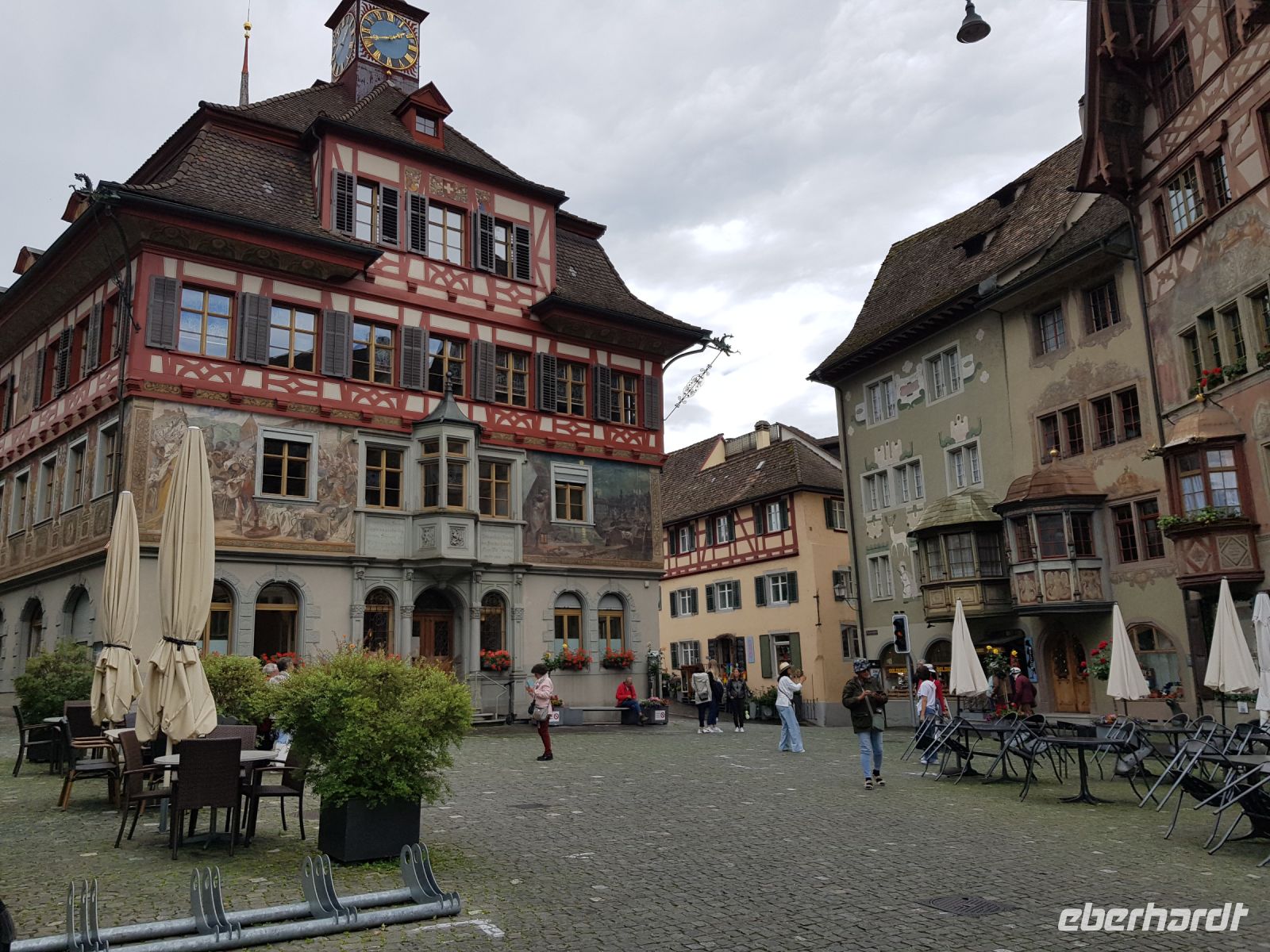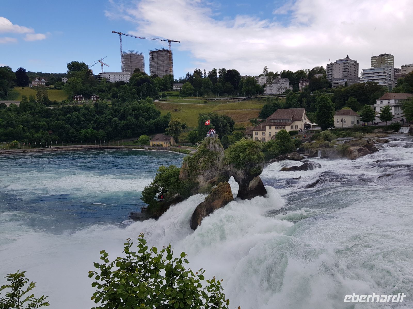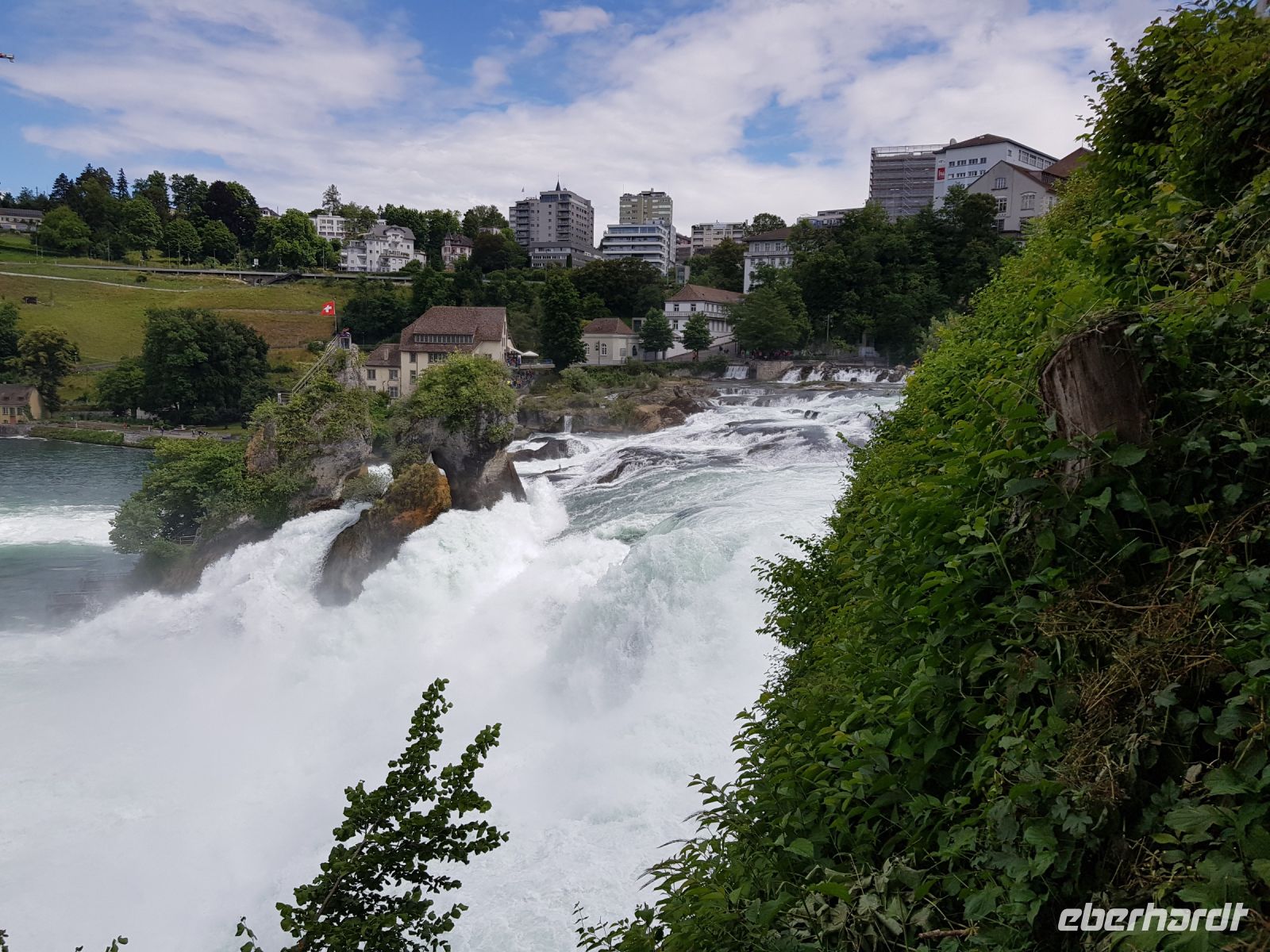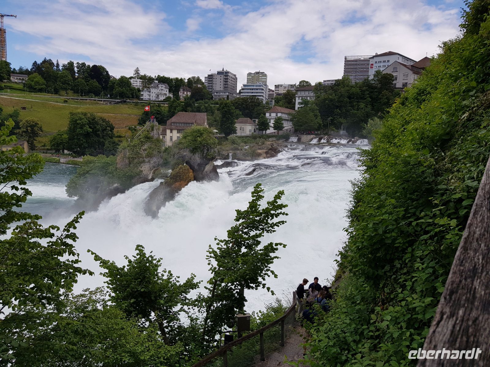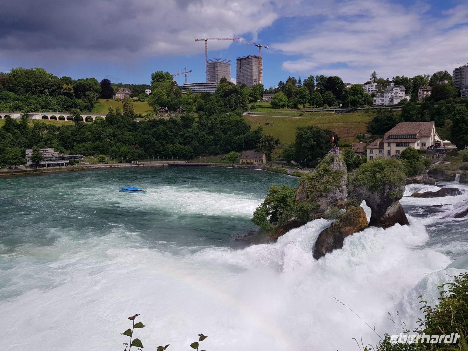Wir starten wieder pünktlich 09:00 Uhr zu unserem Ausflug in den Hauptort des Schweizer Kantons - Schaffhausen - und werden auf der Fahrt sogar mit ein wenig Sonne verwöhnt. Das lässt uns hoffen, dass es an unserem ersten Ziel vielleicht nicht regnet. So hundertprozentig klappt das zwar nicht, erst mal werden wir wieder mit Regen empfangen, aber der hört auch wieder auf und der grösste Wasserfall Europas begrüsst uns mit einem imposanten Naturschauspiel: auf einer Breite von 150m und aus 23 m Höhe stürzen jede Sekunde 700 000 Liter Wasser tosend in das durch den charakistischen Felsen gekrönte Rheinfallbecken. Nach einerm 90 min. Aufenthalt steigen wir wieder in den Bus, der Rheinfall verabschiedet uns mit einem leichten Sonnenstrahl. Auf geht es in die nur 20 km entfernte Stadt Stein am Rhein. Sie zählt zu den wohl mit Abstand am besten erhaltenen mittelalterlichen Kleinstädten der Schweiz. Wir tauchen ein in ihre märchenhafte Idylle, bewundern die alten mit Fresken verzierten Häuser und bummeln am Ufer des Rheins zurück zum Stadttor, an dem unser Bus wartet. Das Fazit für diesen Tag: trotz Wolken und ein bißchen Regen war es ein wunderbarer Ausflug und im Hotel geniessen wir unser Abendessen: es geht flüssiger bei der Servierung der 4 Gänge voran und es ist nicht mehr ganz so laut.
