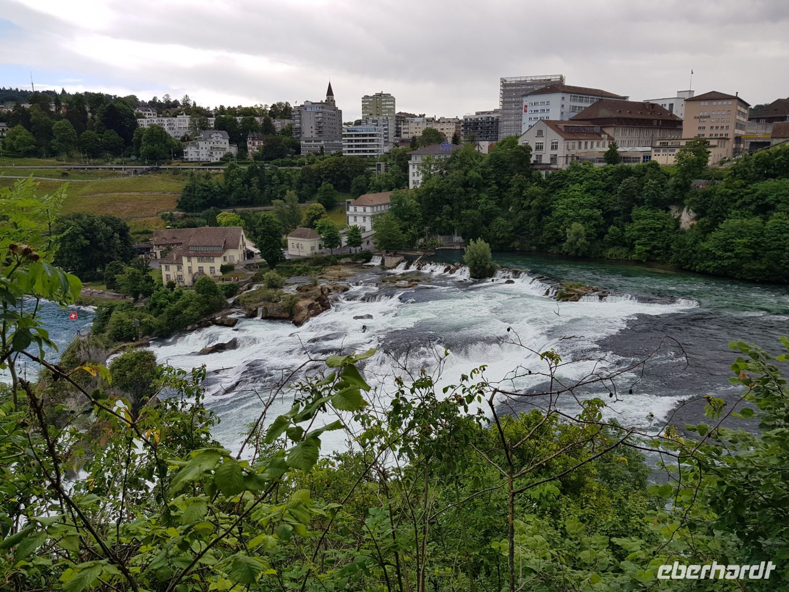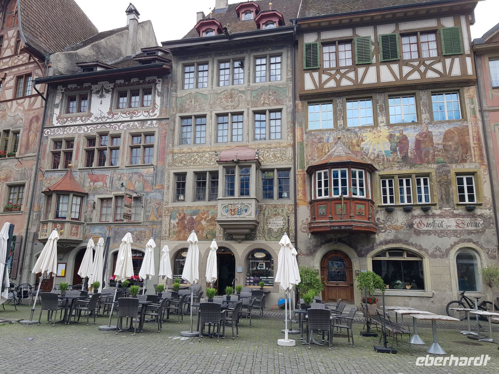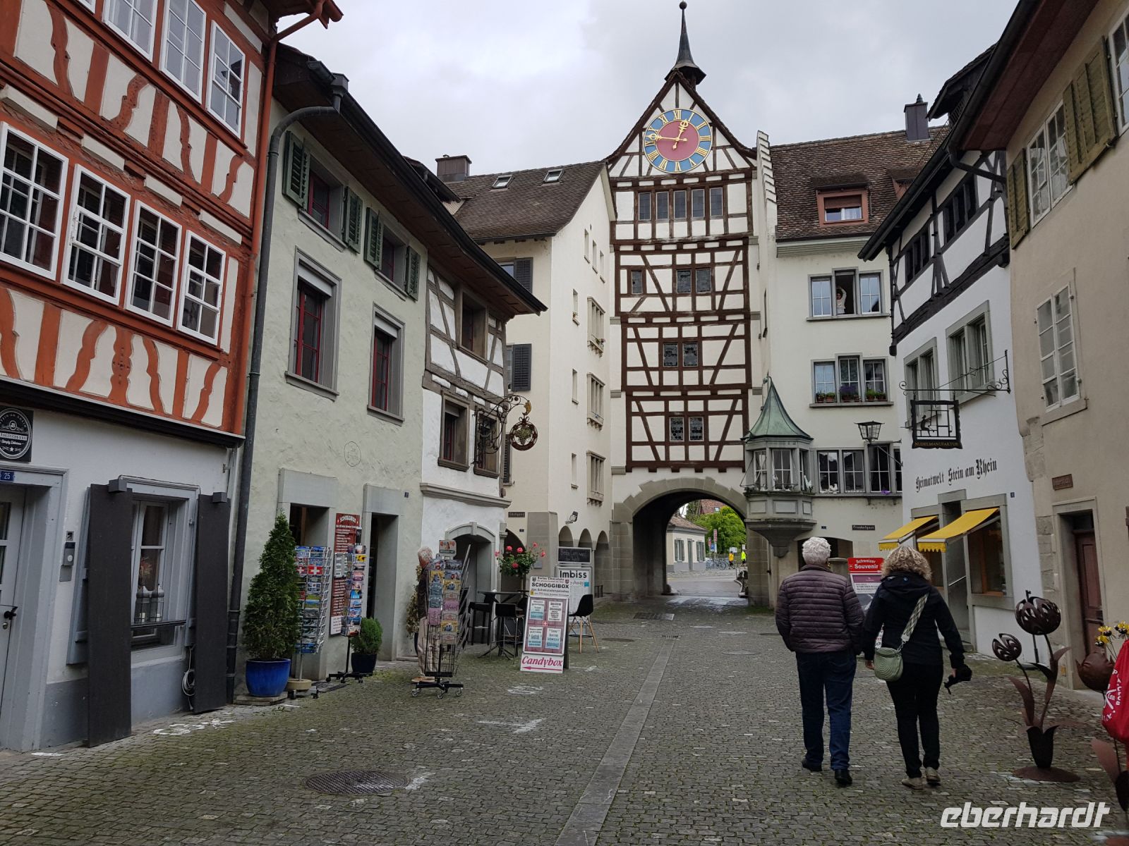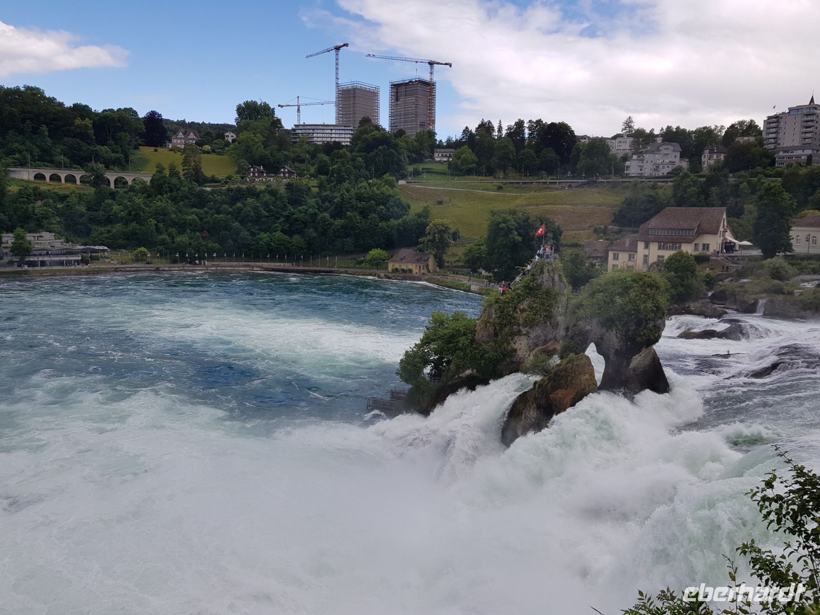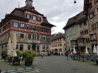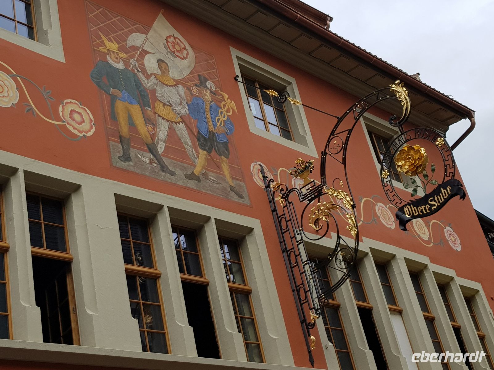 Wir starten wieder pünktlich 09:00 Uhr zu unserem Ausflug in den Hauptort des Schweizer Kantons - Schaffhausen - und werden auf der Fahrt sogar mit ein wenig Sonne verwöhnt. Das lässt uns hoffen, dass es an unserem ersten Ziel vielleicht nicht regnet. So hundertprozentig klappt das zwar nicht, erst mal werden wir wieder mit Regen empfangen, aber der hört auch wieder auf und der grösste Wasserfall Europas begrüsst uns mit einem imposanten Naturschauspiel: auf einer Breite von 150m und aus 23 m Höhe stürzen jede Sekunde 700 000 Liter Wasser tosend in das durch den charakistischen Felsen gekrönte Rheinfallbecken. Nach einerm 90 min. Aufenthalt steigen wir wieder in den Bus, der Rheinfall verabschiedet uns mit einem leichten Sonnenstrahl. Auf geht es in die nur 20 km entfernte Stadt Stein am Rhein. Sie zählt zu den wohl mit Abstand am besten erhaltenen mittelalterlichen Kleinstädten der Schweiz. Wir tauchen ein in ihre märchenhafte Idylle, bewundern die alten mit Fresken verzierten Häuser und bummeln am Ufer des Rheins zurück zum Stadttor, an dem unser Bus wartet. Das Fazit für diesen Tag: trotz Wolken und ein bißchen Regen war es ein wunderbarer Ausflug und im Hotel geniessen wir unser Abendessen: es geht flüssiger bei der Servierung der 4 Gänge voran und es ist nicht mehr ganz so laut.