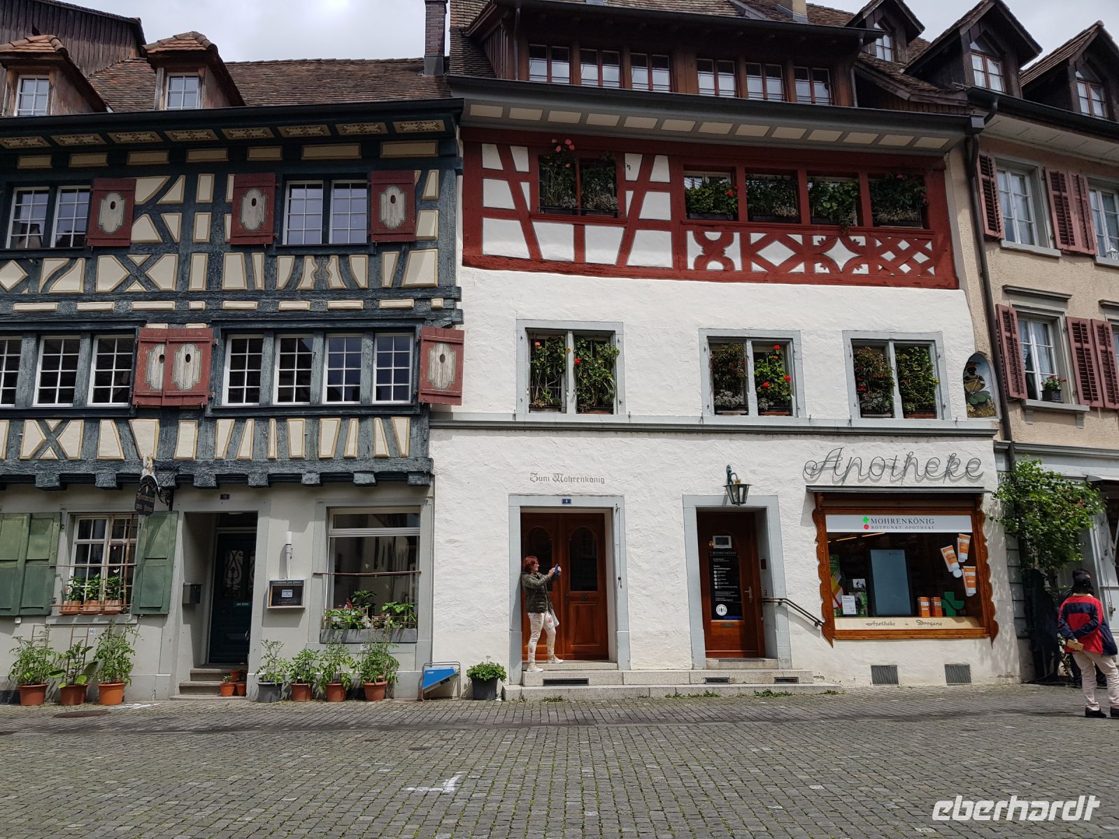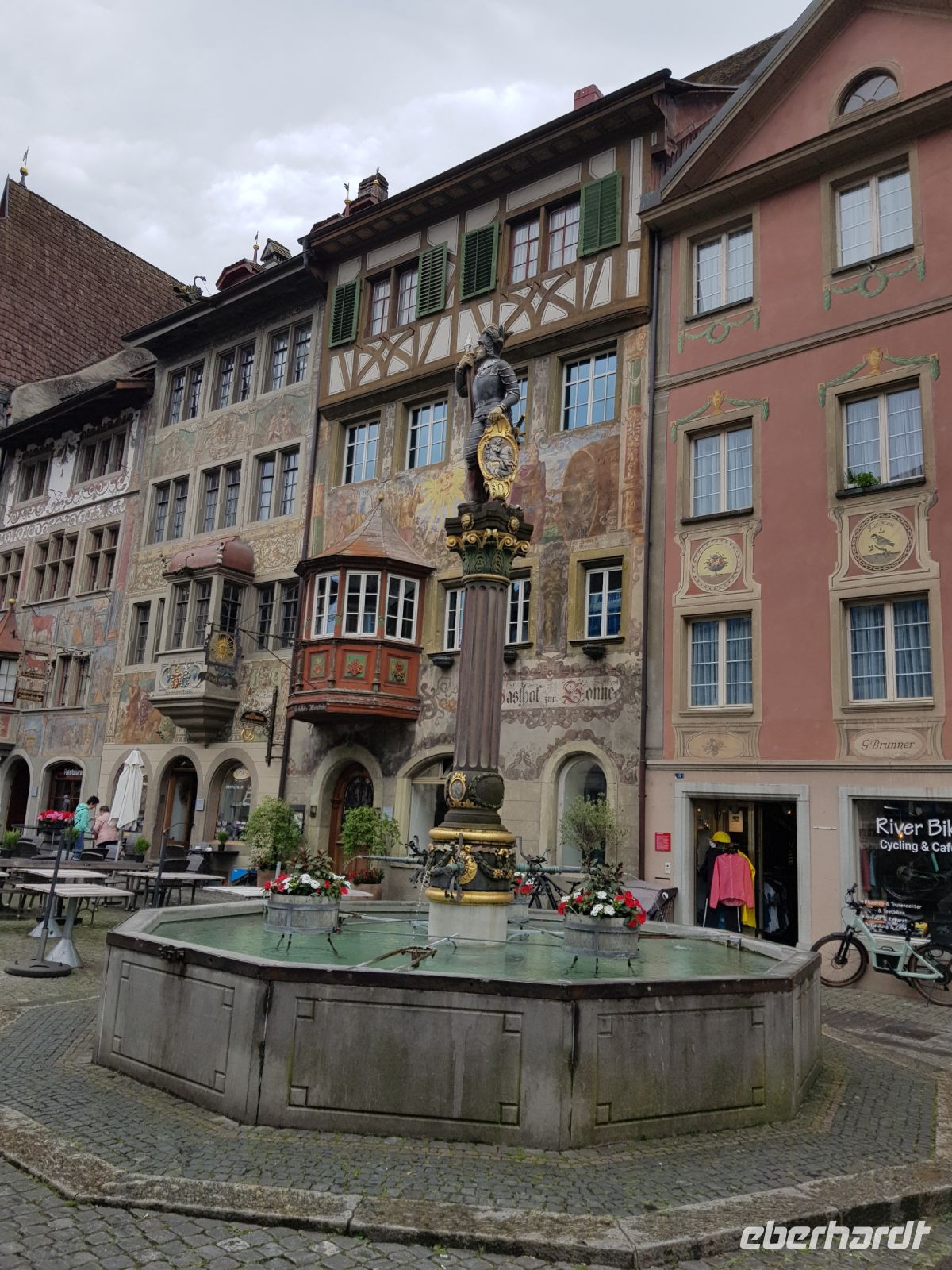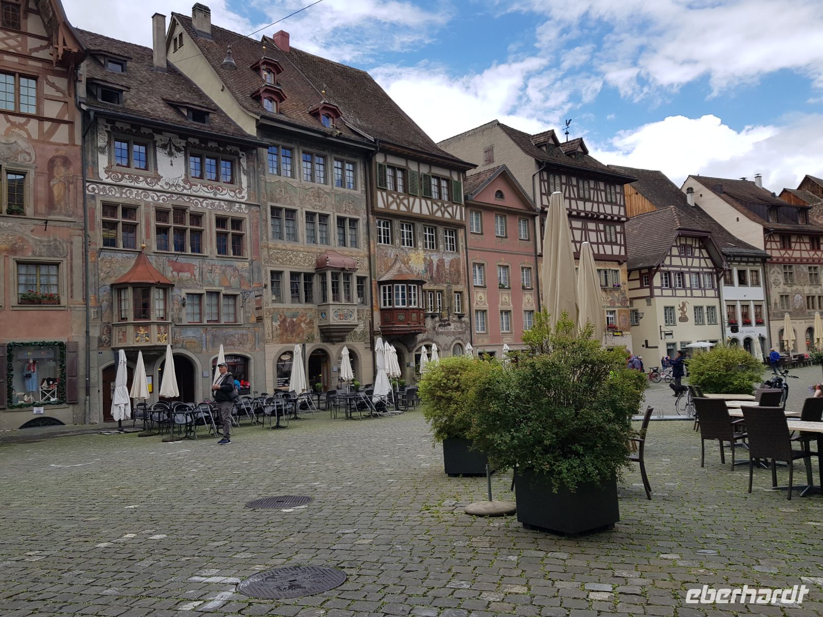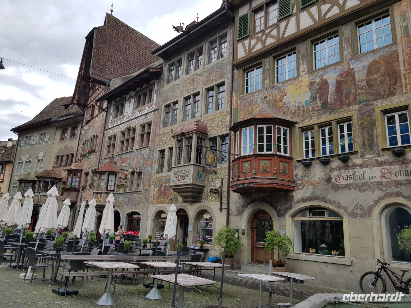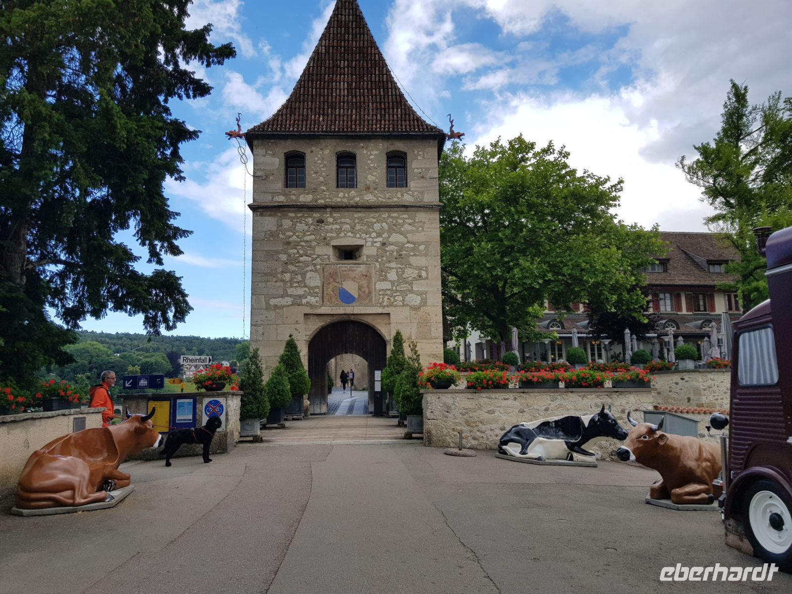 Wir starten wieder pünktlich 09:00 Uhr zu unserem Ausflug in den Hauptort des Schweizer Kantons - Schaffhausen - und werden auf der Fahrt sogar mit ein wenig Sonne verwöhnt. Das lässt uns hoffen, dass es an unserem ersten Ziel vielleicht nicht regnet. So hundertprozentig klappt das zwar nicht, erst mal werden wir wieder mit Regen empfangen, aber der hört auch wieder auf und der grösste Wasserfall Europas begrüsst uns mit einem imposanten Naturschauspiel: auf einer Breite von 150m und aus 23 m Höhe stürzen jede Sekunde 700 000 Liter Wasser tosend in das durch den charakistischen Felsen gekrönte Rheinfallbecken. Nach einerm 90 min. Aufenthalt steigen wir wieder in den Bus, der Rheinfall verabschiedet uns mit einem leichten Sonnenstrahl. Auf geht es in die nur 20 km entfernte Stadt Stein am Rhein. Sie zählt zu den wohl mit Abstand am besten erhaltenen mittelalterlichen Kleinstädten der Schweiz. Wir tauchen ein in ihre märchenhafte Idylle, bewundern die alten mit Fresken verzierten Häuser und bummeln am Ufer des Rheins zurück zum Stadttor, an dem unser Bus wartet. Das Fazit für diesen Tag: trotz Wolken und ein bißchen Regen war es ein wunderbarer Ausflug und im Hotel geniessen wir unser Abendessen: es geht flüssiger bei der Servierung der 4 Gänge voran und es ist nicht mehr ganz so laut.