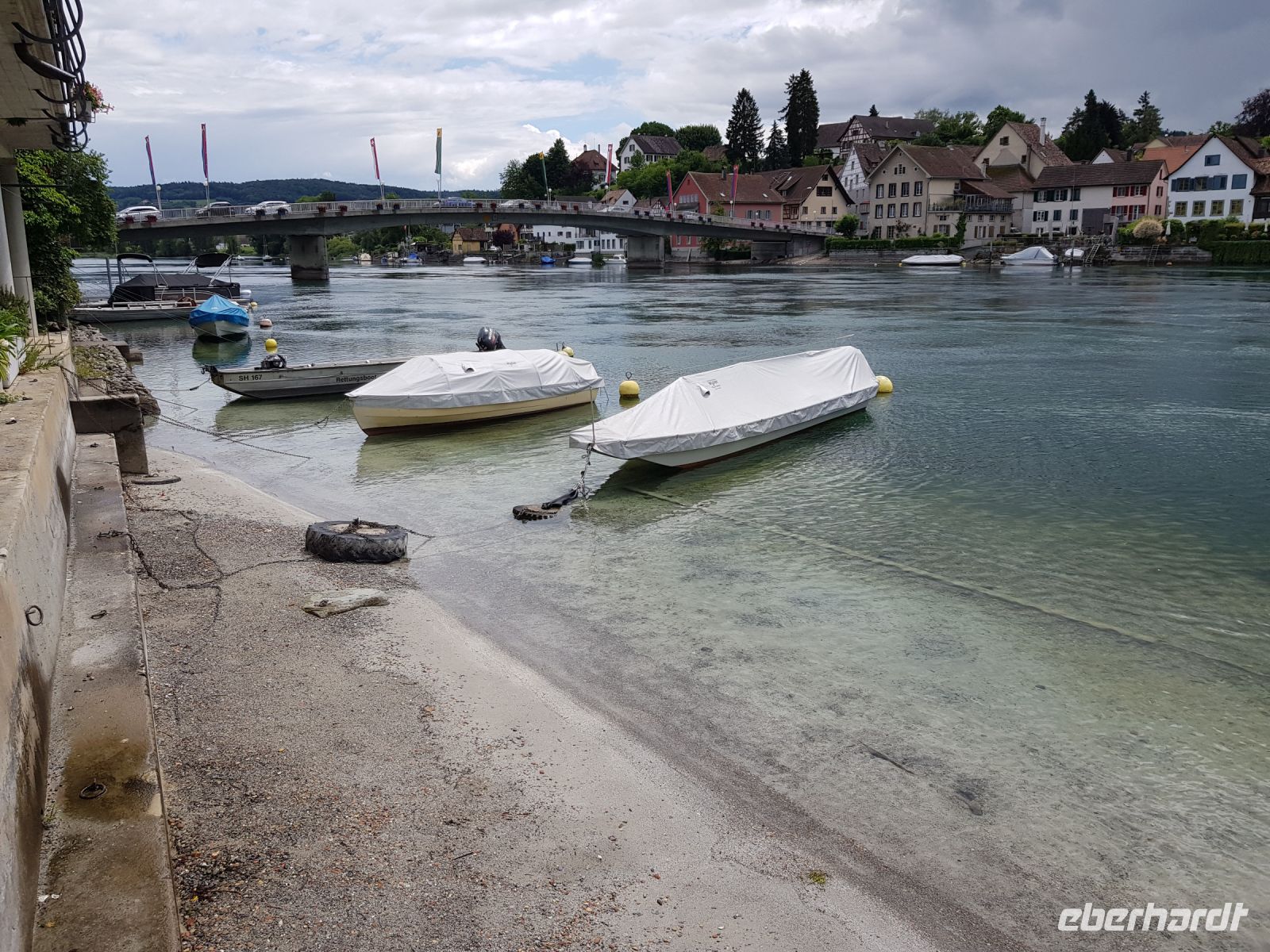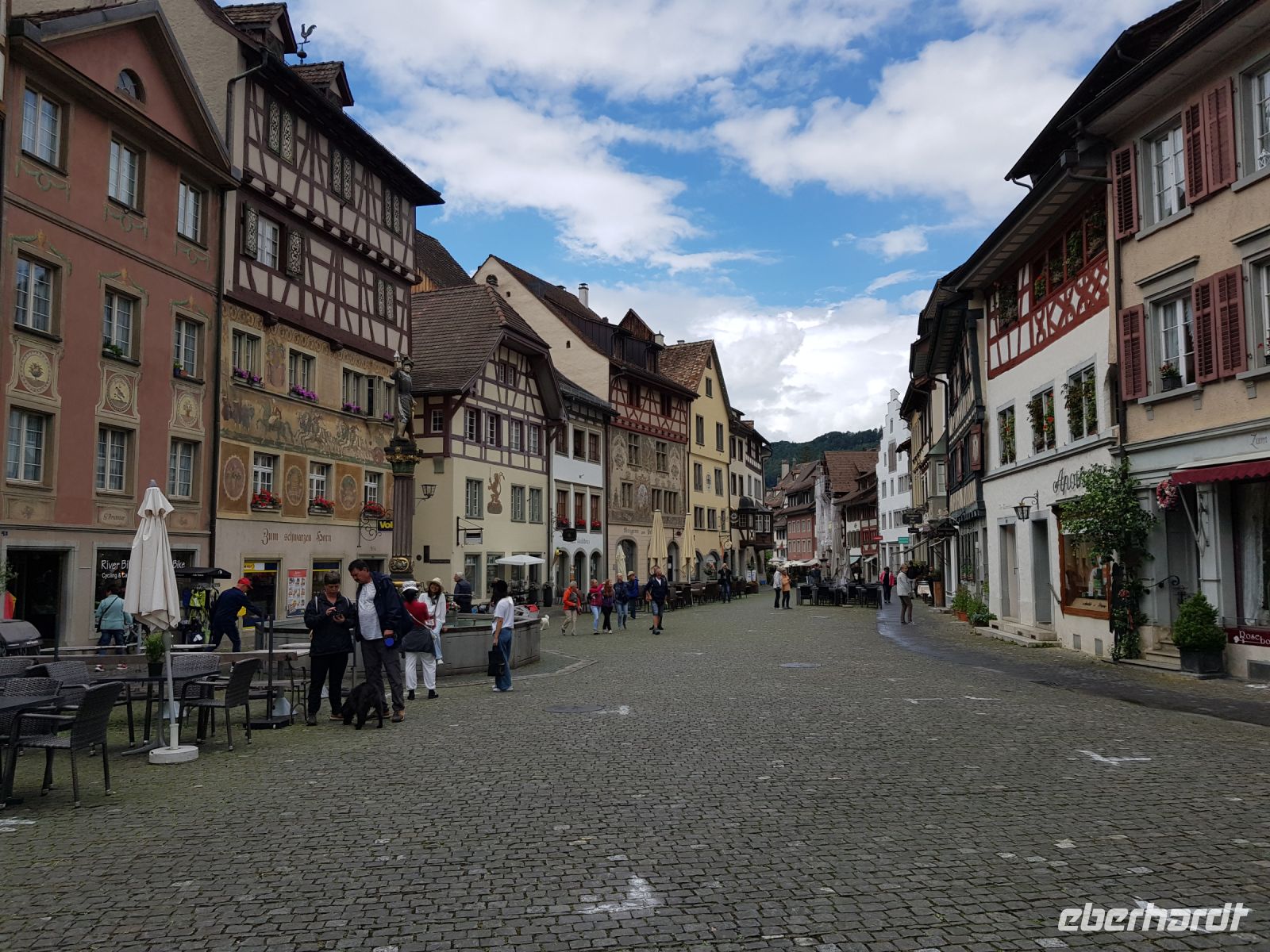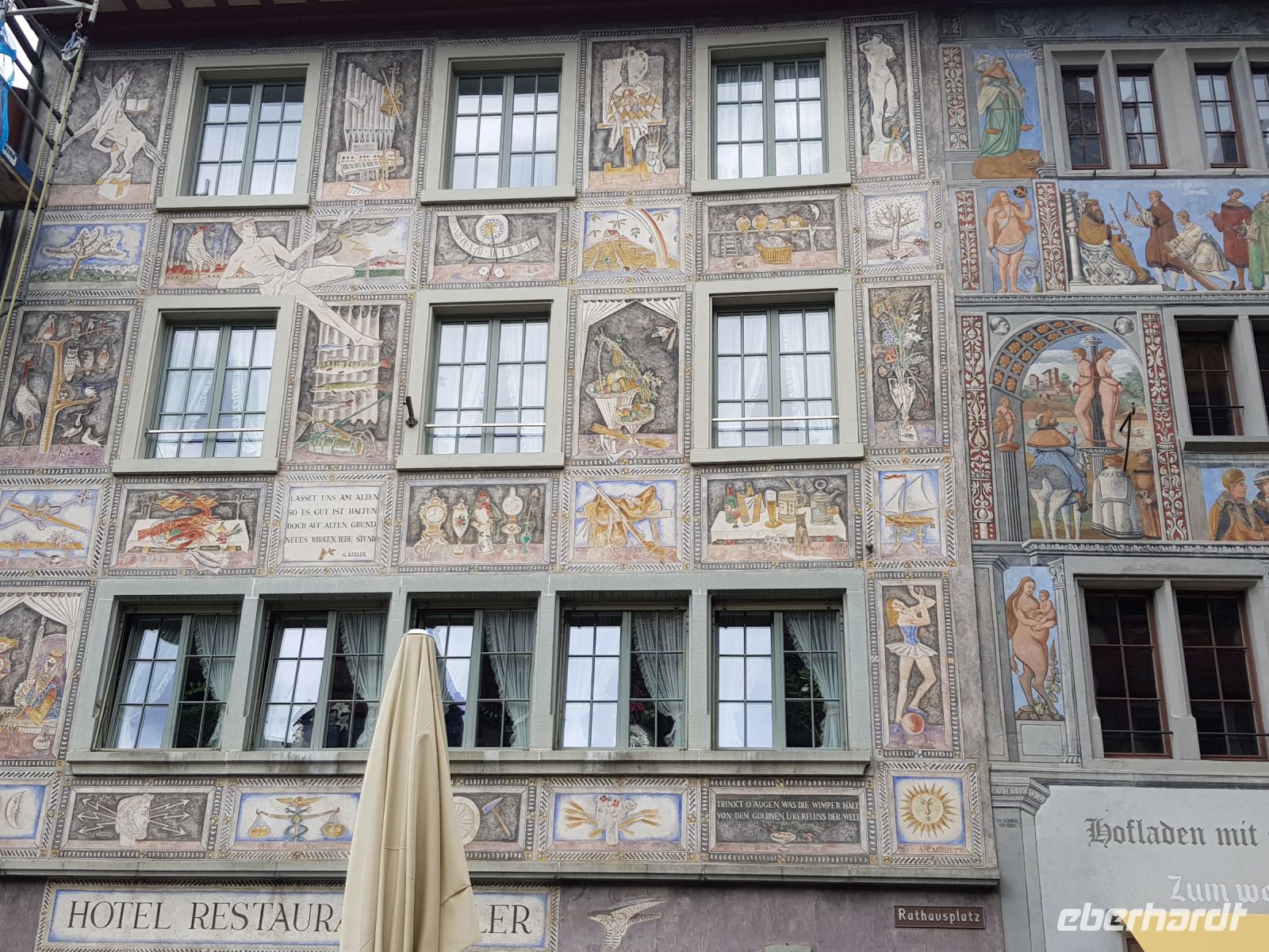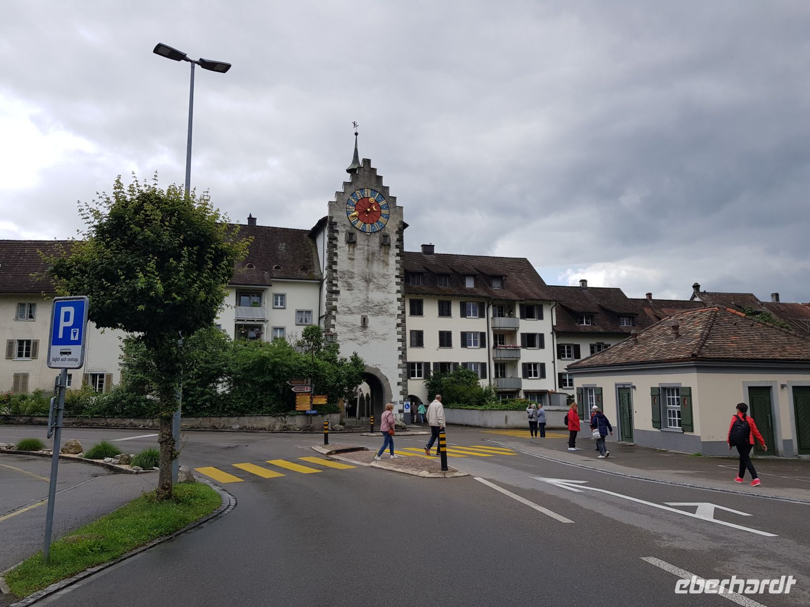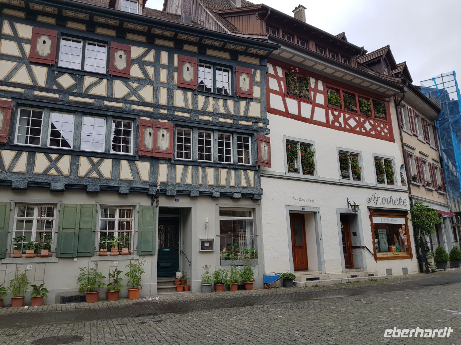 Wir starten wieder pünktlich 09:00 Uhr zu unserem Ausflug in den Hauptort des Schweizer Kantons - Schaffhausen - und werden auf der Fahrt sogar mit ein wenig Sonne verwöhnt. Das lässt uns hoffen, dass es an unserem ersten Ziel vielleicht nicht regnet. So hundertprozentig klappt das zwar nicht, erst mal werden wir wieder mit Regen empfangen, aber der hört auch wieder auf und der grösste Wasserfall Europas begrüsst uns mit einem imposanten Naturschauspiel: auf einer Breite von 150m und aus 23 m Höhe stürzen jede Sekunde 700 000 Liter Wasser tosend in das durch den charakistischen Felsen gekrönte Rheinfallbecken. Nach einerm 90 min. Aufenthalt steigen wir wieder in den Bus, der Rheinfall verabschiedet uns mit einem leichten Sonnenstrahl. Auf geht es in die nur 20 km entfernte Stadt Stein am Rhein. Sie zählt zu den wohl mit Abstand am besten erhaltenen mittelalterlichen Kleinstädten der Schweiz. Wir tauchen ein in ihre märchenhafte Idylle, bewundern die alten mit Fresken verzierten Häuser und bummeln am Ufer des Rheins zurück zum Stadttor, an dem unser Bus wartet. Das Fazit für diesen Tag: trotz Wolken und ein bißchen Regen war es ein wunderbarer Ausflug und im Hotel geniessen wir unser Abendessen: es geht flüssiger bei der Servierung der 4 Gänge voran und es ist nicht mehr ganz so laut.