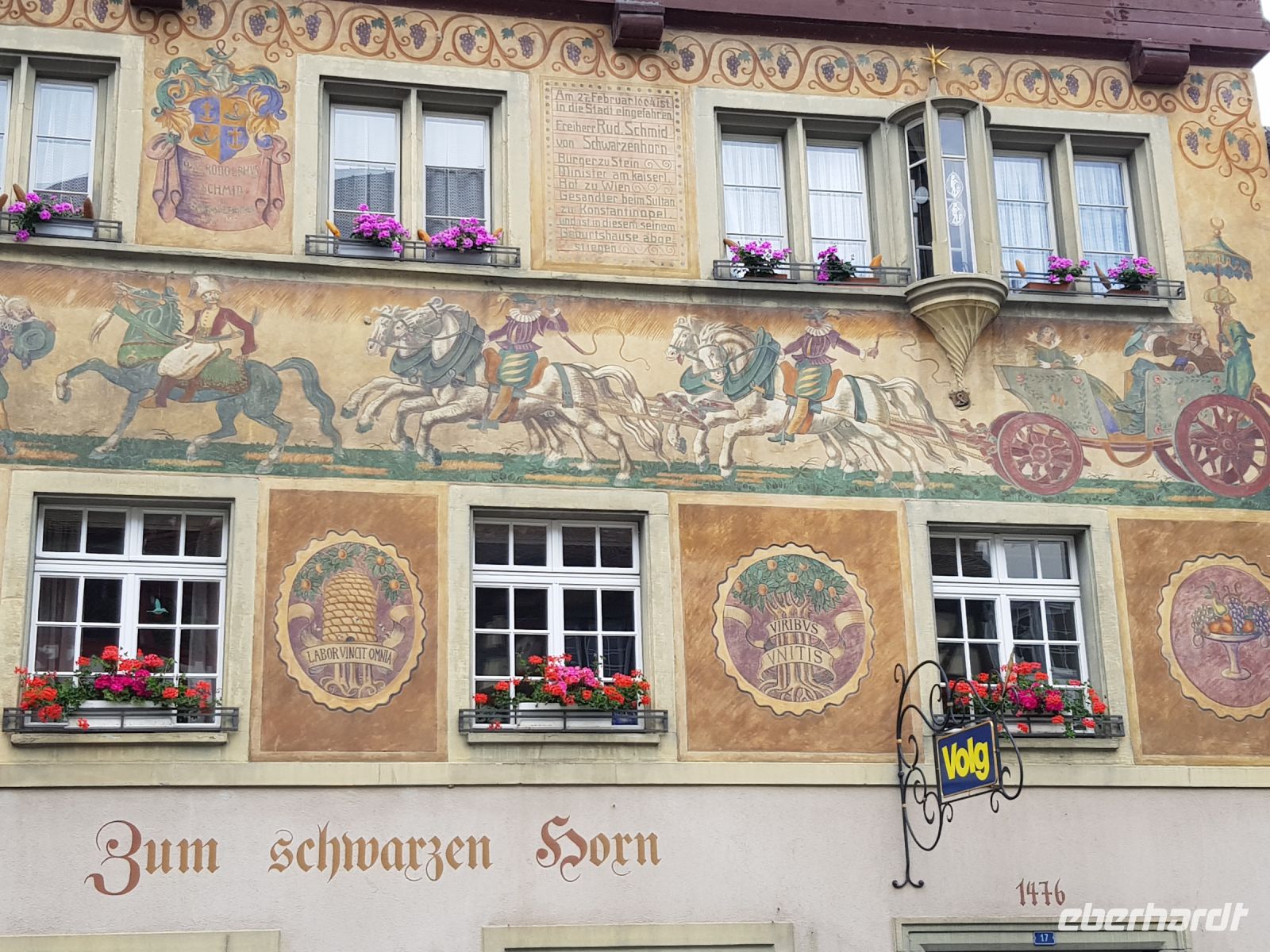 Wir starten pünktlich 06 Uhr von unserem 1.Treffpunkt am Flughafen Dresden und hoffen, dass sich die km langen Staus von der Nacht aufgelöst haben. Es ist der 1.Tag nach Pfingsten und die Brummi-Fahrer sind froh wieder starten zu können. Sie wollen pünktlich ihr Ziel erreichen. WIR ABER AUCH! Der 1.Stau bei Wilsdruff ist in Bewegung und wir kommen mit 15 min. Verspätung sowohl am Treffpunkt in Hainichen als auch im Chemnitz-Center an. Der letzte Treffpunkt ist an der Raststelle Vogtland, aber ein Stau von Zwickau bis Reichenbach - angesagte 2 h Verspätung - haben wir schon auf dem Plan und überlegen, da bestätigt ein Anruf von Eberhardt-Travel die missliche Lage, aber sowohl der Busfahrer als auch die Reiseleiterin sind in dieser Gegend zuhause und können den Stau erfolgreich umfahren, so dass die letzten Reisenden 45 min. später an Bord kommen. Jetzt geht es richtig los! HERZLICH WILLKOMMEN! Wir haben eine schöne Reise vor uns und freuen uns auf den Bodensee mit seinen von Eberhardt-Travel ausgesuchten tollen Ausflügen. Trotz weiterer Staus auf den Autobahnen und einigen Regengüsse kommen wir gegen 16:30 Uhr im Hotel "LAMM" an. Nach dem Abendessen ( 4-Gänge-Menü - Dauer 3 Stunden),