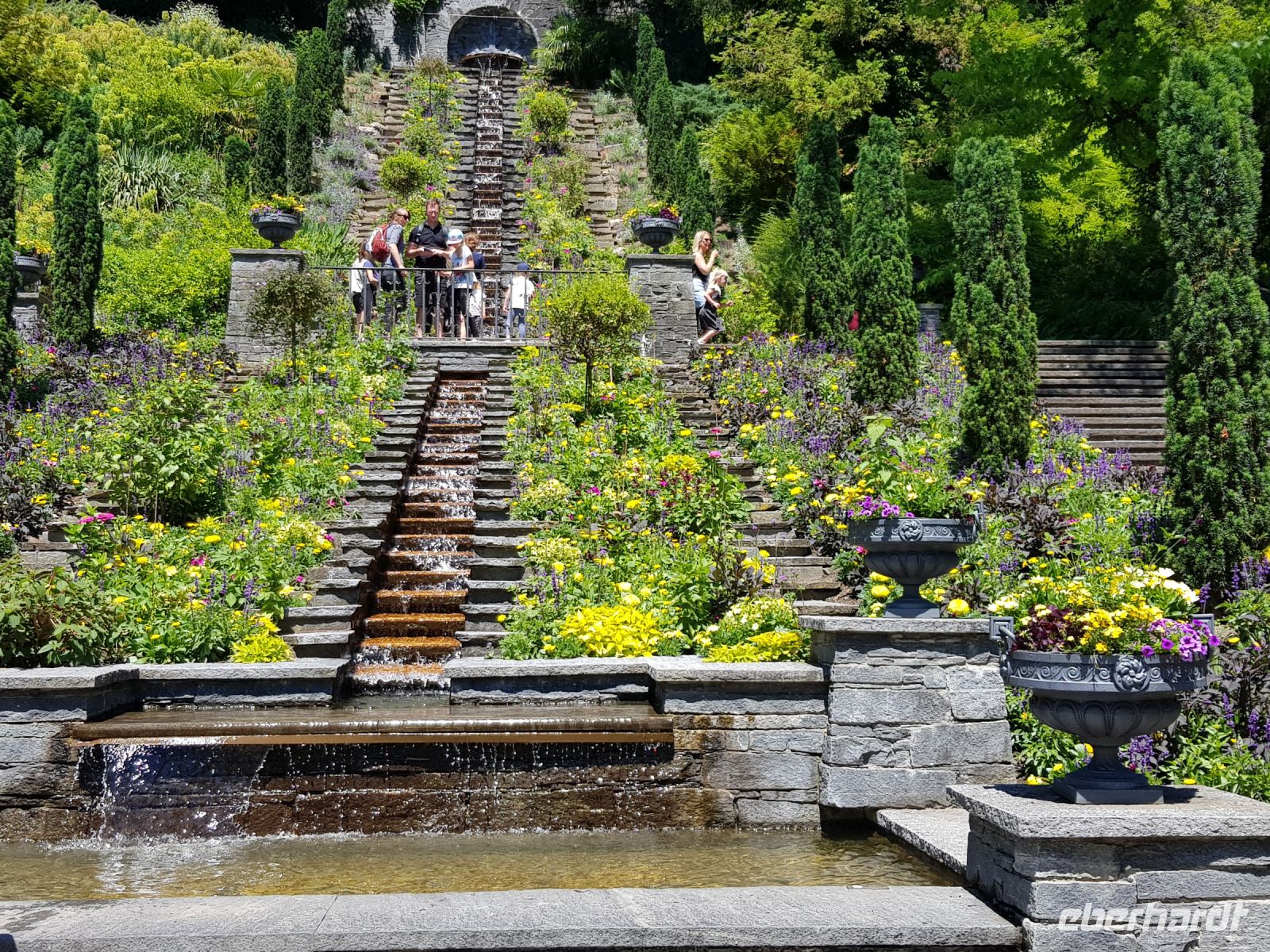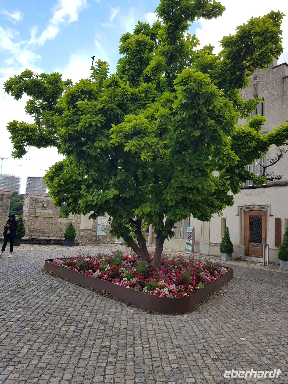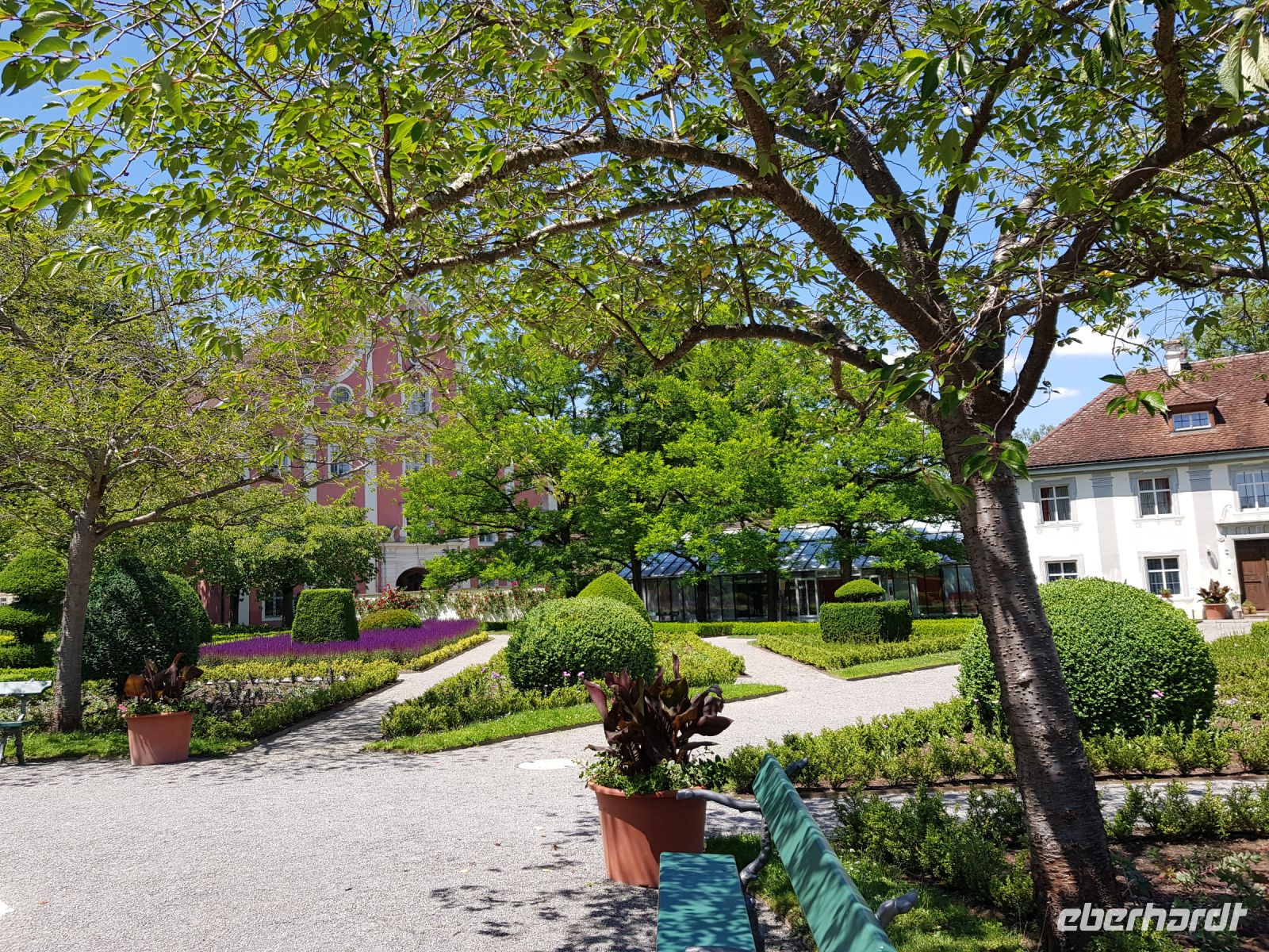 Unser heutiges Ausflugsziel ist die Blumeninsel Mainau. Sie ist mit etwa 45 Hektar die drittgrösste Insel im Bodensee. 1974 brachten Gräfin Sonja und Graf Lennart die gesamte Insel in die Mainau GmbH ein, deren Hauptanteilseigner die gemeinnützige Lennart-Bernadotte-Stiftung ist. Erster Blick am frühen Morgen aus dem Fenster: und eine bange Frage: Scheint die Sonne? JA !!! Zwar noch etwas matt, aber es wird immer besser. Als wir wie immer 09:00 Uhr mit dem Bus losfahren, zeigt die Sonne, was sie kann. HERRLICH! Das haben wir uns gewünscht, bei bestem Wetter auf der Blumeninsel zu weilen. Wir kommen nach reichlich 90 min. Busfahrt durch kleine Orte mit viel Kreisverkehr auf dem Parkplatz unmittelbar vor der Insel an. Nachdem alle ihre Eintrittskarten erhalten haben, geht die Erkundung der Insel los, Jeder wie er mag.