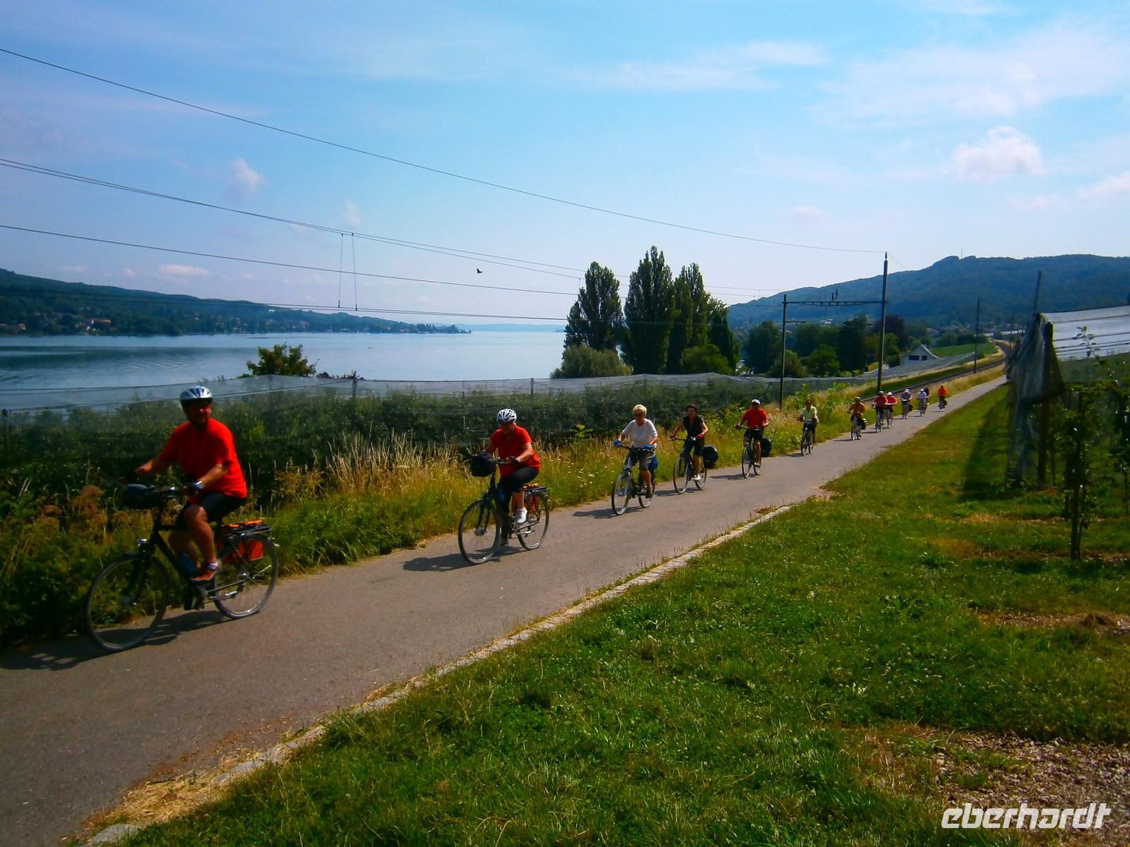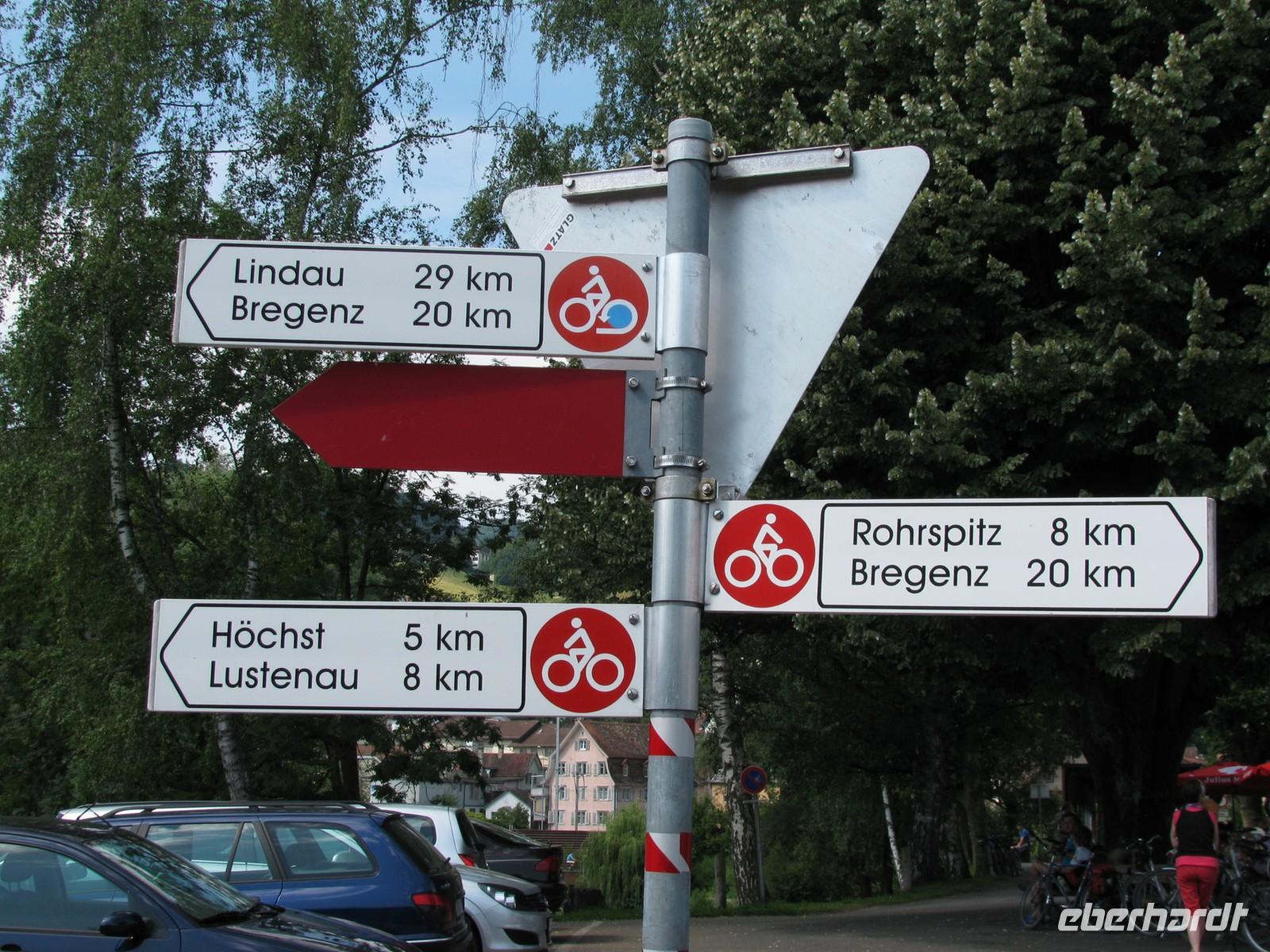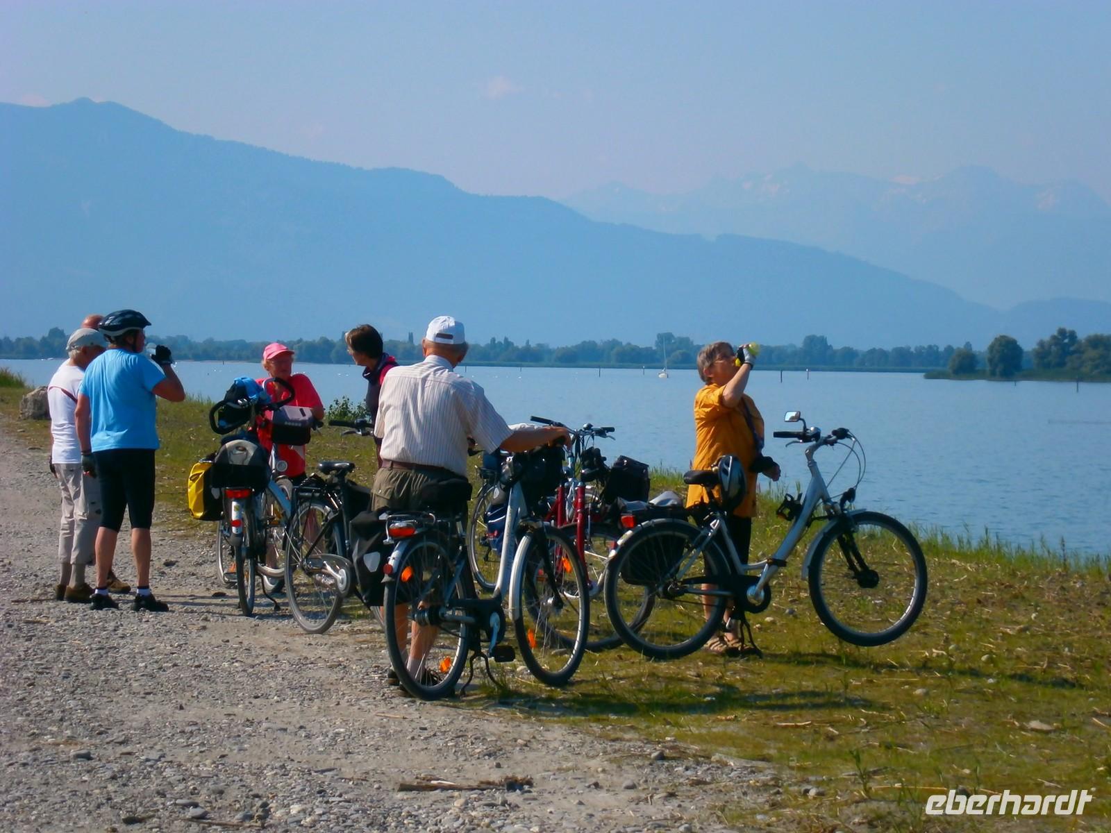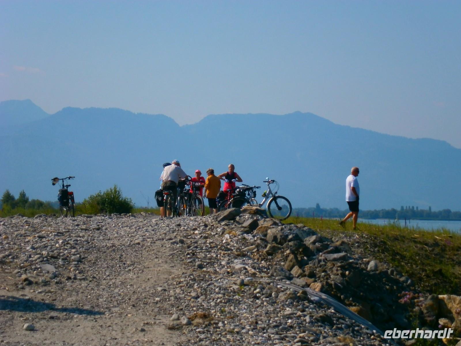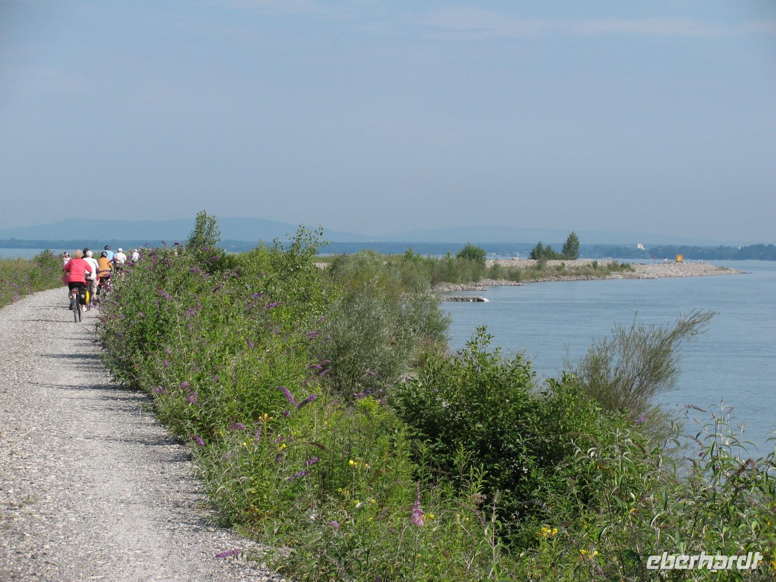Heute ging es wieder über die Grenze. Denn die 72 Kilometer österreichisches Bodenseeufer waren schnell abgeradelt. Also, auf zu den Schweizern. Aber zuerst machten wir einen kleinen Extraschlenker und radelten am Damm des Rheinzuflusses bis vor an die Spitze. Der Weg hatte sich gelohnt, denn der Blick auf den Bodensee und hinüber zum entfernten Ufer war einmalig. Danach eben dann über die Grenze in das Land, in dem jedes zweite Wort auf „i“ endet. Entlang von Bächlis und Schlösslis ging es übers Wegli beim Bäckerli vorbei zum Mittagspäusli. Oh, war das leckerli!
