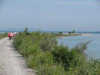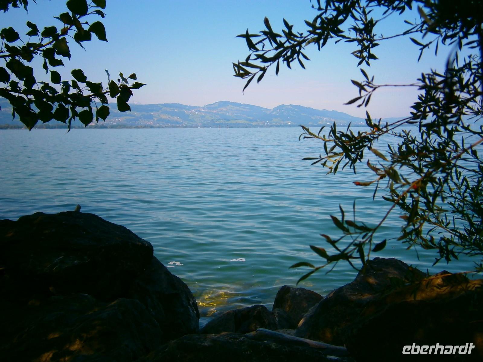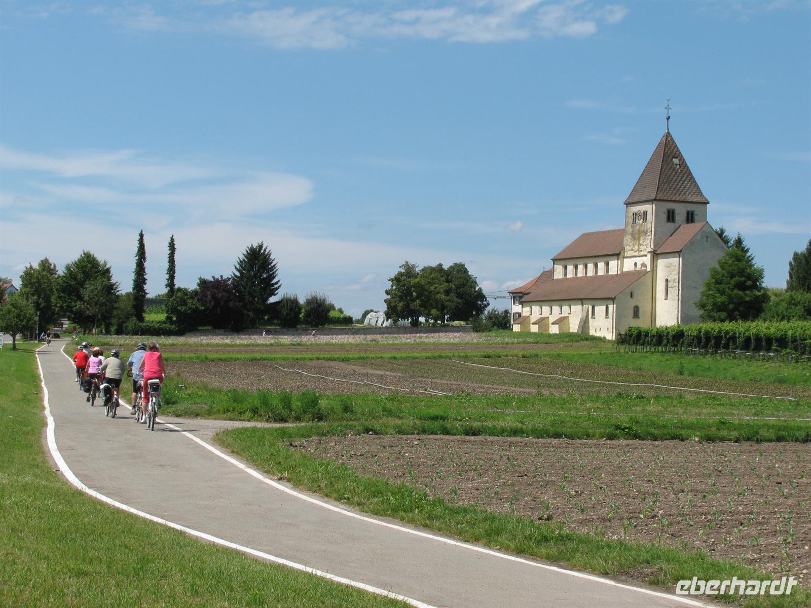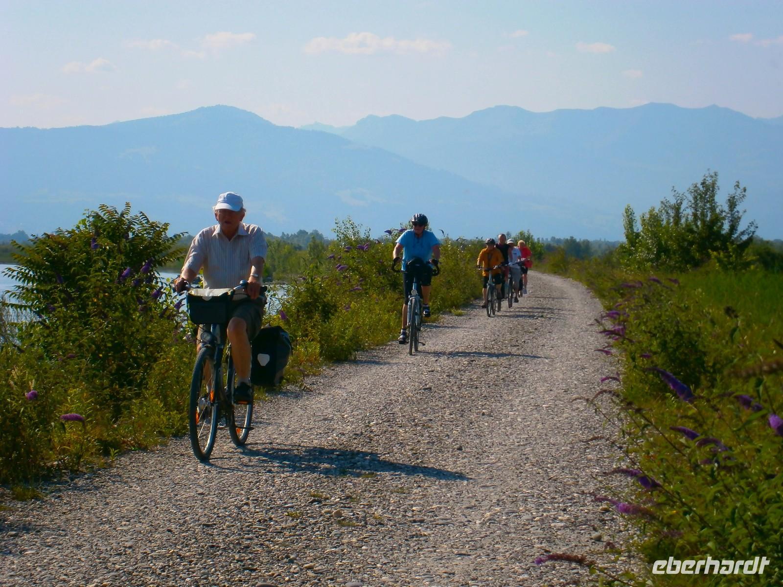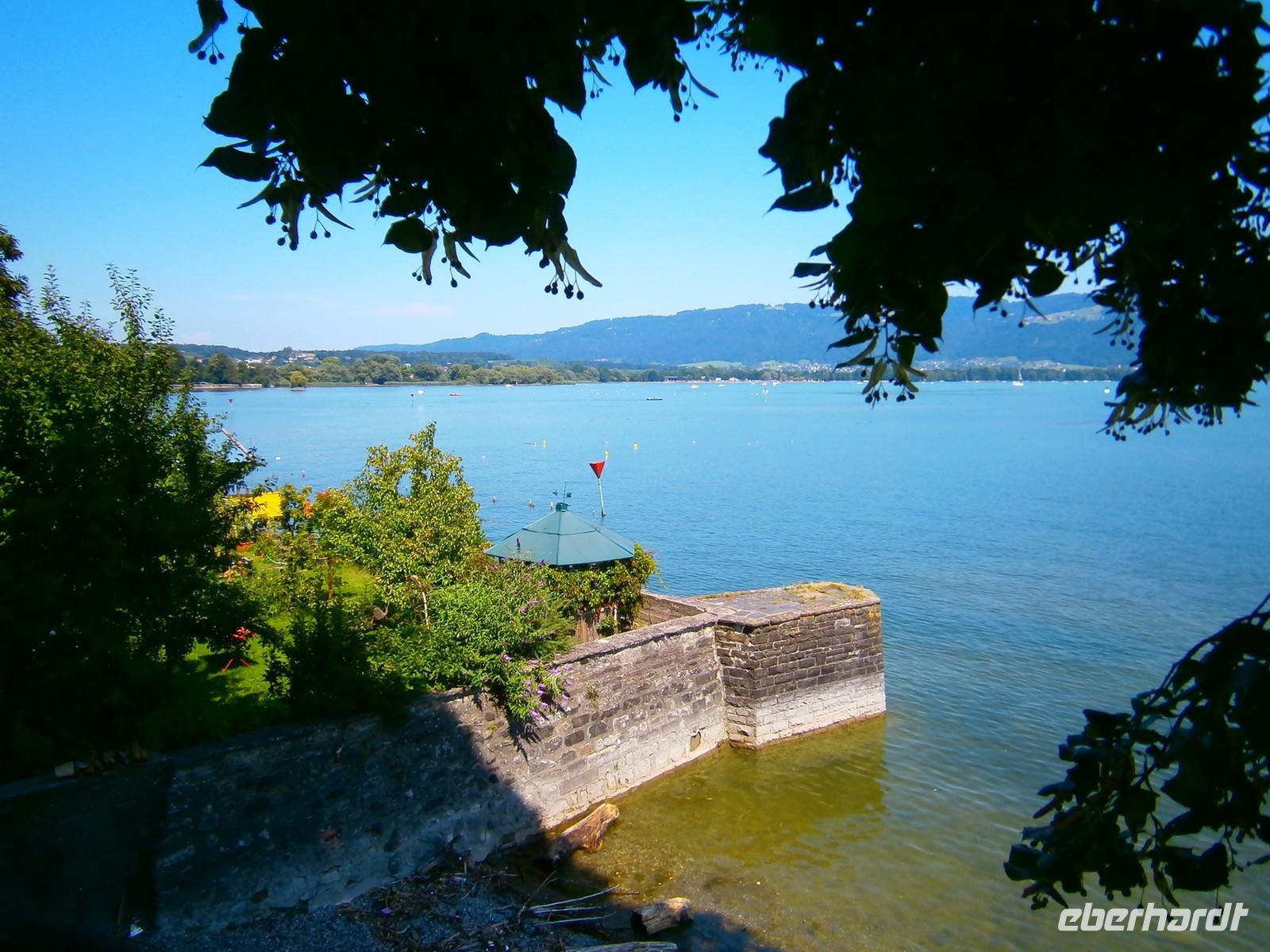 Heute ging es wieder über die Grenze. Denn die 72 Kilometer österreichisches Bodenseeufer waren schnell abgeradelt. Also, auf zu den Schweizern. Aber zuerst machten wir einen kleinen Extraschlenker und radelten am Damm des Rheinzuflusses bis vor an die Spitze. Der Weg hatte sich gelohnt, denn der Blick auf den Bodensee und hinüber zum entfernten Ufer war einmalig. Danach eben dann über die Grenze in das Land, in dem jedes zweite Wort auf „i“ endet. Entlang von Bächlis und Schlösslis ging es übers Wegli beim Bäckerli vorbei zum Mittagspäusli. Oh, war das leckerli!
