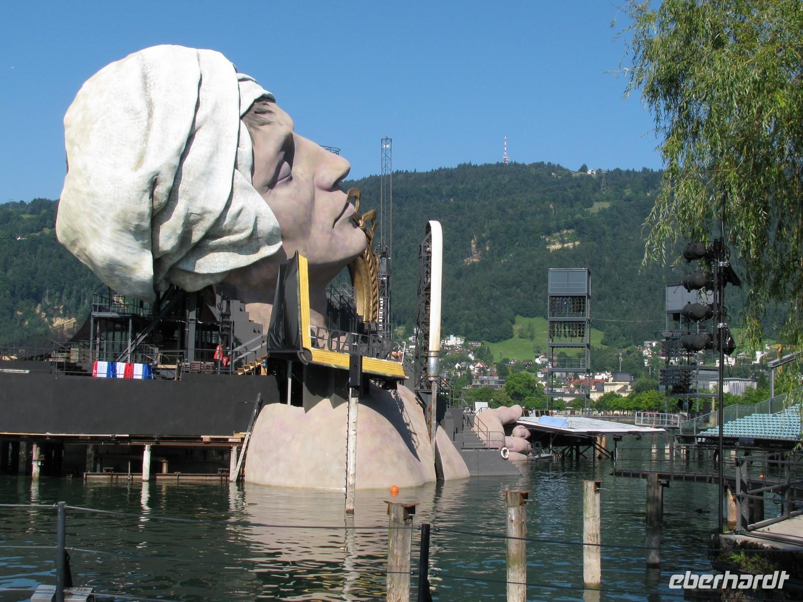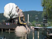 Bevor wir ins Hotel fuhren, besichtigten wir natürlich noch die Bregenzer Seebühne - gerade im Aufbau kümmerte es niemanden, dass da eine Radgruppe plötzlich bis in die Besuchertribüne lief und Fotos machte. Und so fühlten wir uns fast wie Statisten in einem Theaterspiel, auch wenn die Aufführungen erst in ein paar Wochen starten werden.