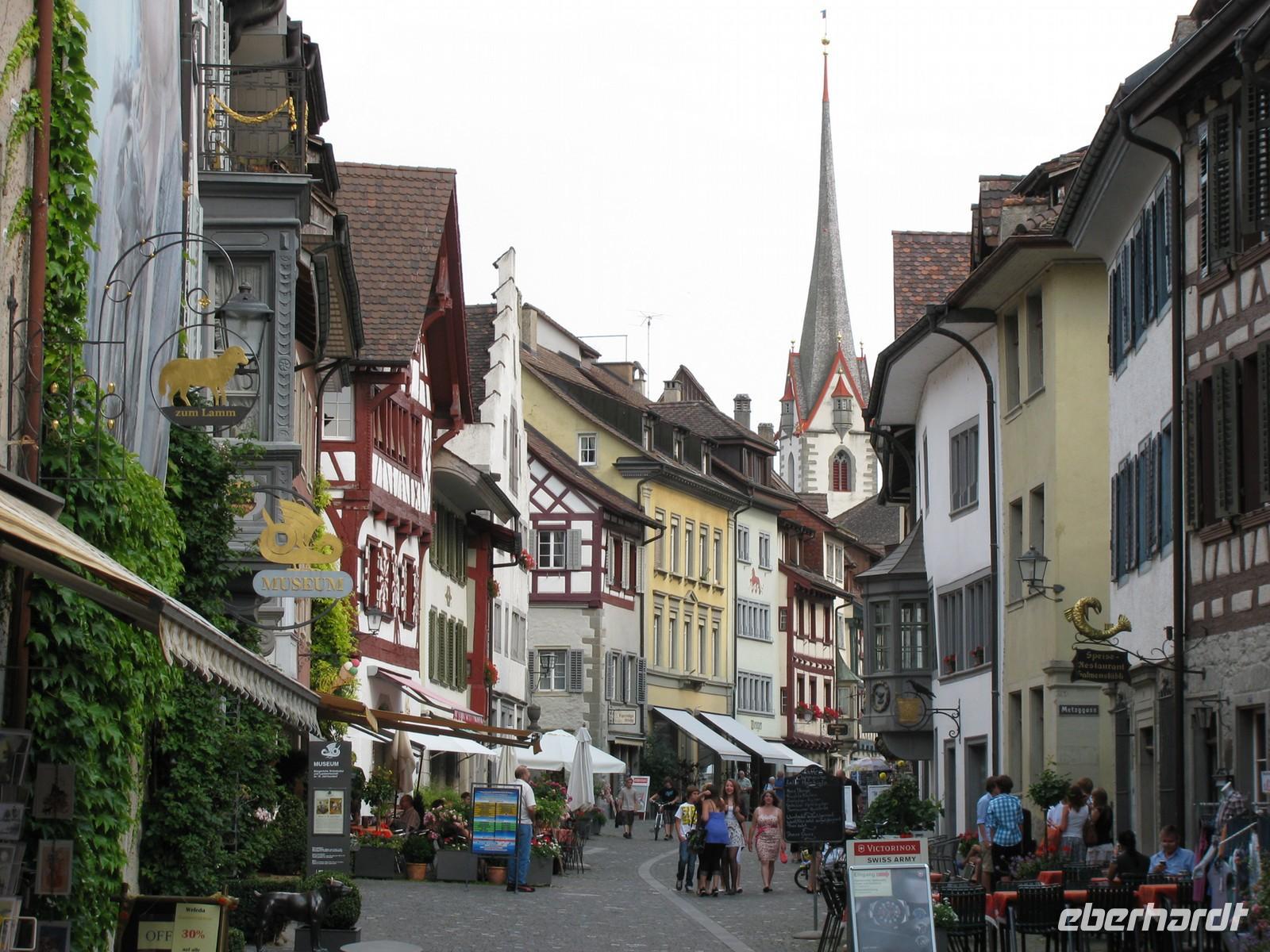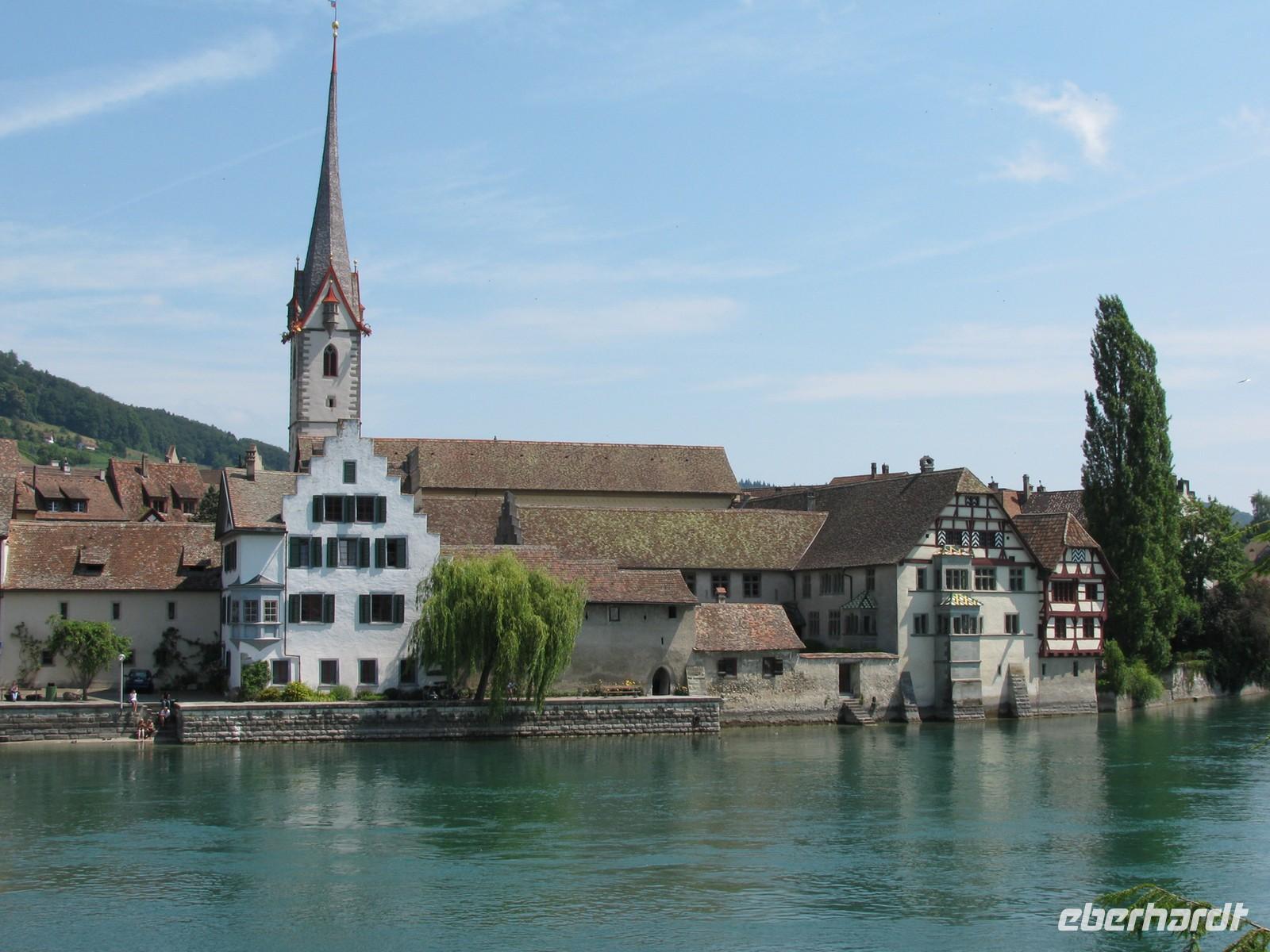 Nach dem Frühstück starteten wir mit dem Rad in Richtung Kreuzlingen. Eigentlich sollten wir ja das nächste Stück der Strecke mit dem Bus fahren, aber lieber starteten wir etwas eher und können so stolz behaupten, dass wir den Bodensee einmal komplett umfahren haben. In Kreuzlingen verließen wir den Obersee und bogen ab zum Untersee. Mit Blick auf die Kloster-Insel Reichenau ging es immer entlang des Ufers auf und ab in Richtung Stein am Rhein. In Ermatingen pausierten wir direkt am Seeufer im Stadtpark und genossen die malerische Aussicht auf den Bodensee.
