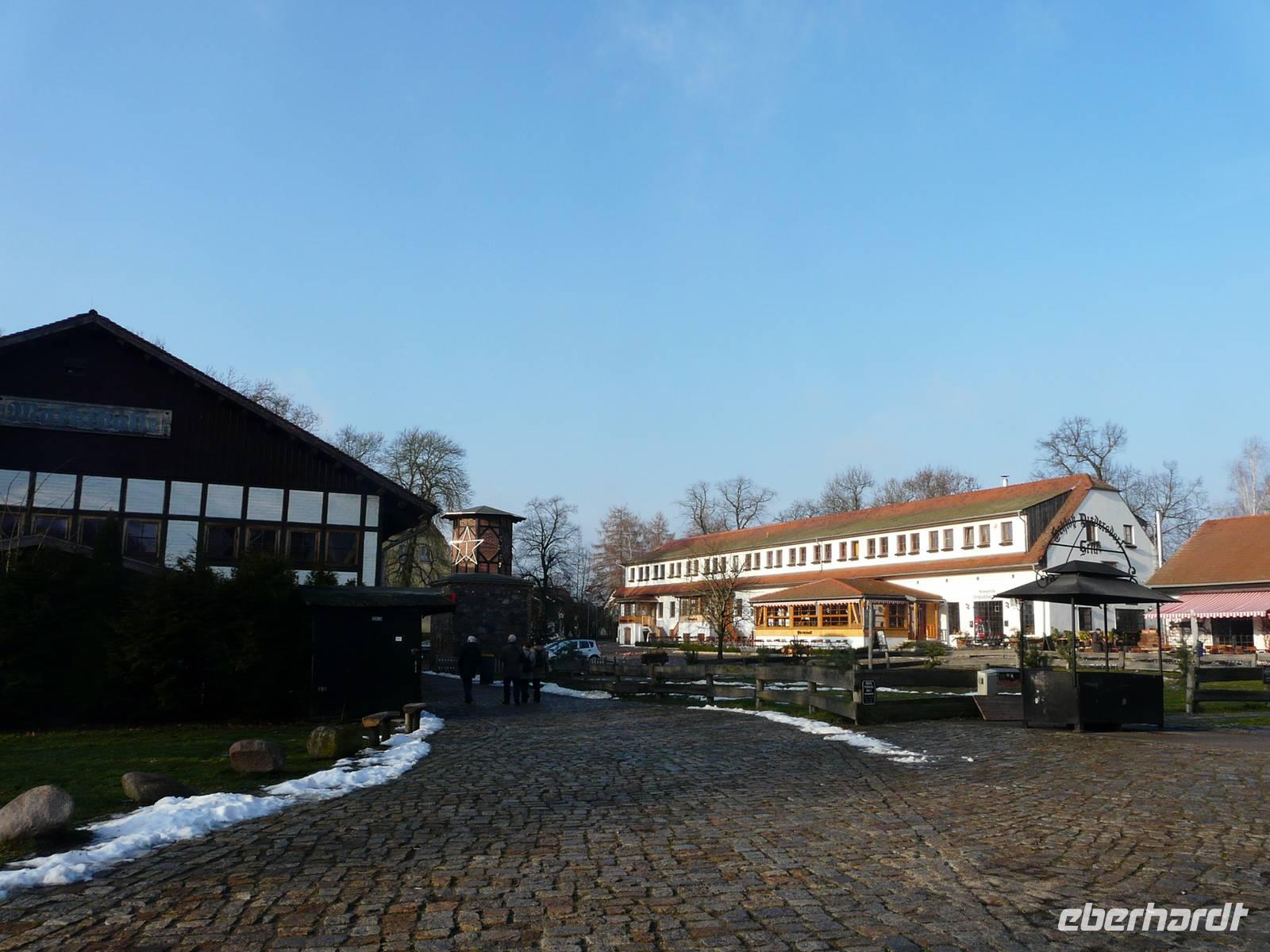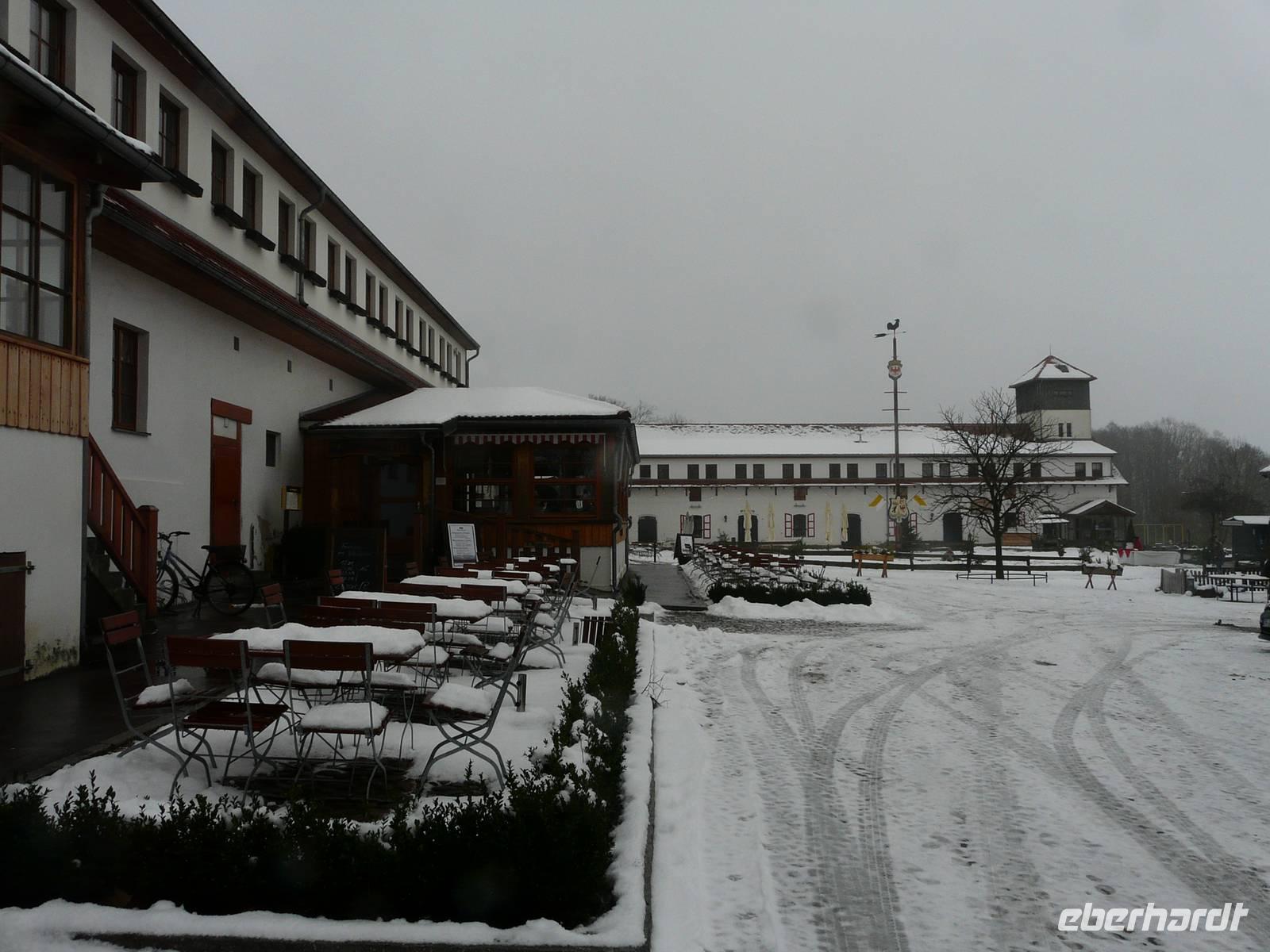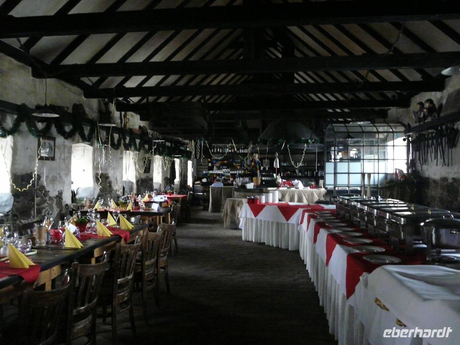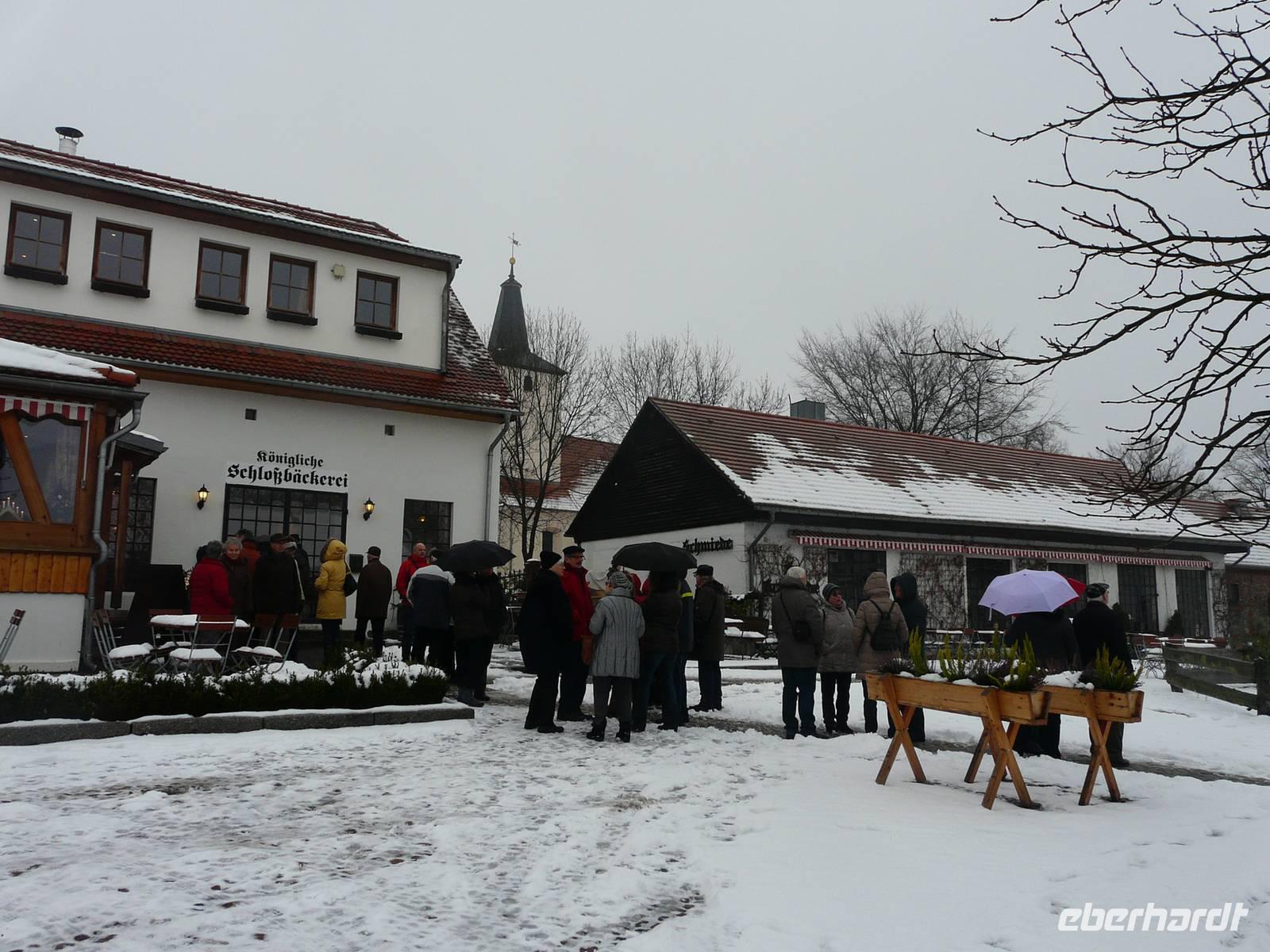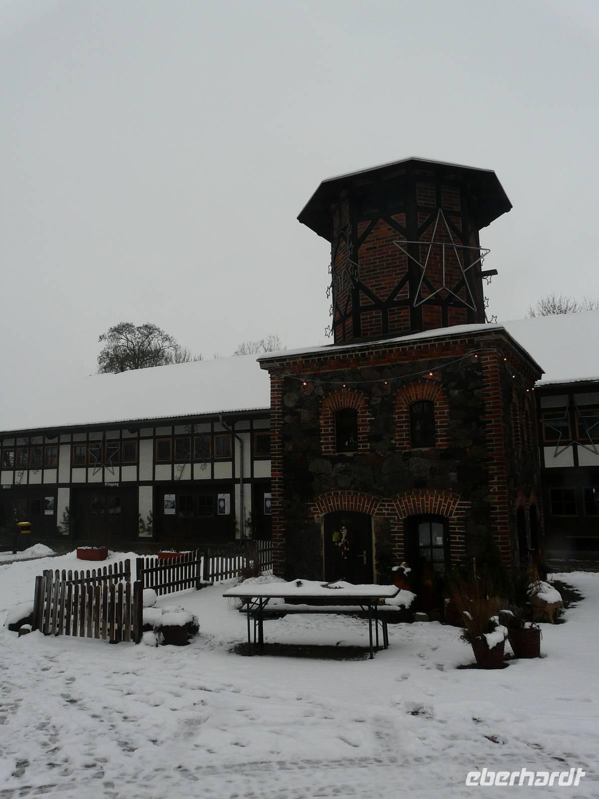 Nach einem ausgedehnten Frühstück, und leider nicht so schönem Wetter, trafen wir Geschäftsführer Herrn Schröder auf dem Gutshof. Ein kleiner Rundgang über das Gelände erwartete uns. So bekamen wir die Gelegenheit in die unterschiedlichen Veranstaltungsräume hineinzuschauen und zugleich die verschiedenen Silvesterdekorationen anzusehen. Nach einer Verkostung in der hauseigenen Brennerei, freuten wir uns auf die bevorstehende Schlittenfahrt. Doch kurz vor Beginn, machte uns das Wetter einen Strich durch die Rechnung. Aufgrund des starken Tauwetters konnte weder der bereits vorbereitete Schlitten noch eine Kutsche fahren. Nichts desto trotz, wärmten wir uns bei einem gemütlichen Lagerfeuer und einer Tasse Glühwein auf. Hinzukommend gab es für uns als kleine Eberhardt-Überraschung, einen Imbiss mit hausgemachter Leberwurst und Schmalz auf Landbrot aus der hauseigenen Schlossbäckerei.