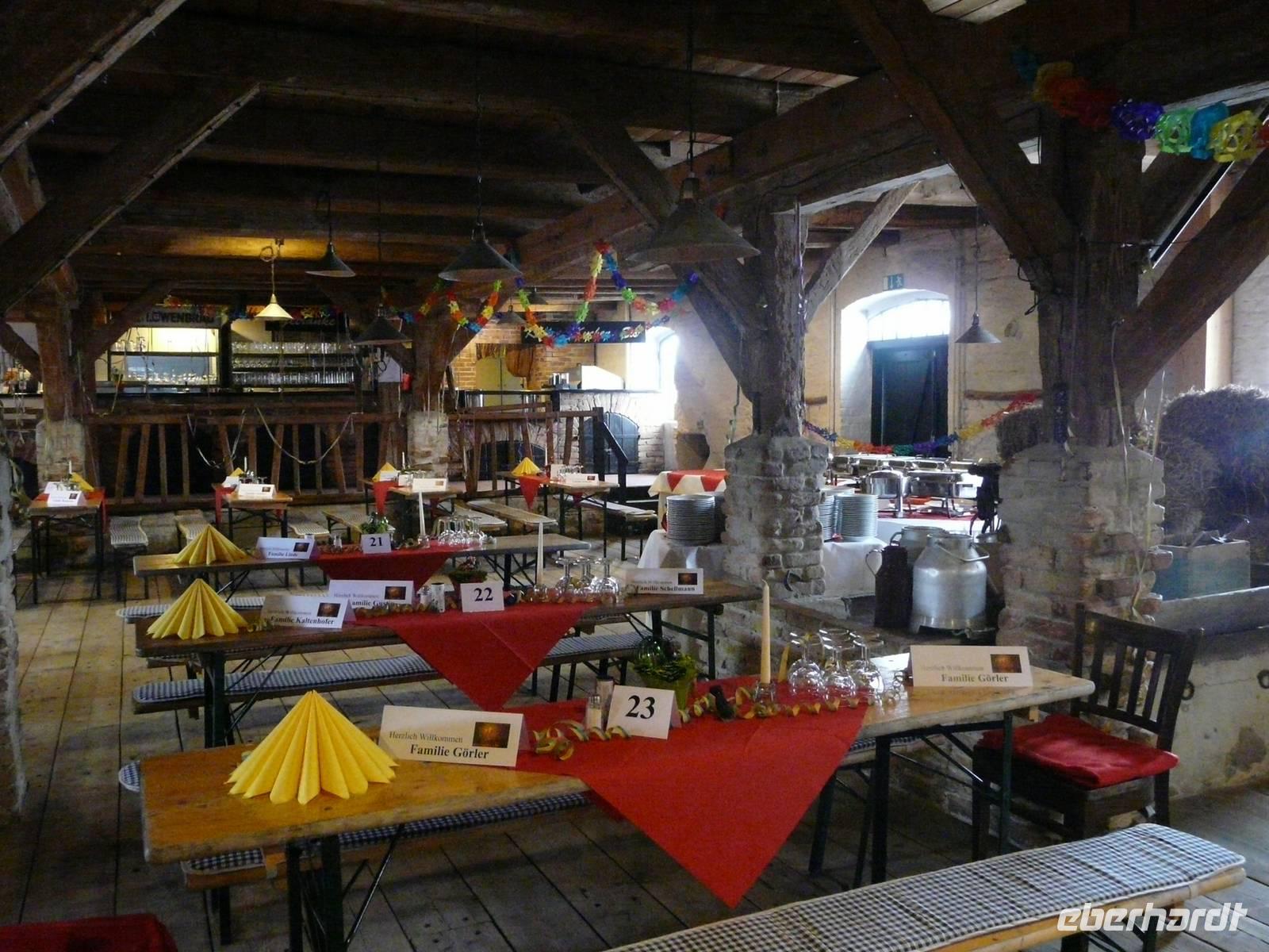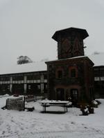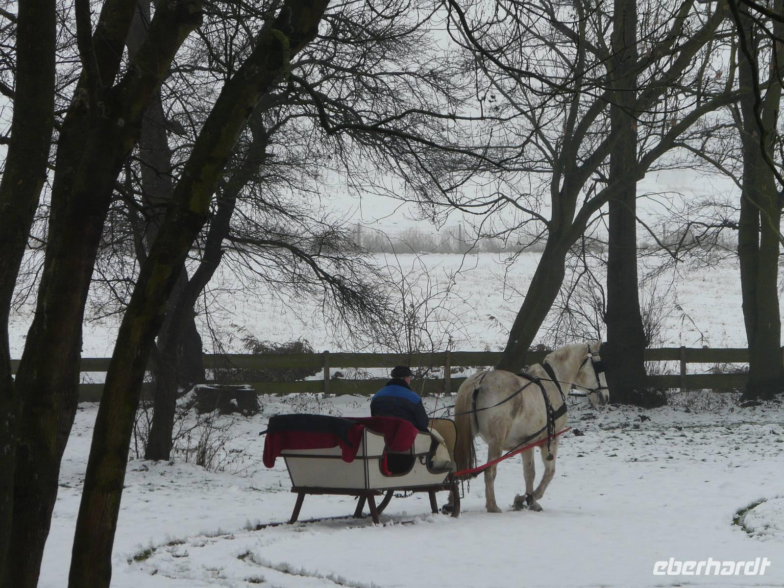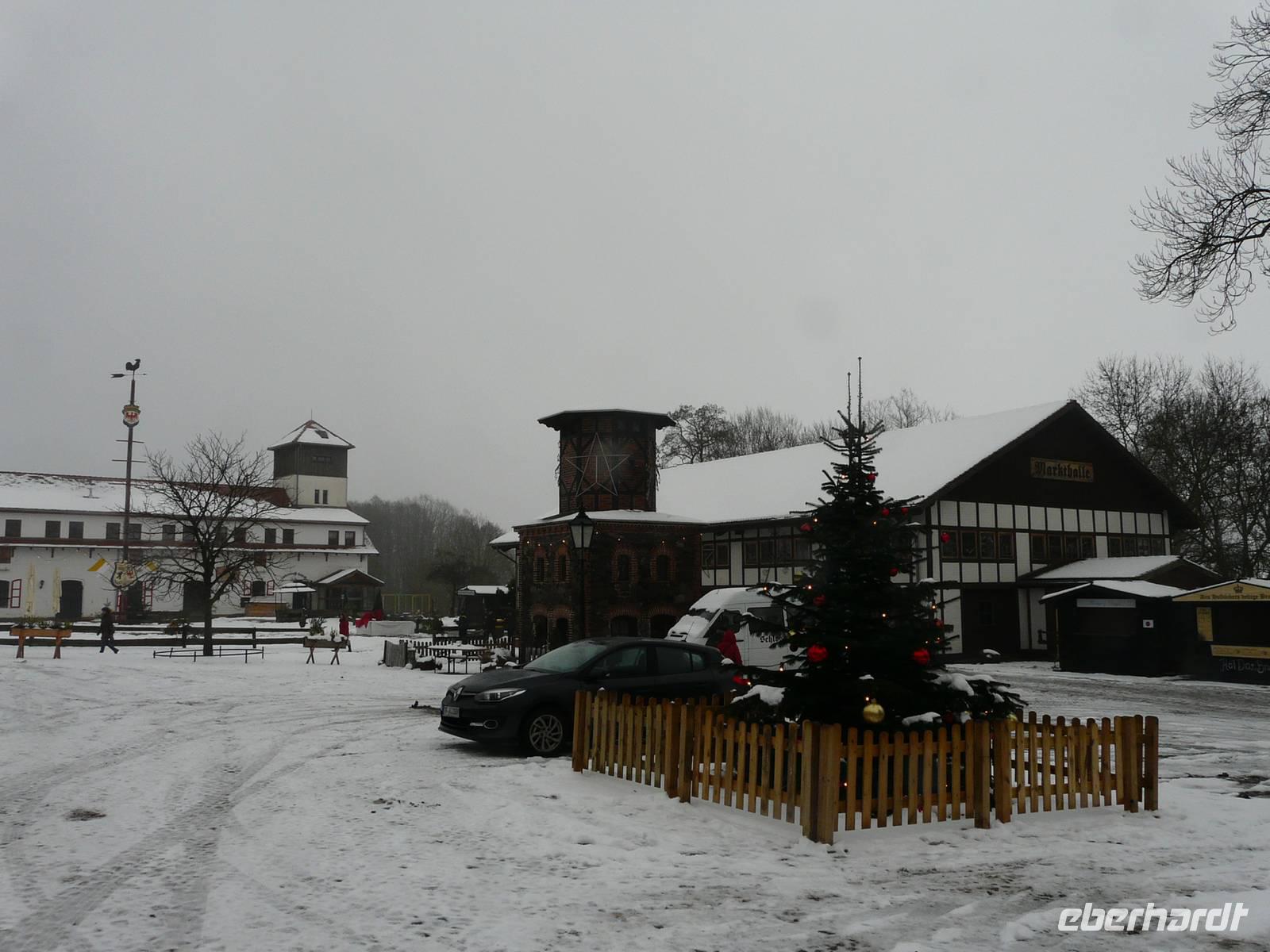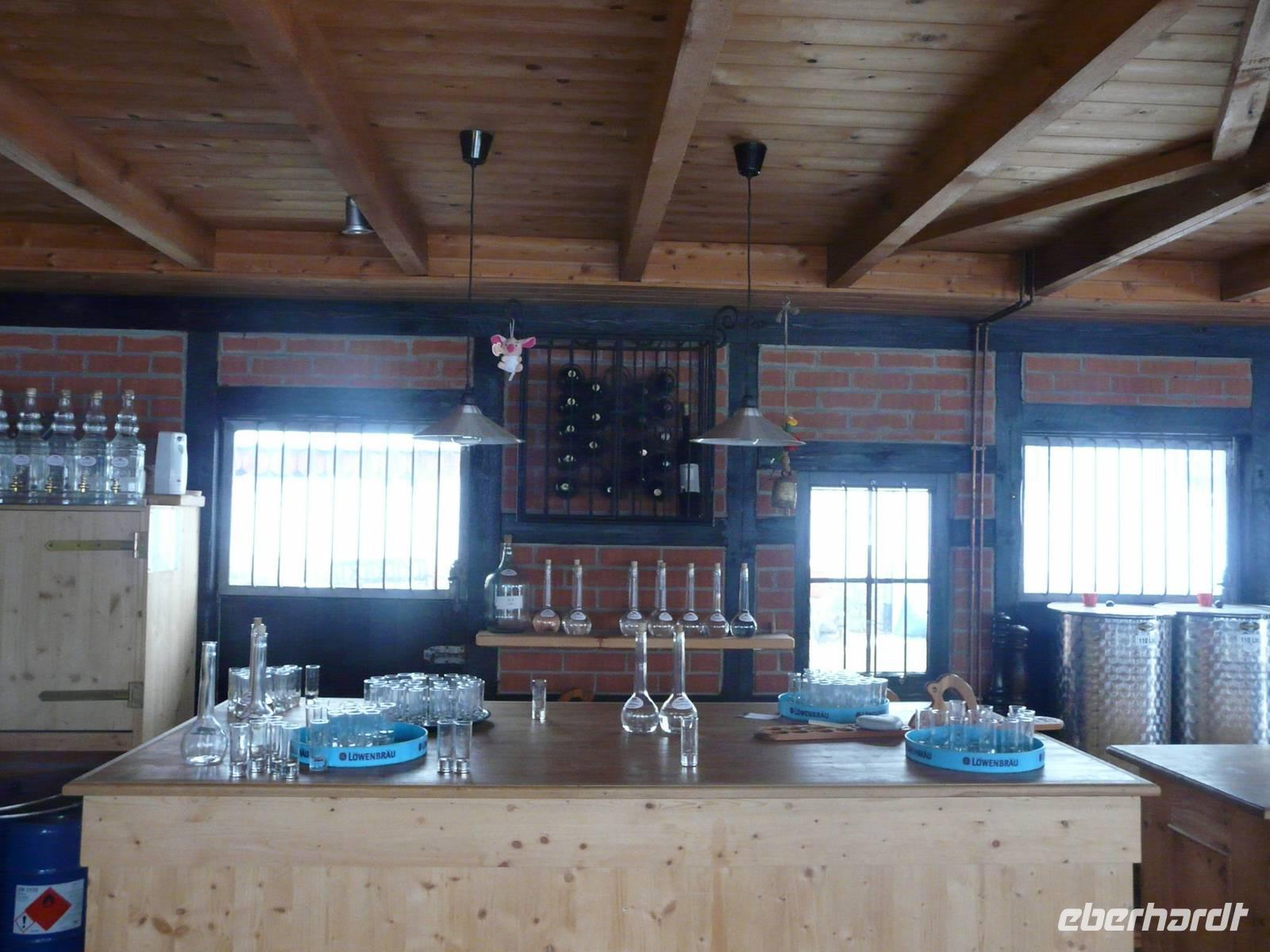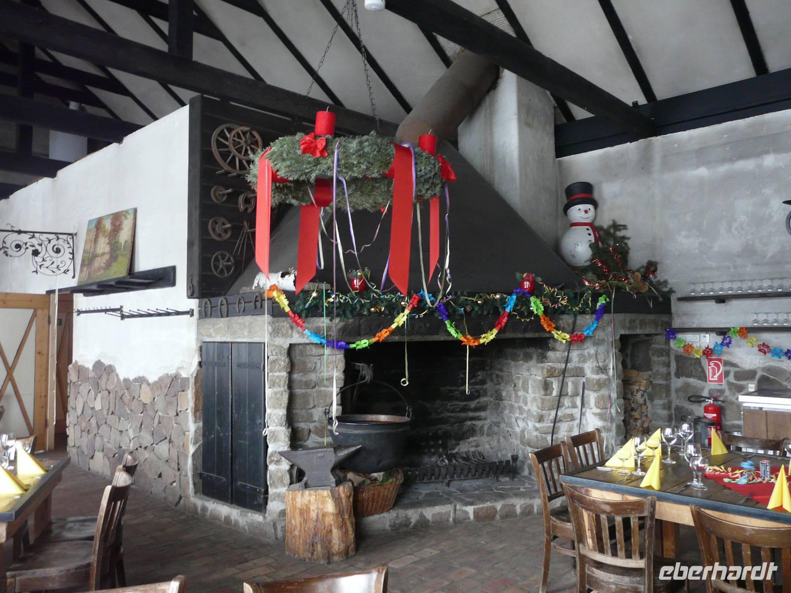 Nach einem ausgedehnten Frühstück, und leider nicht so schönem Wetter, trafen wir Geschäftsführer Herrn Schröder auf dem Gutshof. Ein kleiner Rundgang über das Gelände erwartete uns. So bekamen wir die Gelegenheit in die unterschiedlichen Veranstaltungsräume hineinzuschauen und zugleich die verschiedenen Silvesterdekorationen anzusehen. Nach einer Verkostung in der hauseigenen Brennerei, freuten wir uns auf die bevorstehende Schlittenfahrt. Doch kurz vor Beginn, machte uns das Wetter einen Strich durch die Rechnung. Aufgrund des starken Tauwetters konnte weder der bereits vorbereitete Schlitten noch eine Kutsche fahren. Nichts desto trotz, wärmten wir uns bei einem gemütlichen Lagerfeuer und einer Tasse Glühwein auf. Hinzukommend gab es für uns als kleine Eberhardt-Überraschung, einen Imbiss mit hausgemachter Leberwurst und Schmalz auf Landbrot aus der hauseigenen Schlossbäckerei.