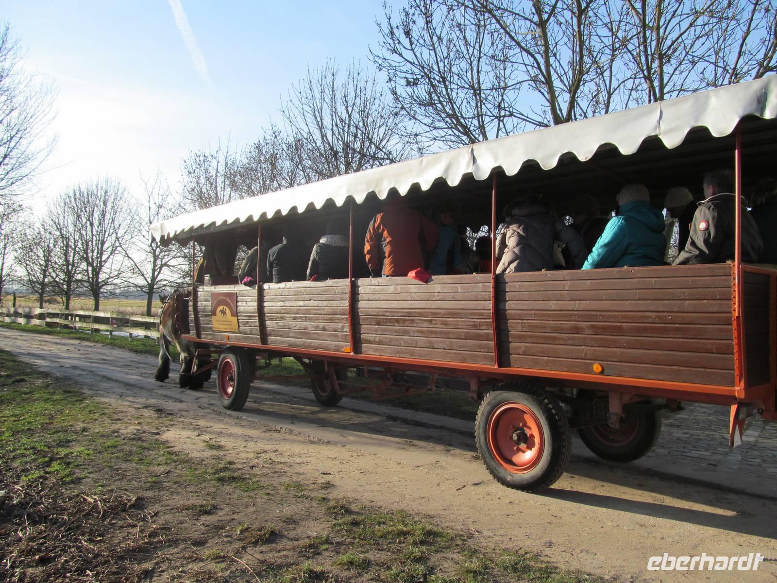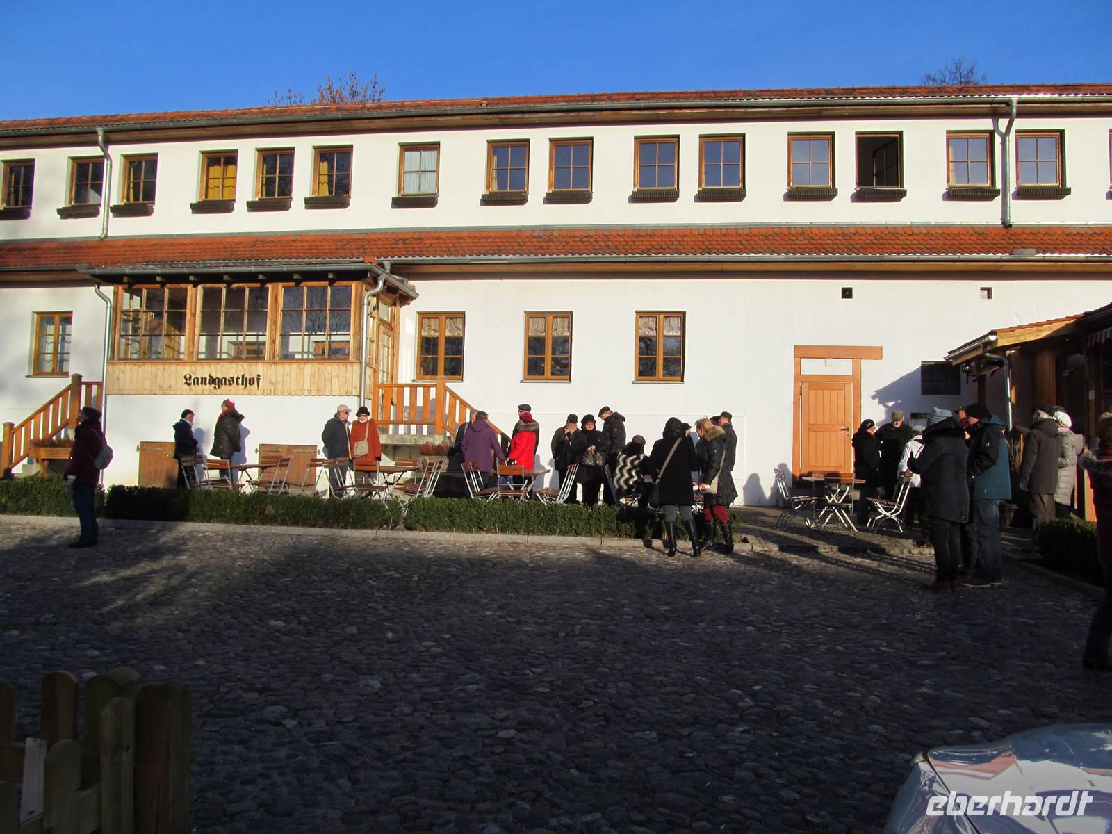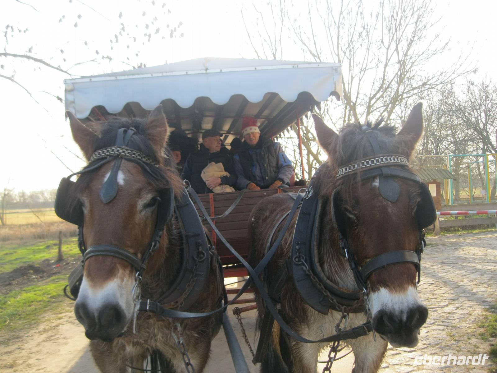 Nachdem wir uns an dem reichhaltigen Frühstücksbuffet bedient hatten, stand der Tag ganz im Zeichen des Schloss Diedersdorf. Bereits vormittags wurden wir von zwei Mitarbeitern des Hauses, in zwei Gruppen über das großzügige Gelände geführt. Dazu gehörte das Schloss, die Markthatte, der Pferdestall, die eigene Schlossbäckerei, die Schmiede und als Highlight die schlosseigene Schnapsbrennerei. Dort nahmen wir an einer Verkostung der vielzähligen Geister und Liköre teil, wären dessen uns Herr Schütz von dem Werdegang der Genussmittel erzählte. Direkt im Anschluss unternahmen wir eine Kutschfahrt, denn für die geplante Schlittenfahrt lag leider kein Schnee. Die Pferde zogen uns über die Weidenlandschaft rings um das Schloss. Nach diesem Ausflug wurden wir bereits wieder auf dem Hof erwartet, denn im Namen von Eberhardt TRAVEL wurden wir nach der eisigen Kutschfahrt mit einem wärmenden Glühwein, einer Suppe und Fettschnitten überrascht. Im Anschluss an eine individuelle Mittagspause trafen sich alle Gäste in der Brandenburger Stube zum gemeinsamen Kaffee trinken mit selbstgebackenem Kuchen der Schlossbäckerei und Bleigießen mit leitenden Worten für das neue Jahr 2016. Nun hatten wir genügend Zeit um uns auf die anstehende Silvesterparty im Schloss vor zu bereiten. Bei königlichem Ambiente genossen wir gemeinsam das tolle 3 Gänge Menü bei ausgelassener Stimmung. Danach wurde in den letzten Stunden des alten Jahres noch ordentlich das Tanzbein geschwungen und pünktlich um 24 Uhr stießen wir mit Champagner auf das neue Jahr an. Mit einem Höhenfeuerwerk am Himmel wurde das neue Jahr gegrüßt und wir feierten bis in die Morgenstunden weiter.
