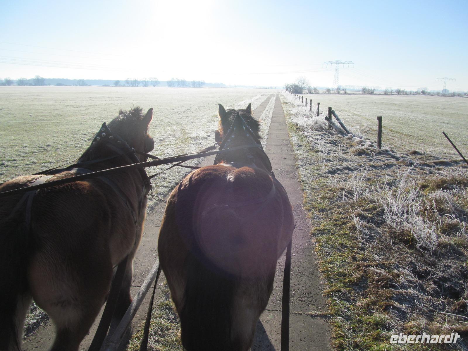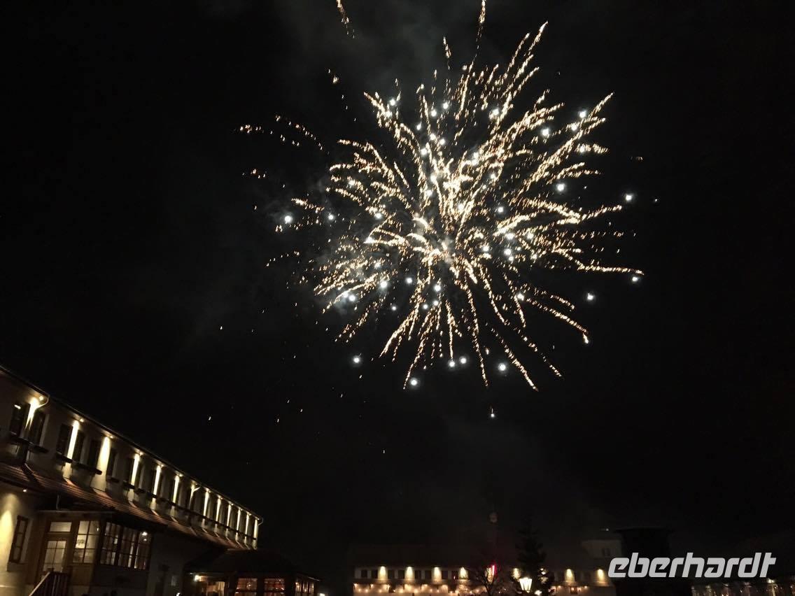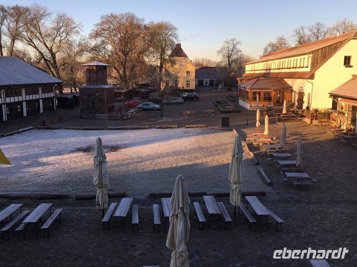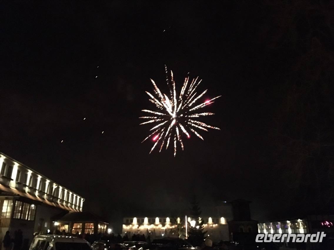 Nachdem wir uns alle an dem reichhaltigen Frühstücksbuffet gestärkt hatten, begrüßte uns Herr Schütz und lud uns zu einem Spaziergang über das Gelände ein. Er erklärte uns viele Hintergründe zu der Geschichte des Anwesens und zeigte dabei jedes Gebäude - Von dem Pferde- und Kuhstall über die Schmiede bis hin zur Markthalle. An dem heutigen Silvesterabend wurden in allen Veranstaltungsräumen zusammen etwa 650 Gäste erwartet. Unser Rundgang endete in der Schlosseigenen Brennerei, wo wir eine Vielzahl von selbst gebrannten Geistern und Likören probieren konnten. Sehr außergewöhnlich waren dabei der Spargelgeist und der Schlehenschnaps. Im Anschluss an das nette zusammen kommen in der Brennerei ging es auf die mit Pferden bespannten Kutschen. Mit ausreichend Decken ging unsere Fahrt durch die Weiden rund um Diedersdorf los. Wir genossen die angenehm frische Luft in der winterlichen Landschaft. Die Wiesen und die Bäume waren mit Frost überzogen. Für eine Überraschung sorgte direkt im Anschluss an die Kutschfahrt, der bereits vorbereitet kleine Imbiss in Form eines Glühweins und Fettschnitten. Diese kleine Aufmerksamkeit wurde im Vorfeld von Eberhardt Travel organisiert und alle Gäste freuten sich darüber. Den Mittag verbrachten dann alle Gäste individuell, bevor es halb drei dann in der Brandenburger Stube Kaffee und Kuchen von der eigenen Schlossbäckerei gab. Von Streuselkuchen mit Kirschen bis hin zu Pfannkuchen und Kaffee war alles dabei. Bevor der anstehende Jahreswechsel immer näher rückte, gossen wir Blei, um schon einmal zu schauen, was uns im neuen Jahr erwarten wird. Den restlichen Nachmittag nutzten wir, um uns auf den bevorstehenden Abend vor zu bereiten. Halb sieben trafen wir uns dann wieder alle im Schloss und nahmen im großen Saal an den Tafeln Platz. In dem prunkvollen Saal wurde und das 3-Gänge-Menü am letzten Abend des Jahres serviert. Pünktlich um 24 Uhr wurde ein Glas Champagner zum Anstoßen gereicht und wir genossen im neuen Jahr das fantastische Höhenfeuerwerk, direkt vor dem Schloss. Wir feierten bis in die Morgenstunden.