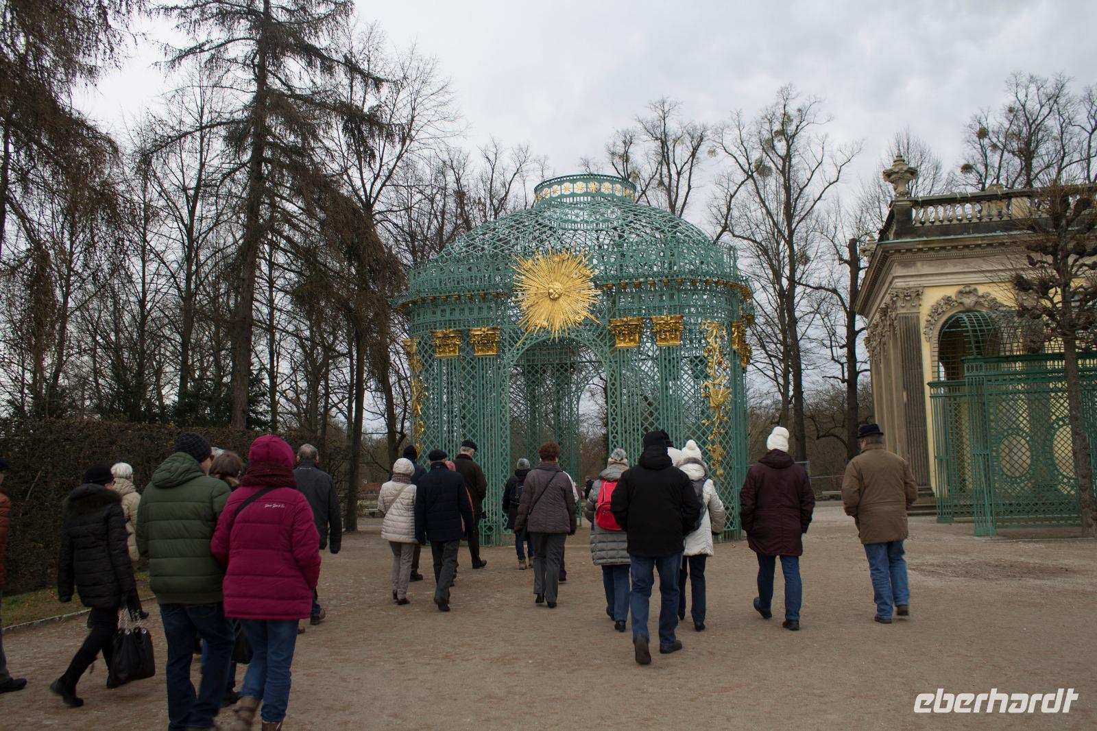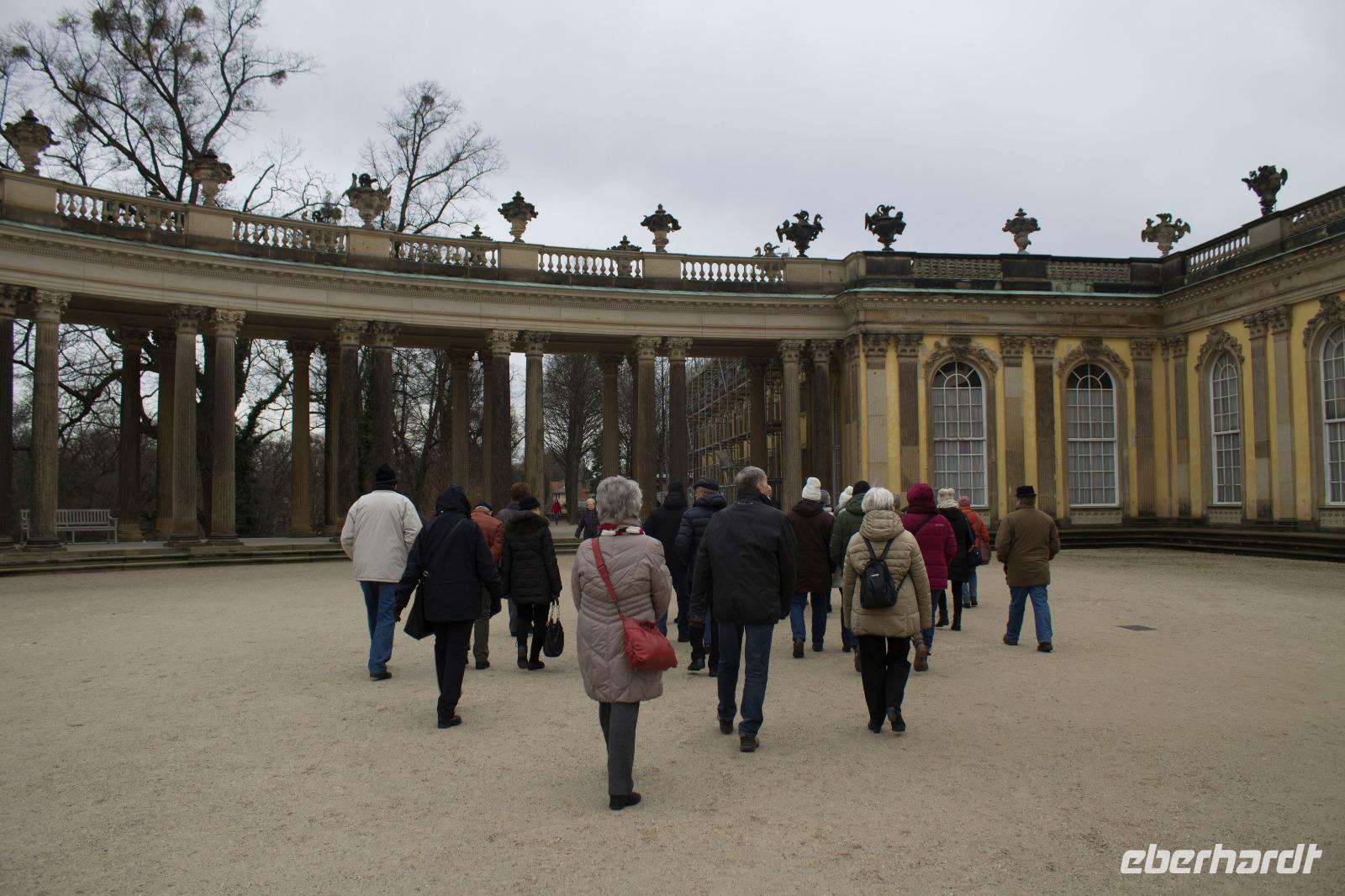 Heute Morgen machten wir uns mit einem Herolé Reisebus und unserem netten Busfahrer Robert auf den Weg nach Potsdam. Auf dem Weg dorthin sammelten wir noch alle Busanreisegäste ein und trafen ohne Verzögerungen am Luisenplatz in Potsdam ein. Dort stiegen unsere beiden Reiseleiterinnen des heutigen Tages, Frau Dr. Solf und Frau Weinkauf, sowie ein paar unserer Eigenanreisegäste mit ein. Gemeinsam fuhren wir nun zum Schloss Sanssouci. Am Parkplatz angekommen teilten wir uns in zwei Gruppen, da wir so einen angenehmeren Rundgang über das Gelände des Schlosses unternehmen konnten. Wir begannen mit dem oberen Teil des Schlosses und lauschten gespannt den Worten unserer Reiseleiterinnen. Sie brachten uns das damalige Treiben zu dieser Zeit näher und erklärten uns noch viele interessante Dinge zum Schloss. Im Anschluss ging es gemeinsam wieder in unseren Bus und wir machten noch eine sehr informative Stadtrundfahrt. Diese führte uns durch die barocke Innenstadt, vorbei an prachtvollen Villen und über die berühmte Glienicker Brücke, welche Berlin und Potsdam über die Havel verbindet. Zuletzt hatten wir noch etwas Freizeit im Holländerviertel, wo viele von uns auf Grund des doch nicht so guten Wetters, eines der berühmten Cafés aufsuchten um ein paar Stunden im Warmen und Gemütlichen zu verbringen. Danach fuhren wir in unser langersehntes Schloss Diedersdorf. Dort angekommen wurden uns direkt im Bus unsere Zimmerschlüssel überreicht und wir hatten noch etwas Zeit um unsere schönen Zimmer zu beziehen und uns etwas frisch zu machen, denn am Abend erwartete man uns schon mit einem Begrüßungs-Cocktail und einem herrlichen Fondue Essen im Pferdestall. So ließen wir diesen ersten erlebnisreichen Tag in fröhlicher Gesellschaft gemeinsam ausklingen.