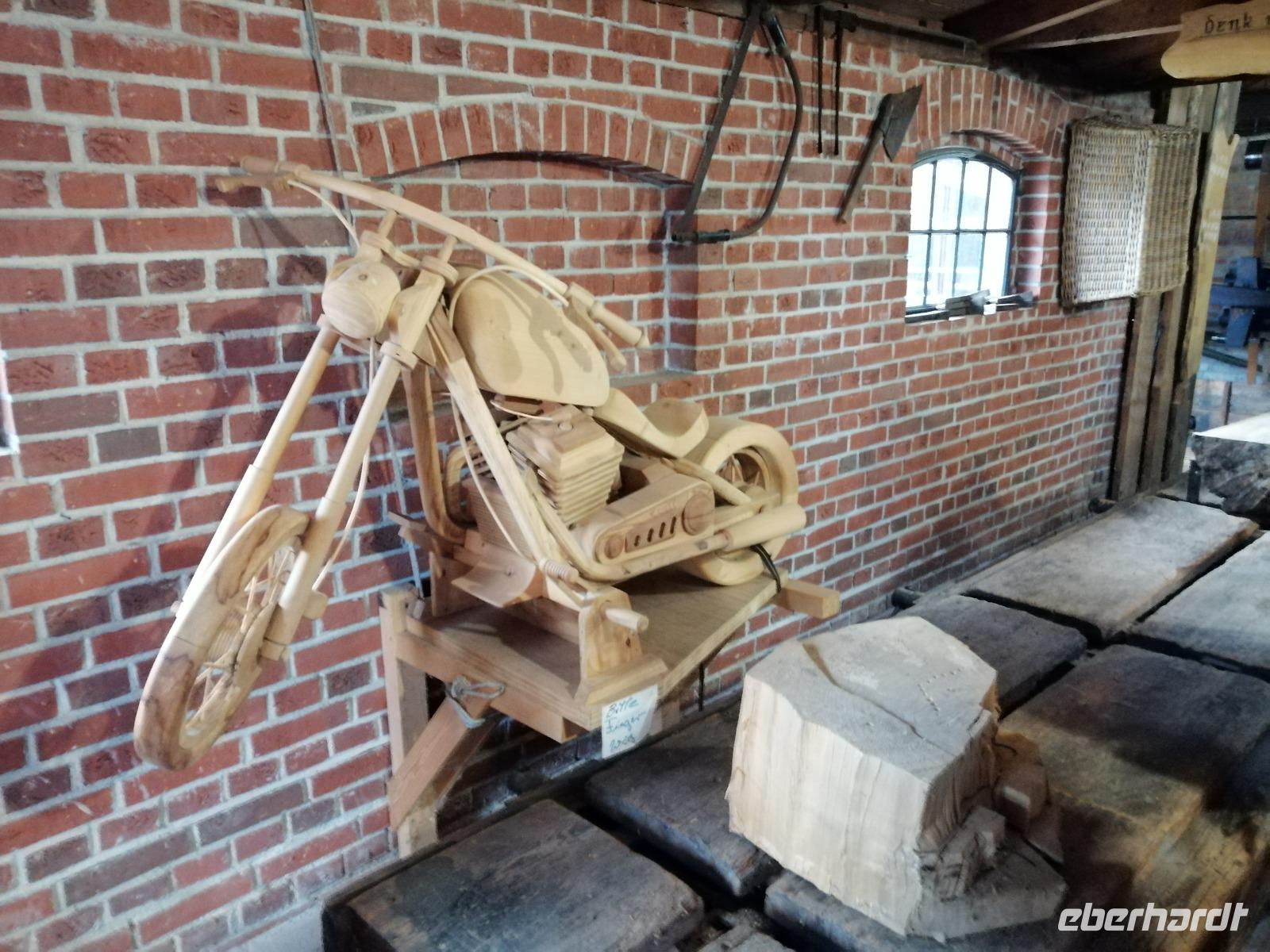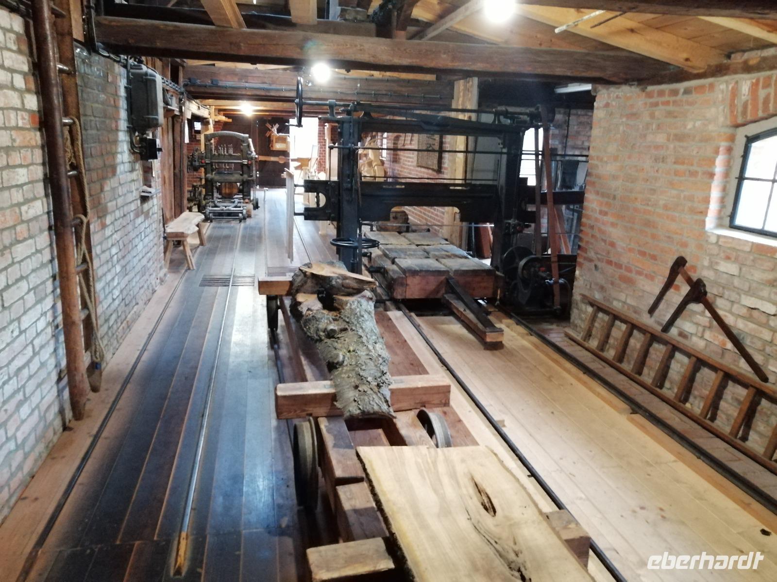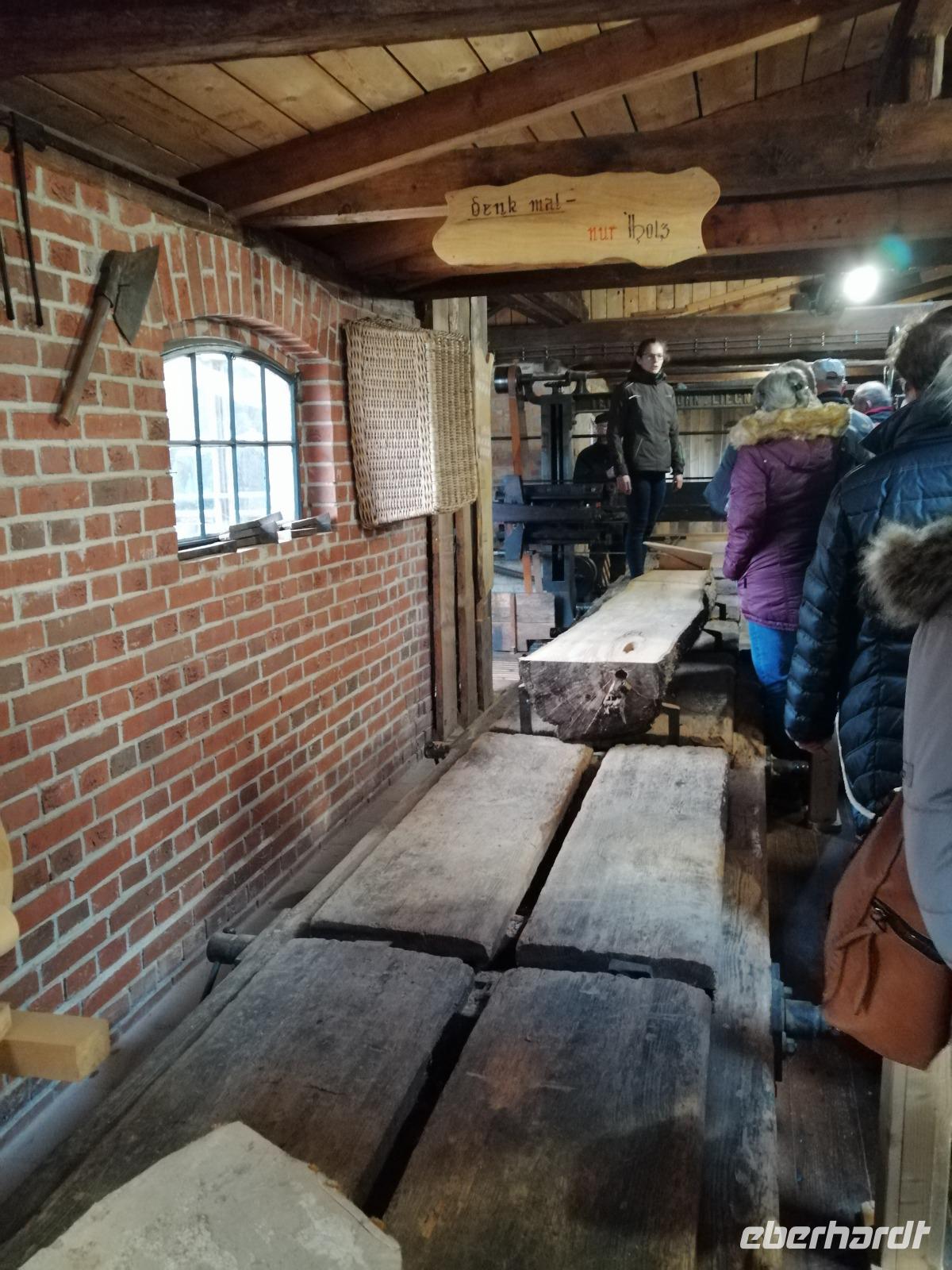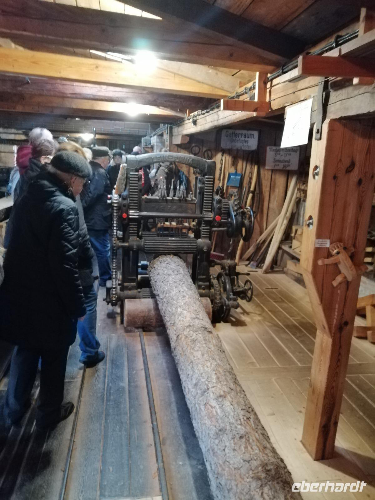 Eine junge Frau führte uns durch die Sägemühle und stellte uns die Technik der damaligen Zeit vor. Die Sägemühle wurde 1885 erbaut und ist heute wieder in voll funktionsfähigen Zustand. Das Horizontalgatter kann Stämme bis zu einem Meter Durchmesser sägen, das Vertikalgatter ist für kleinere Stammdurchmesser bis 45 cm geeignet und könnte sogar noch mit Wind betrieben werden.