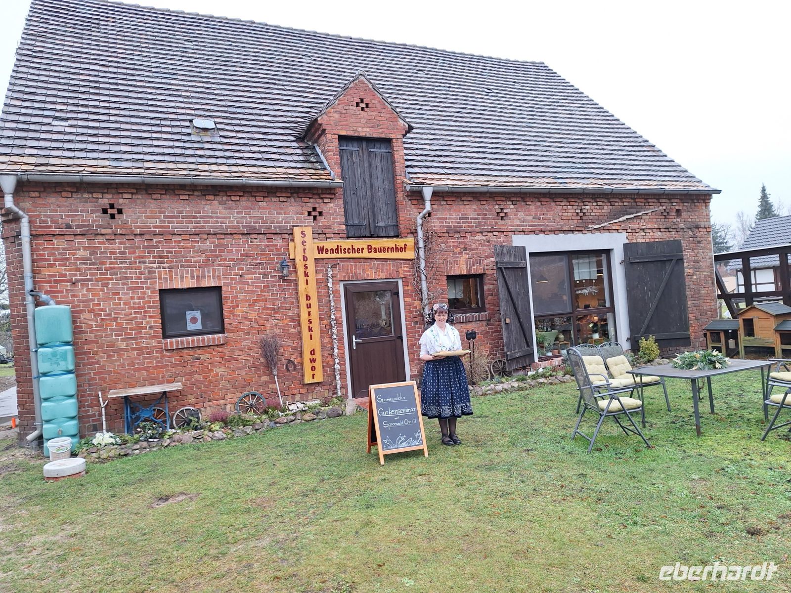 Christl empfing uns in der traditionellen sorbischen Tracht mit Weißbrot, Zucker und Leinöl zur Begrüßung.
