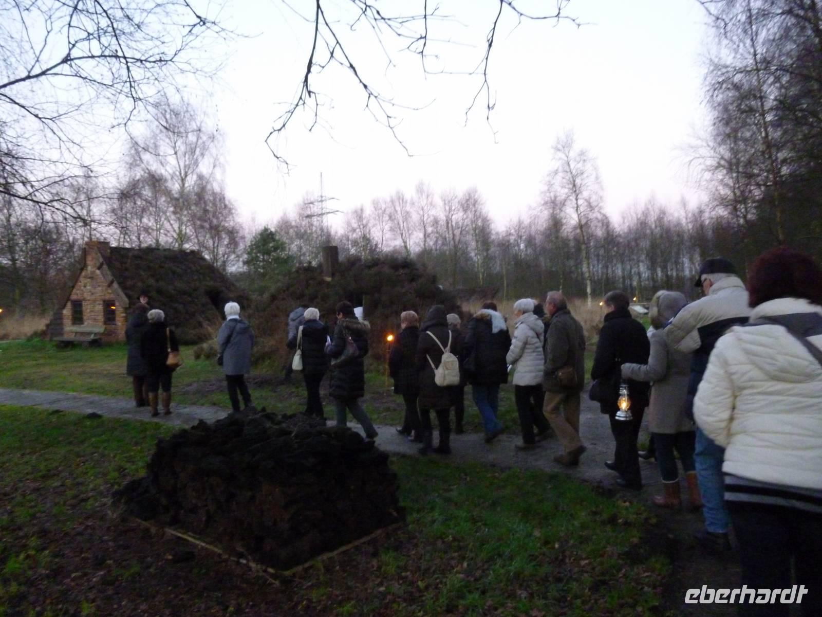 Nach einer Mittagspause genossen wir im Papenbörger Hus deftig-süße Buchweizen-Pfannkuchen, als eine Art Plinse in gusseisernen Pfannen frisch für uns gebacken. Wir prosteten uns mit Moorwasser zu und folgten dann bei einsetzender Dämmerung unserem Spökenkieker Ludger. Assistiert von unserer freundlichen Laternenfee, erzählte er uns von einstiger Mühsal, von Gespenstern und Ereignissen, vom Alltag im Moor in der Museumsanlage van Velen, dem ehemaligen Drosten und Gründer des Ortes.
