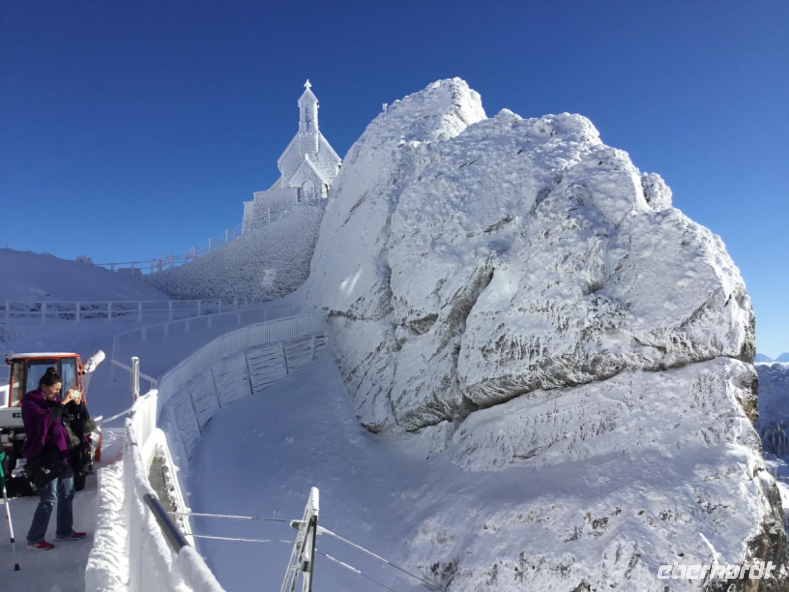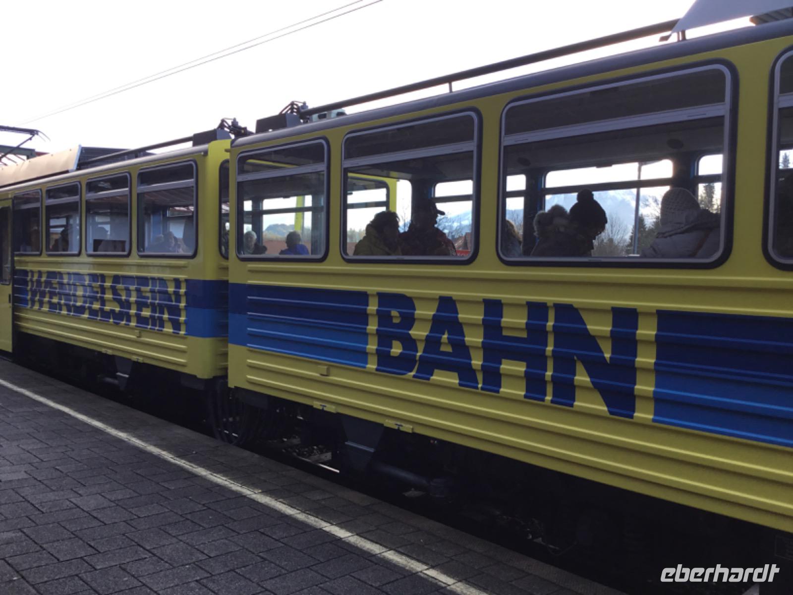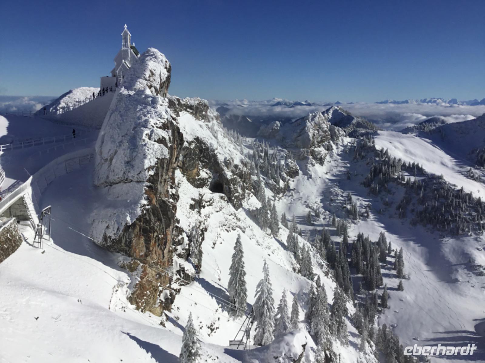 Es gibt sie doch noch, die Sonne. Und der morgendliche Blick auf die Webcam des Wendelstein verheißt sogar ein Wintermärchen. Nach kurzer Fahrt erreichen wir in Brannenburg die Zahnradbad. Gute 20 Minuten dauert die Fahrt nach oben. Und was uns hier erwartet, hätte so mancher Gast bei der Abfahrt nicht zu hoffen gewagt: ein spektakuläres Bergpanorama mit blauem Himmel, Sonne und Schnee.