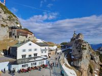 Heute verspricht es ein schöner Tag zu werden. Glücklicherweise geht der Sonne heute noch nicht die Puste aus. Nach kurzer Fahrt erreichen wir in Brannenburg die Zahnradbahn, die 1912 erbaut wurde, die uns in gut 20-minütiger Fahrt zum Wendelsteinplateau bringt. Und was uns hier erwartet, hätte so mancher Gast bei den letzten Tagen nicht zu hoffen gewagt: ein wunderbares Bergpanorama bei Sonnenschein! Eigentlich kann man sich hieran gar nicht satt sehen. Leider ist der Aufstieg – zum Gipfel- auf dem sich eine Sternwarte, eine Sendeanlage des Bayrischen Rundfunks und auch eine Kapelle befindet - aus Sicherheitsgründen - gesperrt. Trotzdem wagen es sehr viele Besucher über den abgesperrten Zaun zu steigen ! Welcher Leichtsinn ! Sogar am Wendelsteinplateau im freien konnte ein Imbiss eingenommen werden. Nicht umsonst ist der Wendelstein einer der beliebtesten Gipfel der deutschen Alpen. Für unsere Abfahrt nehmen wir die Seilbahn. Gerald erwartet uns schon am Bus mit einem Glühwein und wir können unsere Rückfahrt über den Schliersee antreten. Für die Weihnachtsreisegäste, die morgen zurückfahren, heißt es nun: Koffer packen. Mit einem Menue lassen wir den Abend ausklingen und wünschen den verbleibenden 14 Silvestergästen noch eine gute Zeit und natürlich weiterhin schönes Wetter.