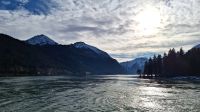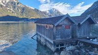 Der erste Weihnachtstag begrüßt uns mit herrlichem Wetter, perfekt um in die Berge zu fahren. Über Bad Tölz geht es auf der Deutschen Alpenstraße in Richtung Tegernsee. Heute am Feiertag scheinen die mondänen Ortschaften um den berühmten See völlig ausgestorben und wir genießen die schöne Aussicht. Anschließend fahren wir weiter in die Berge hinein und überqueren den Achenpass auf 941 Metern Höhe und überfahren damit die Grenze zu Österreich. Was in den 1930ern Teil der neu deklarierten Deutschen Alpenstraße war, gehört heute auf etwa 30 Kilometern als Achentalstraße zum Bundesland Tirol. Nun sind es nur noch wenige Kilometer bis zu den Ufern des Achensees, dem größten See Tirols. Wunderschön liegt er zwischen dem Karwendelgebirge und den Brandenburger Alpen und heißt uns im Sonnenschein Willkommen.