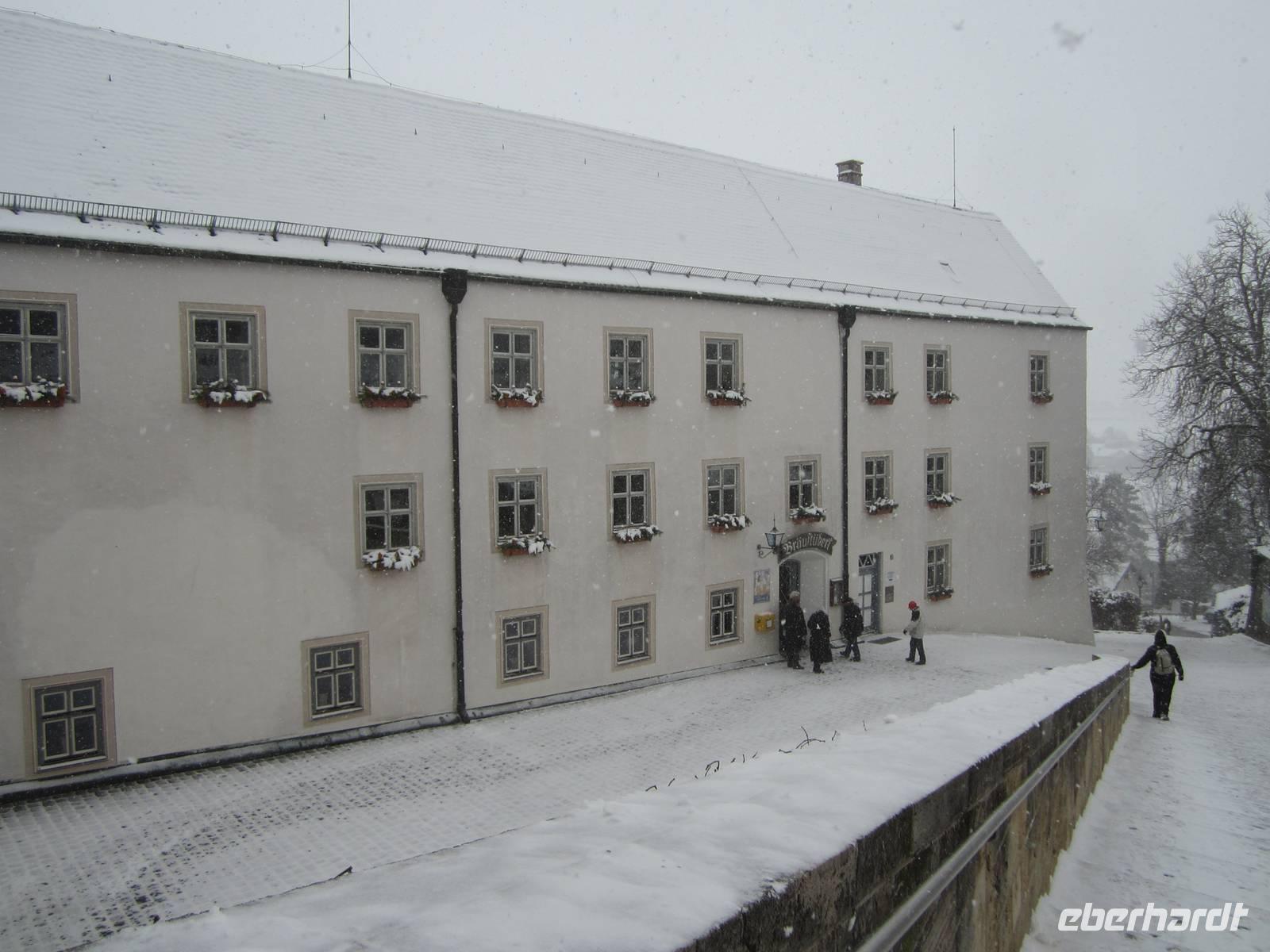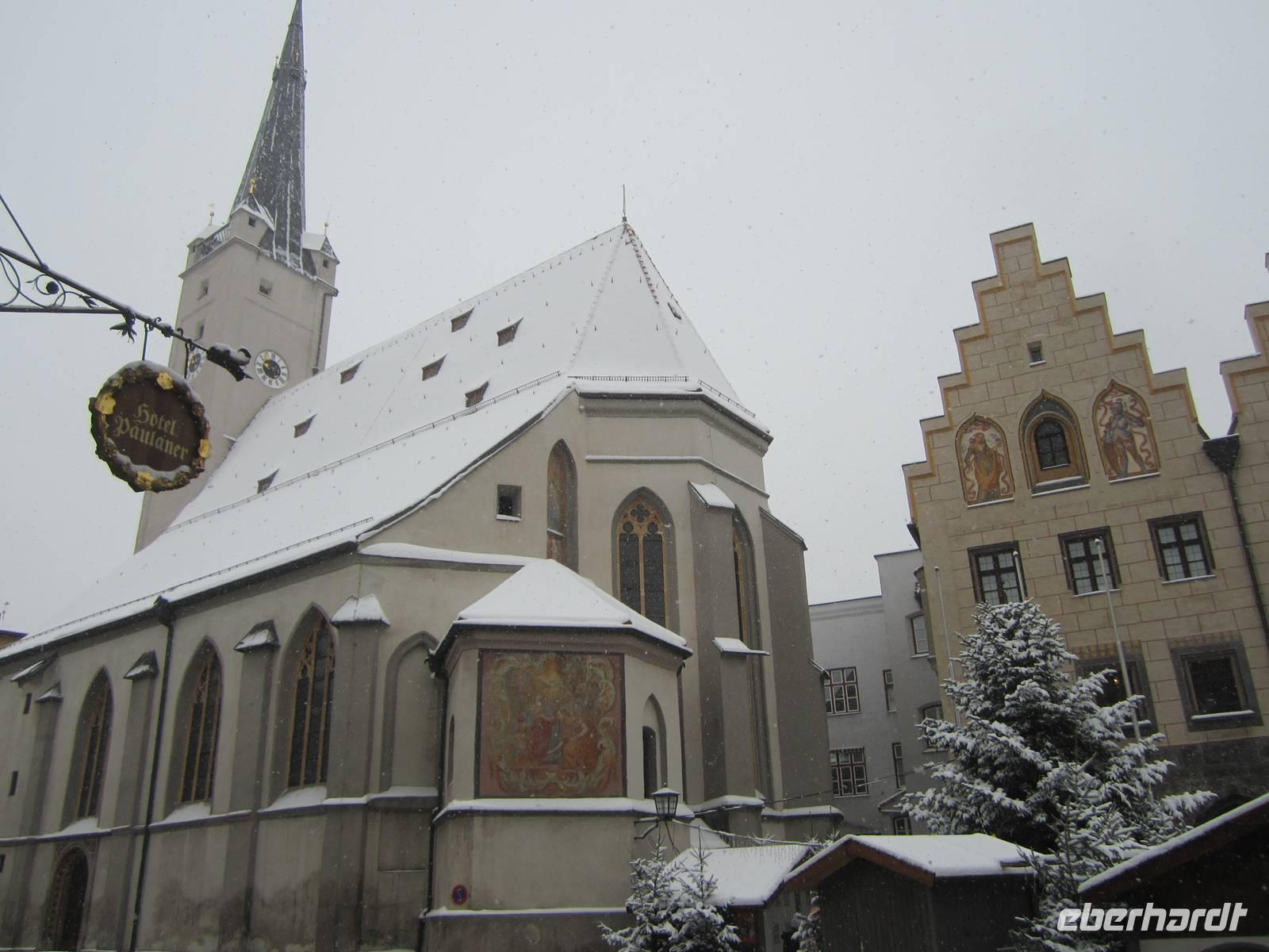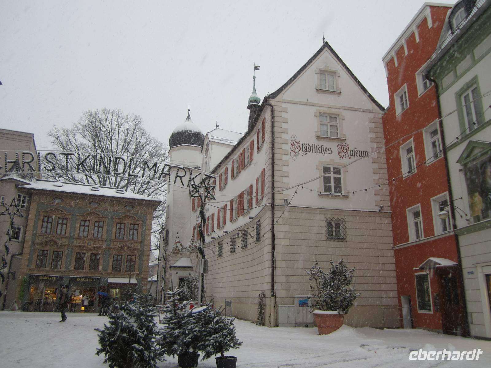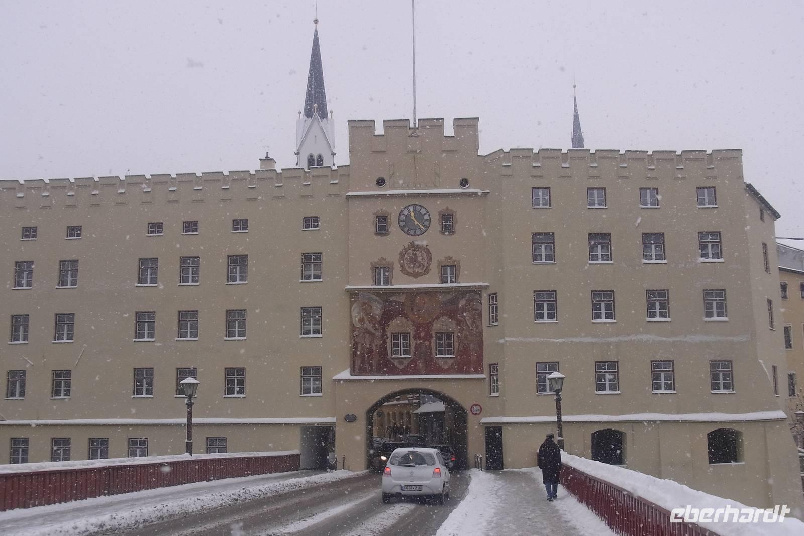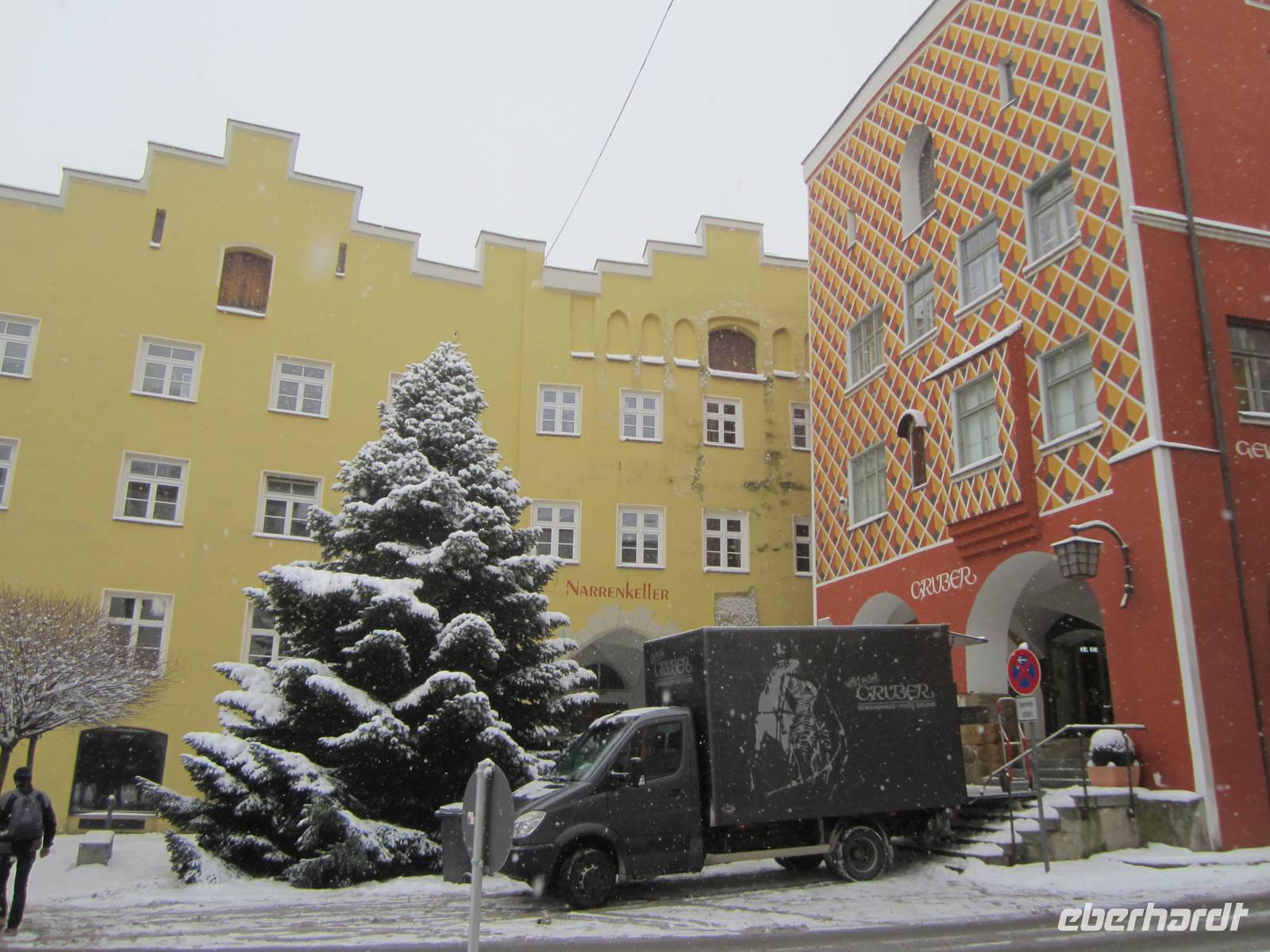 Wasserburg ist heute Vormittag Programm. Unsere Fahrt führt uns rechts vom Inn zur Stadt. Wie eine Schleife legt sich der Fluss um den kleinen spätgotischen Ort. Die Perle am Inn liegt, wie eine kleine Insel vor uns als wir an der Innbrücke ankommen. Einer der schönsten Blicke auf die Stadt, wenn man diese das erste Mal besucht. Wir fahren mit dem Bus über die Brücke und schaffen gerade so die Durchfahrt durch das Brücktor. Wir werden auch heute mit Schnee verwöhnt und somit suchen wir bei der Stadtführung in 2 Gruppen auch immer wieder schützende Orte. Die Stadt war durch die Lage am Inn und der Schifffahrt, der Salzstraße und dadurch, dass sie Handels und Kriegshafen von München war, eine bedeutende Stadt. Wir schauen uns heute die Zeitzeugen in Form von Architektur an und da hat sie viel zu bieten. Nach ca. 1,5 Stunden haben uns die Stadtführer auf angenehme Art ihre Stadt vermittelt. Danach bleibt noch etwas Zeit die Stadt individuell zu erkunden. Gegen 13.00 Uhr treffen wir uns wieder am Bus und wir verlassen auf der schmalen Landzunge die Stadt. So kurz vor Jahresende wollen wir heute noch die