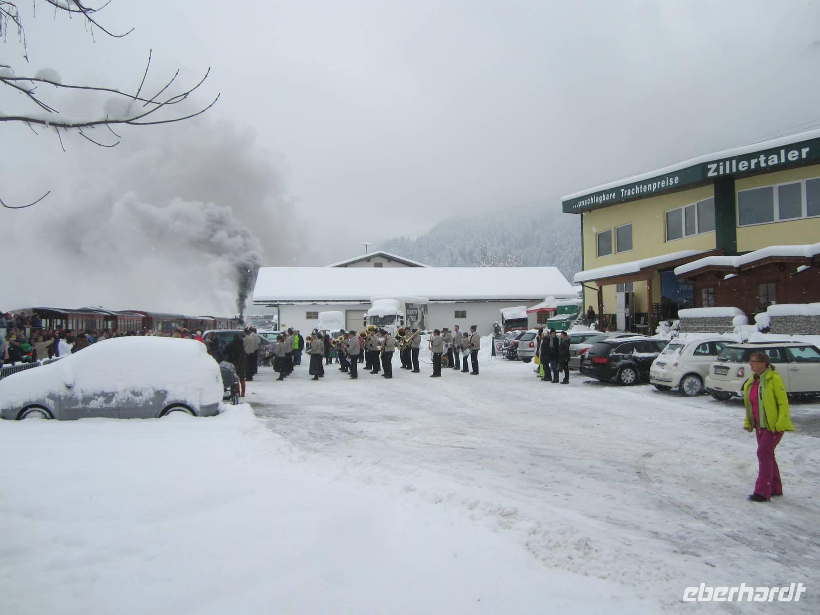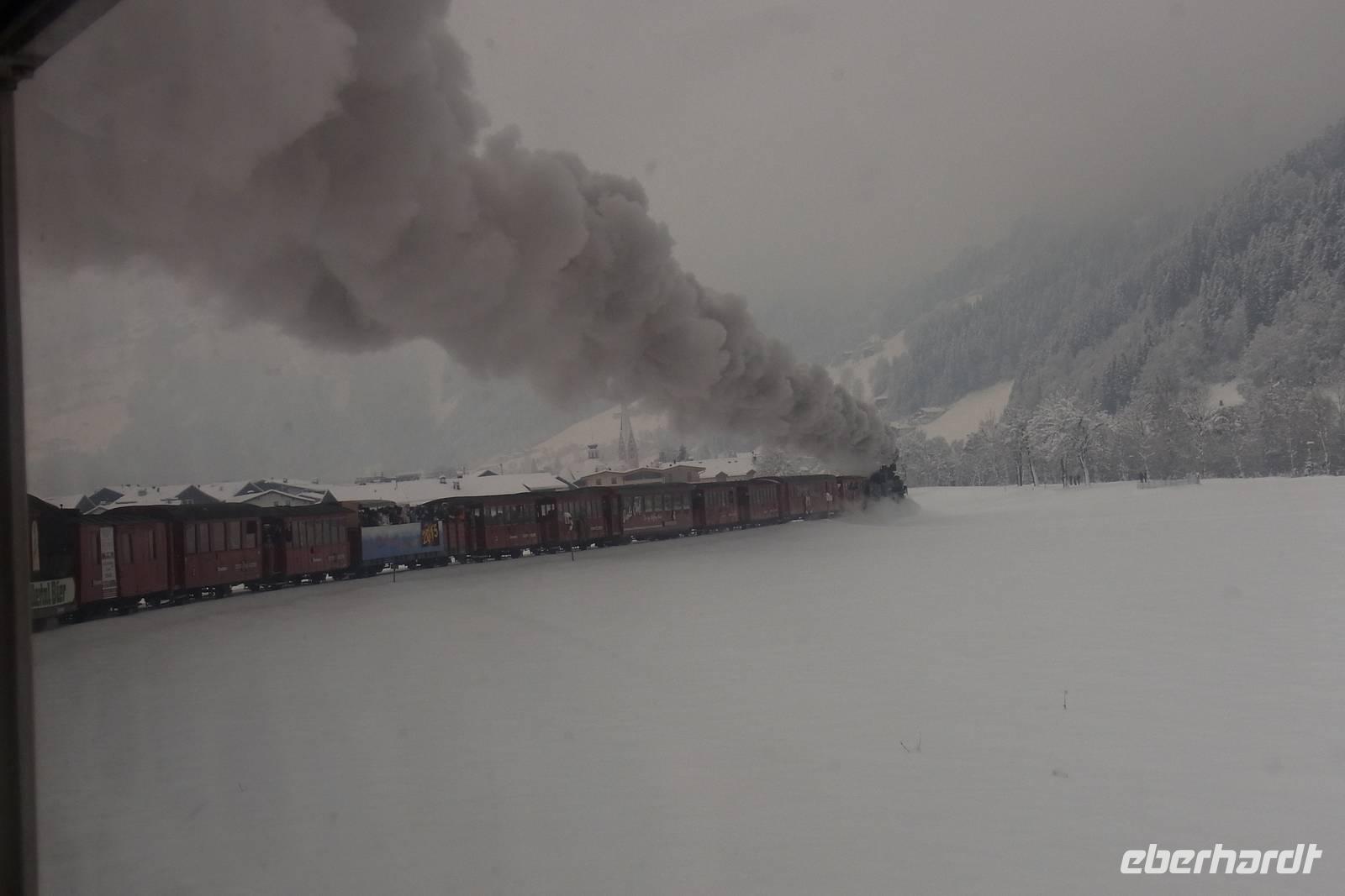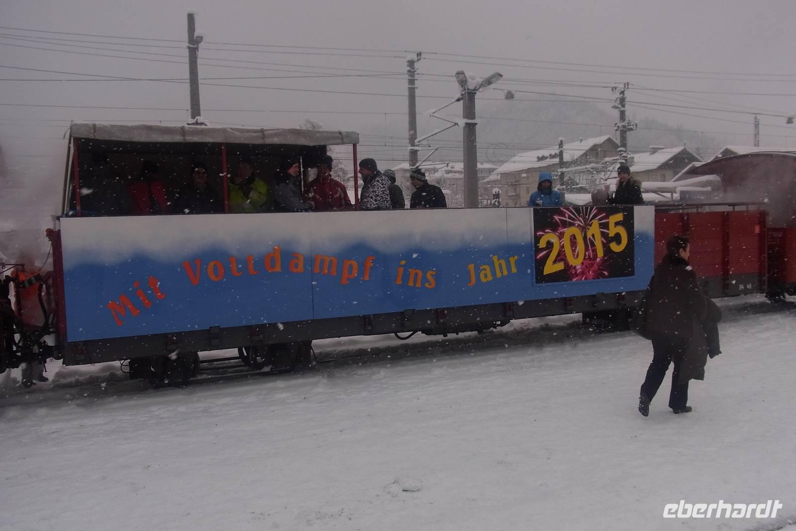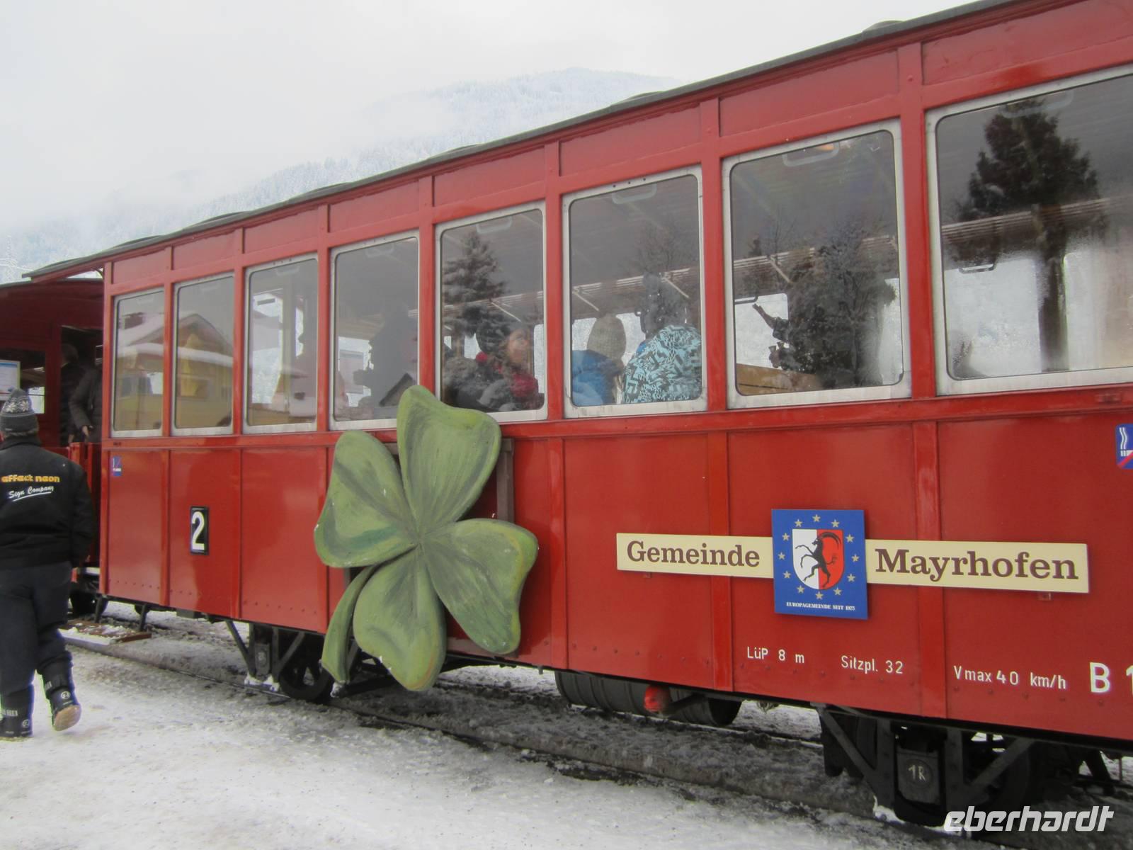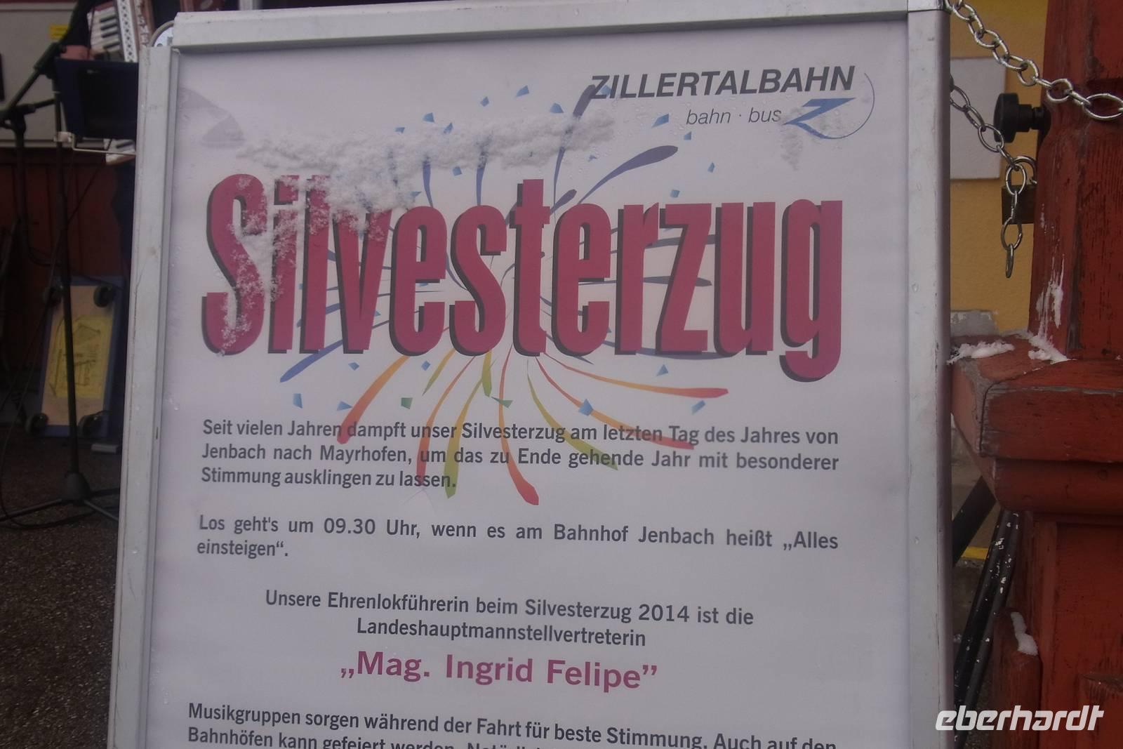 Das Jahr 2014 geht zu Ende. Wir begehen diesen Tag zünftig mit guter Laune und viel Musik. Dafür fahren wir in Zillertal nach Tirol. Auf unserer Fahrt haben wir wiederum Schneepflüge auf unserer Strecke und wir hätten bald unseren Zug verpasst. Aber das Glück spielt mit und wir erreichen unseren Waggon am Ende des Zuges. Mit Musik werden wir schon in Jenbach dem Ausgangspunkt der rund 32 km langen Fahrt begrüßt. Weiter geht es mit Musik in unserem Abteil und auf der Strecke an vielen Bahnhöfen. Es ist Tradition, dass rrominente Gäste auf der Lok mitfahren und dieses Jahr ist es die Landeshauptmann-Stellvertreterin Ingrid Felipe. Zuständig für Umwelt, Klimaschutz u.a. Getreu dem Motto "Alles Einsteigen" lernen wir auf jeder Station auch andere Leute kennen.