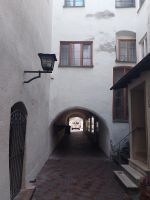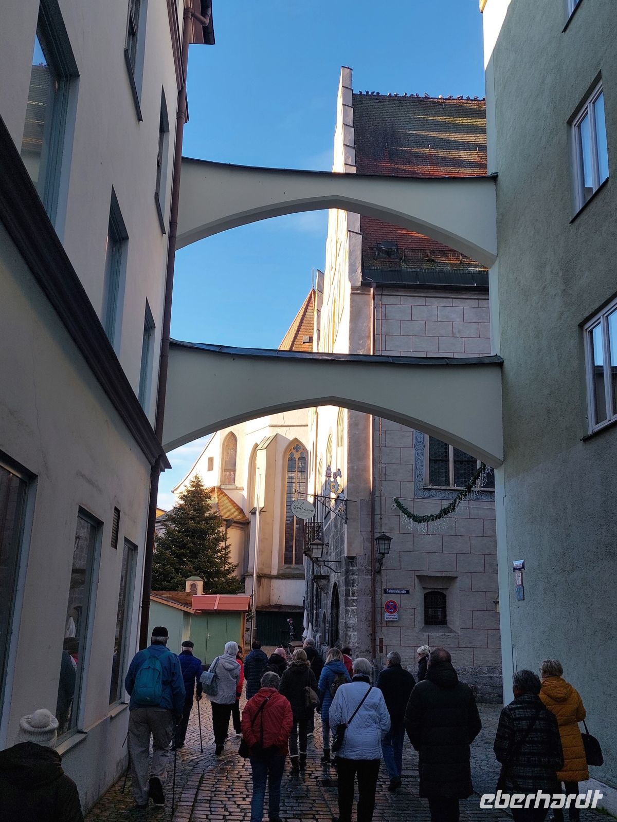 Nach einer dreiviertel Stunde Busfahrt durch Rosenheim und entlang des Inns erreichten wir die mittelalterliche Stadt Wasserburg am Inn. Unsere örtliche Reiseleiterin führte uns, beginnen an der Max-Emanuel-Kapelle, in die Innenstadt. Wir erfuhren viel interessantes über die Bauweise und die Lebensbedingungen im 16. und 17. Jahrhundert. Wir sahen die, wegen der „Fenstersteuer“ sehr schmalen Straßenfassaden der bis zu 80m in die Tiefe reichenden Gebäude, die dicken Mauern, die engen Höfe mit den in die Obergeschosse führenden „Himmelsleitern“. Auch lernten wir den Hintergrund des Spruches „etwas auf dem Kerbholz haben“ kennen. Vorbei an der leider geschlossenen St. Jacobs-Kirche und der Michaelskapelle gingen wir zum, mit farbenfrohen „Geisterfallen“ versehenen Gewandhaus am Marienplatz und weiter durch das Brucktor zur Innbrücke. Vor hier aus konnten wir auf das gegenüberliegende Steilufer, den Innleiten, sehen. Von der Brücke hatten wir einen Blick auf die Rückfront der mittelalterlichen Stadt, die früher sehr oft vom Hochwasser heimgesucht wurde. Auf dem Innwanderweg der zu 7/8 vom Inn umflossenen Halbinsel erfuhren wir mehr über das Leben in den vergangenen Jahrhunderten. Die Führung endete an der 1324 erstmals erbauten Frauenkirche am Marktplatz.