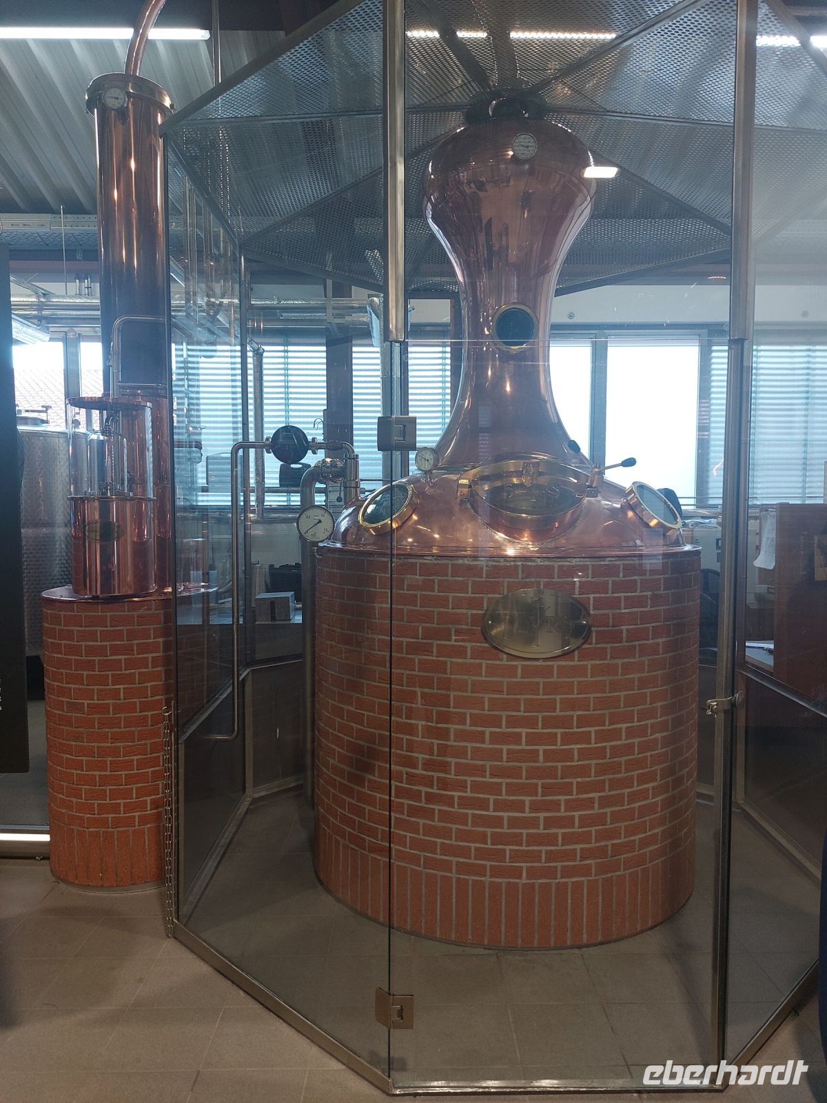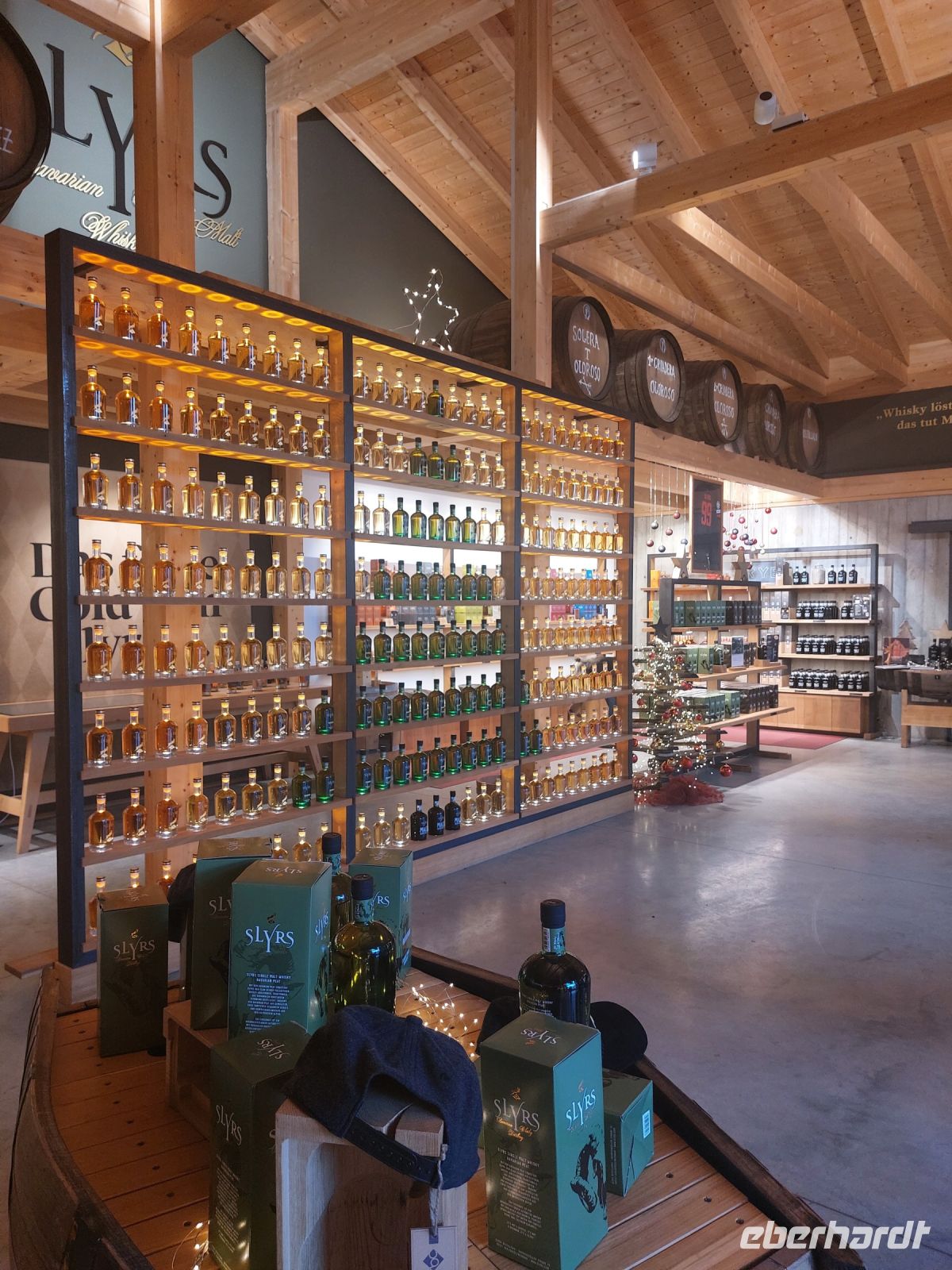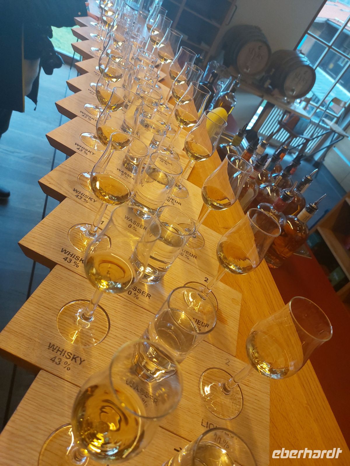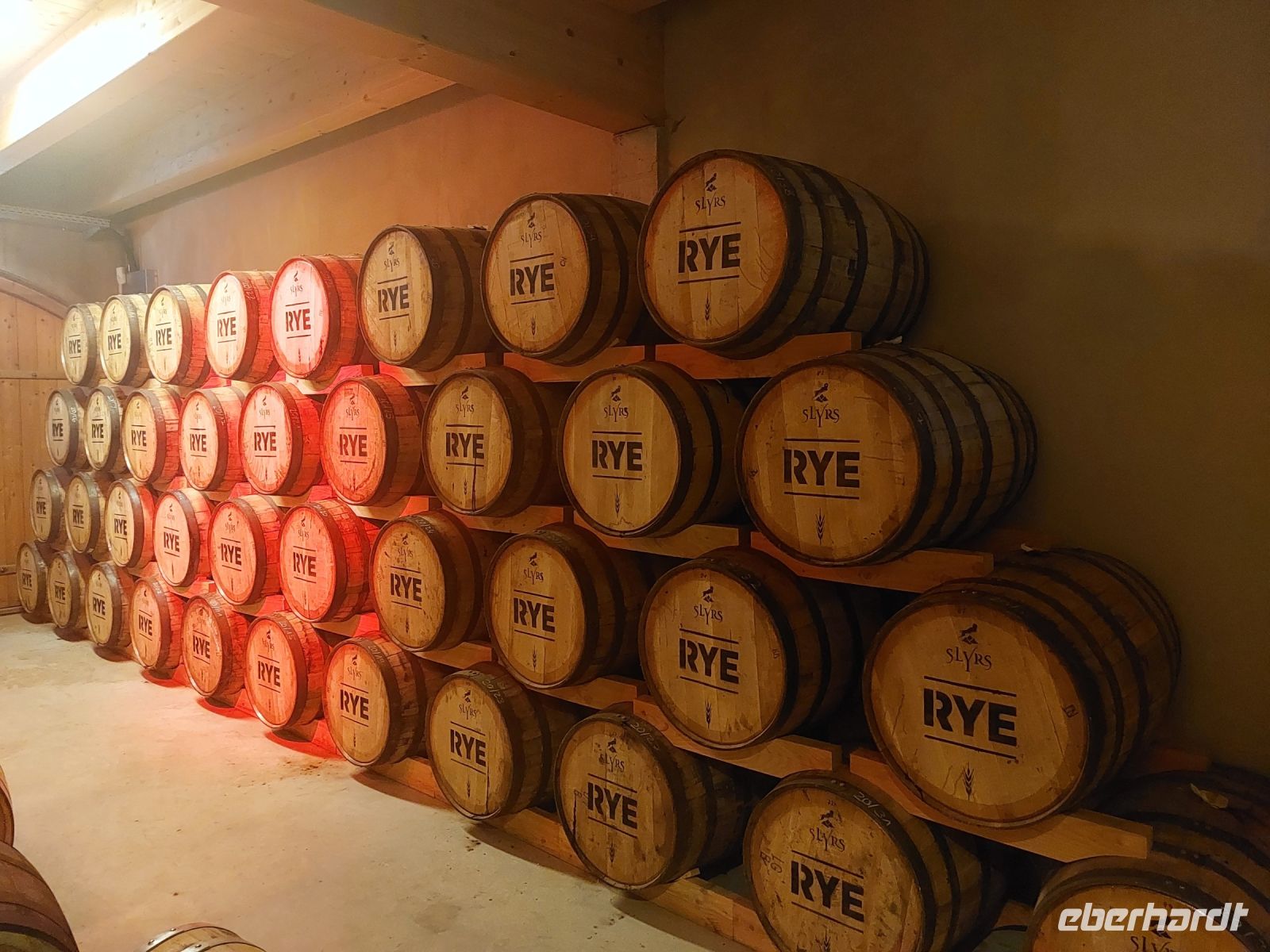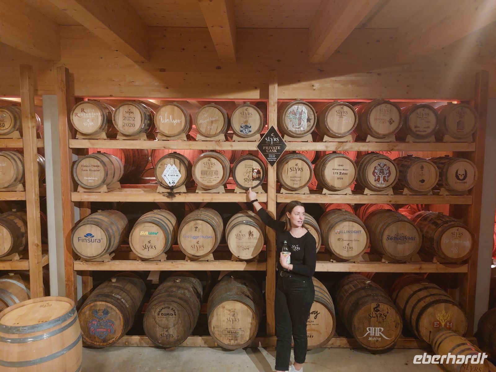 Nach einer Stunde zur freien Verfügung fuhren wir zu der in der Nähe des Schliersees gelegenen SLYRS Whisky Destillerie weiter. Hier bekamen wir von Aline viel Informationen über die Ausgangsstoffe, die Herstellungsstufen und die Lagerbedingungen des Whisky-Produktion mitgeteilt. Bei einem Rundgang durch die Lagerräume sahen wir mehrere Varianten der inneren Ausgestaltung (Brennmuster), der aus amerikanischer Weißeiche gefertigten 225l Lagerfässer, die sich später in unterschiedlichen Geschmacksnoten widerspiegeln. Auch zeigte sie uns ein Regal mit „privaten“ Fässern, wo das aus der SLYRS-Destille stammende Rohprodukt in verschiedenen, in erster Nutzung anderweitig verwendeten Fässern, weiter „ausgebaut“ wird. Die Führung endete mit einer kleinen Verkostung zweier Destillate.