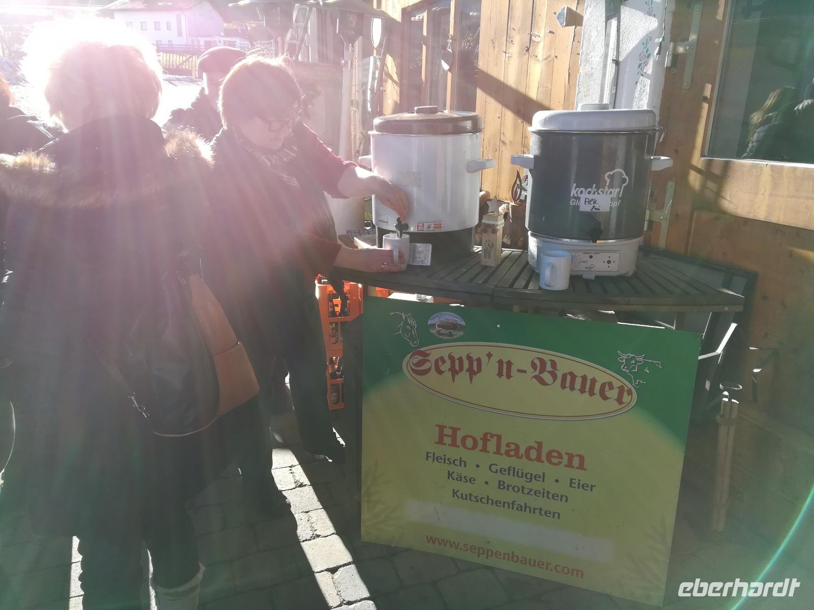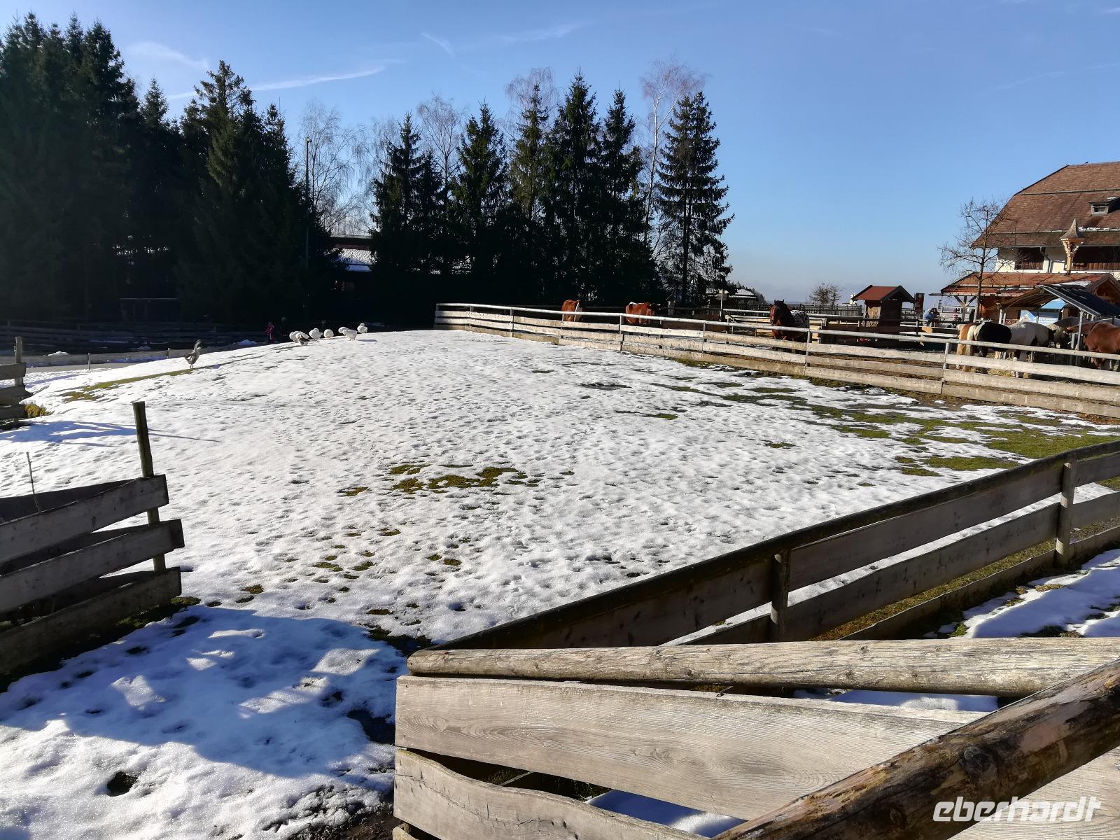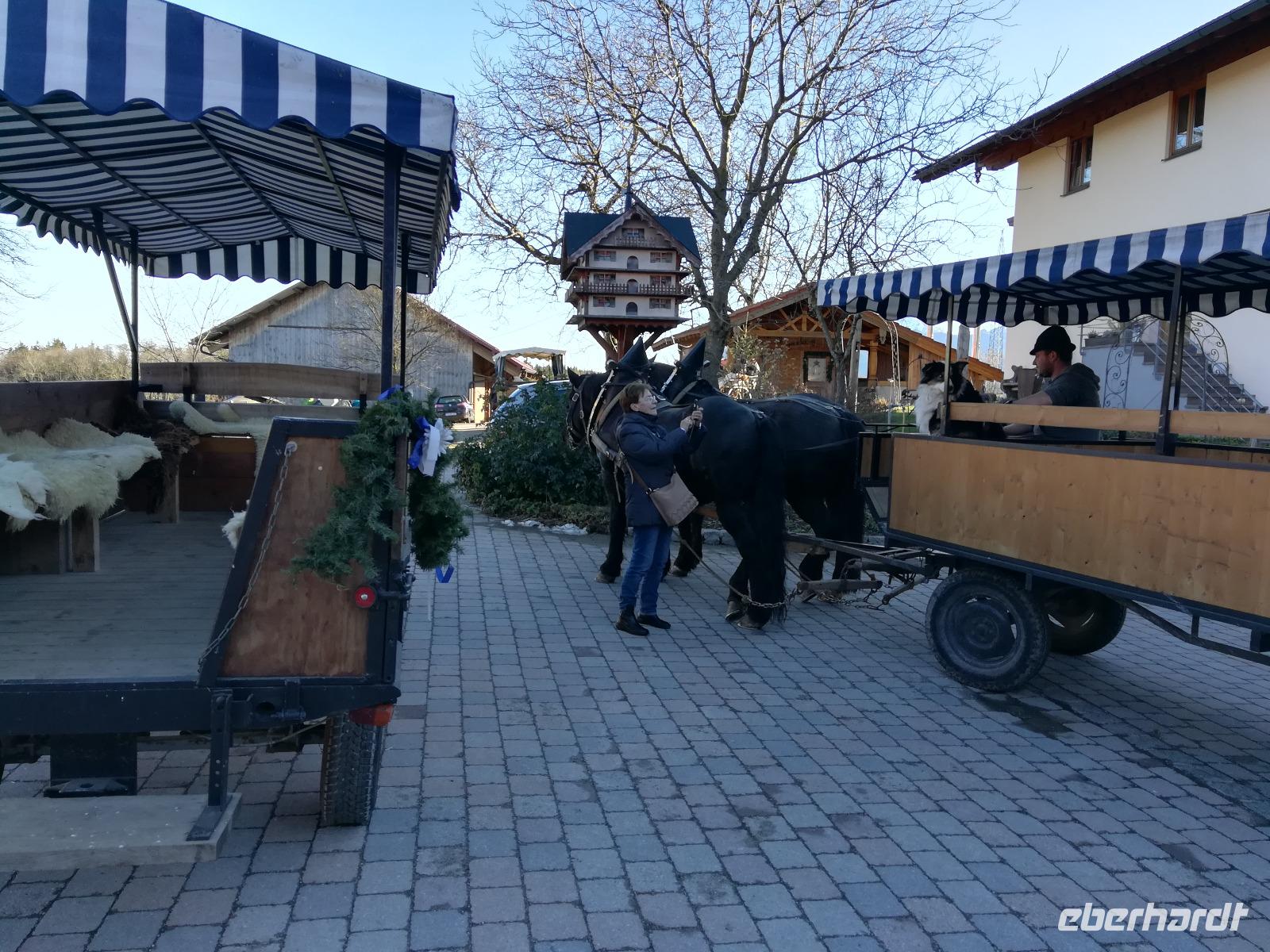 Am letzten Tag des Jahres ist eine Pferdekutschfahrt angesagt. Der Bus bringt uns nach Bernau am Chiemsee zum Sepp'n Bauern, einem Bauernhof, der Weidewirtschaft betreibt und der mehrere Pferdegespanne zur Verfügung hat, um Gäste in die herrliche Umgebung des Chiemgaus zu kutschieren. Bei strahlendem Sonnenschein ruckeln wir auf den Feldwegen dahin und erfahren von der Tochter des Hauses ganz viel über die aktuellen Gegebenheiten auf dem Bauernhof. Anschließend, beim Vespern, erzählt die Bäuerin über die Entstehung des Bauernhofes und lädt uns herzlich ein, im Hofladen Produkte aus der eigenen Produktion zu verkosten und halt auch zu kaufen.