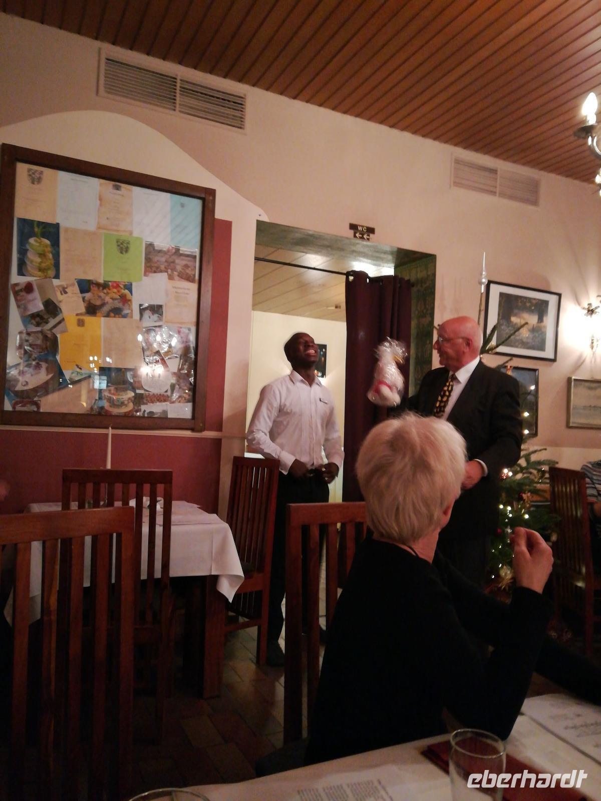 In unserem weihnachtlich sehr schön geschmückten Hotelrestaurant nehmen wir dann das Weihnachtsmenue ein und die Hotelchefin, Frau Wulf, läßt den Heiligabend stimmungsvoll ausklingen, indem sie mit uns Weihnachtslieder singt. Unser Gast, Frau Reule, begleitet auf der Mundharmonika und somit findet für uns alle eine wunderschöne Weihnachtsfeier in festlichem Ambiente statt. Schön wars.