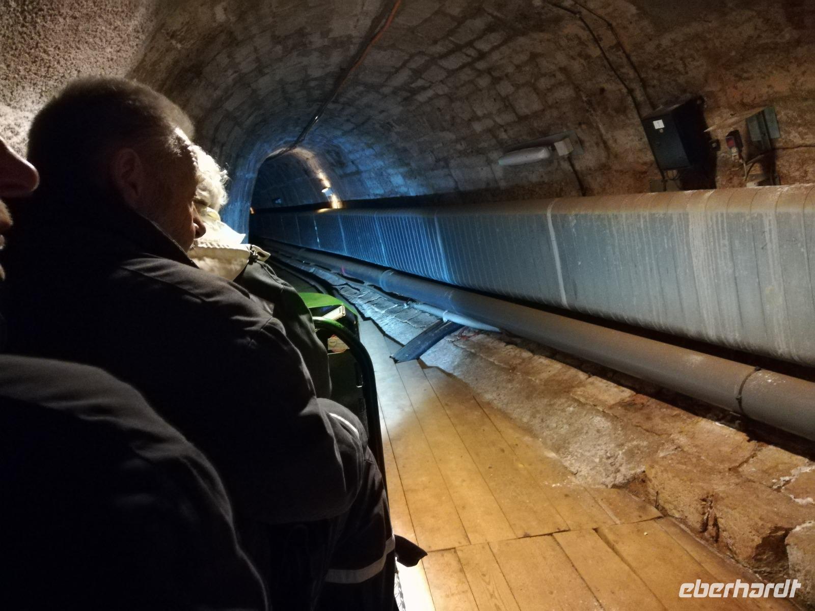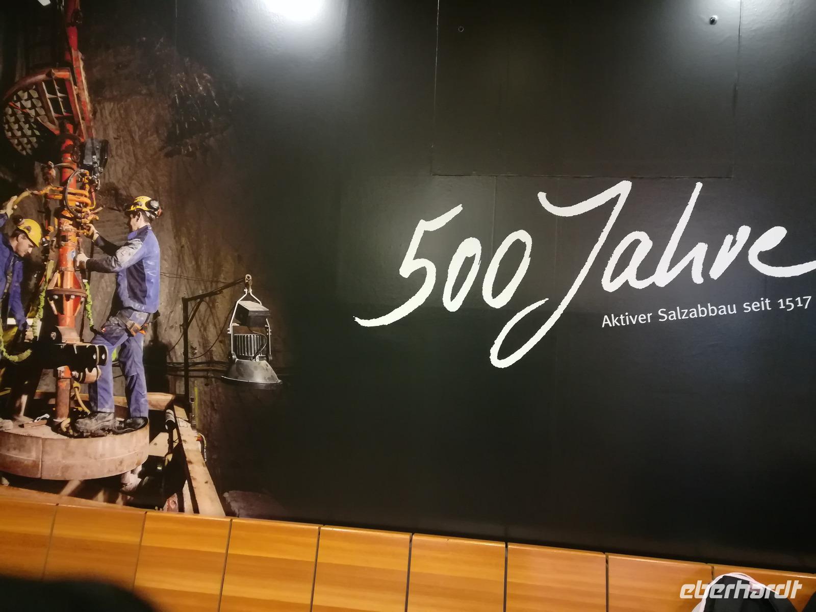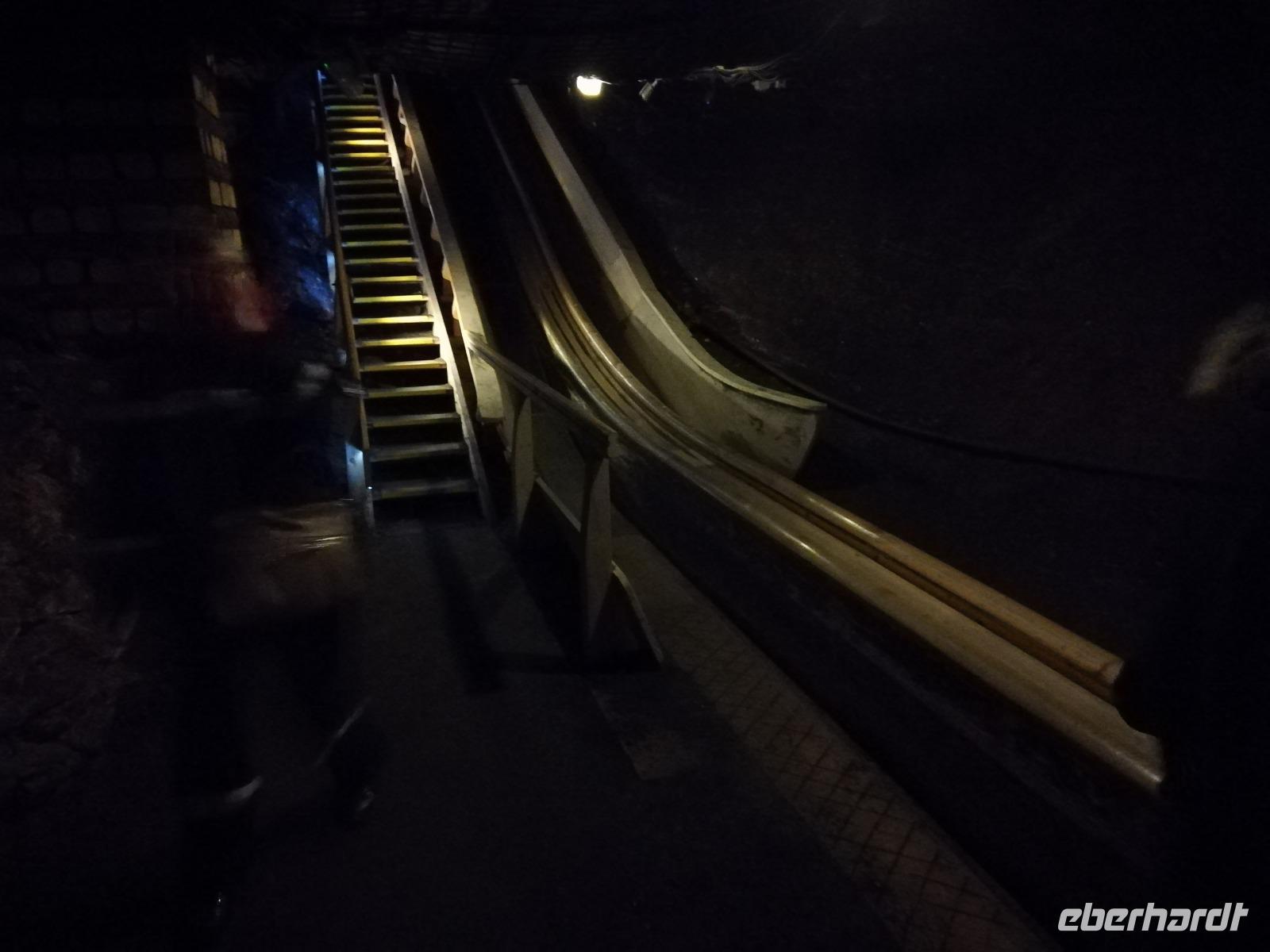 Ziel ist das über 500 Jahre alte Salzbergwerk. Nicht alle unserer Gäste wollten das Abenteuer Einfahrt ins Bergwerk mitmachen, aber der größte Teil schon. Jeder der Einfahrenden erhält einen Overall als Schutzanzug und dann wird auf einer Kleinbahn aufgesessen und los geht die Fahrt hinein ins Bergwerk. Ca. 600 m lang ist die Bergstrecke von Schauelementen unterbrochen und von den Erklärungen des Bergwerkführers. Dann geht es tief hinunter und wer will, kann die zwei polierten Holzrutschbahnen benutzen, wer das nicht will, kann einen parallel dazu verlaufenden Weg nehmen. Schließlich gelangt man zu einem unterirdischen See, über den man mit einem fest installierten Fahrzeug hinübergefahren wird. Dort wartet bereits die Kleinbahn und wir fahren alle, mit einem großen Erlebnis reicher, wieder ans Tageslicht hinauf.