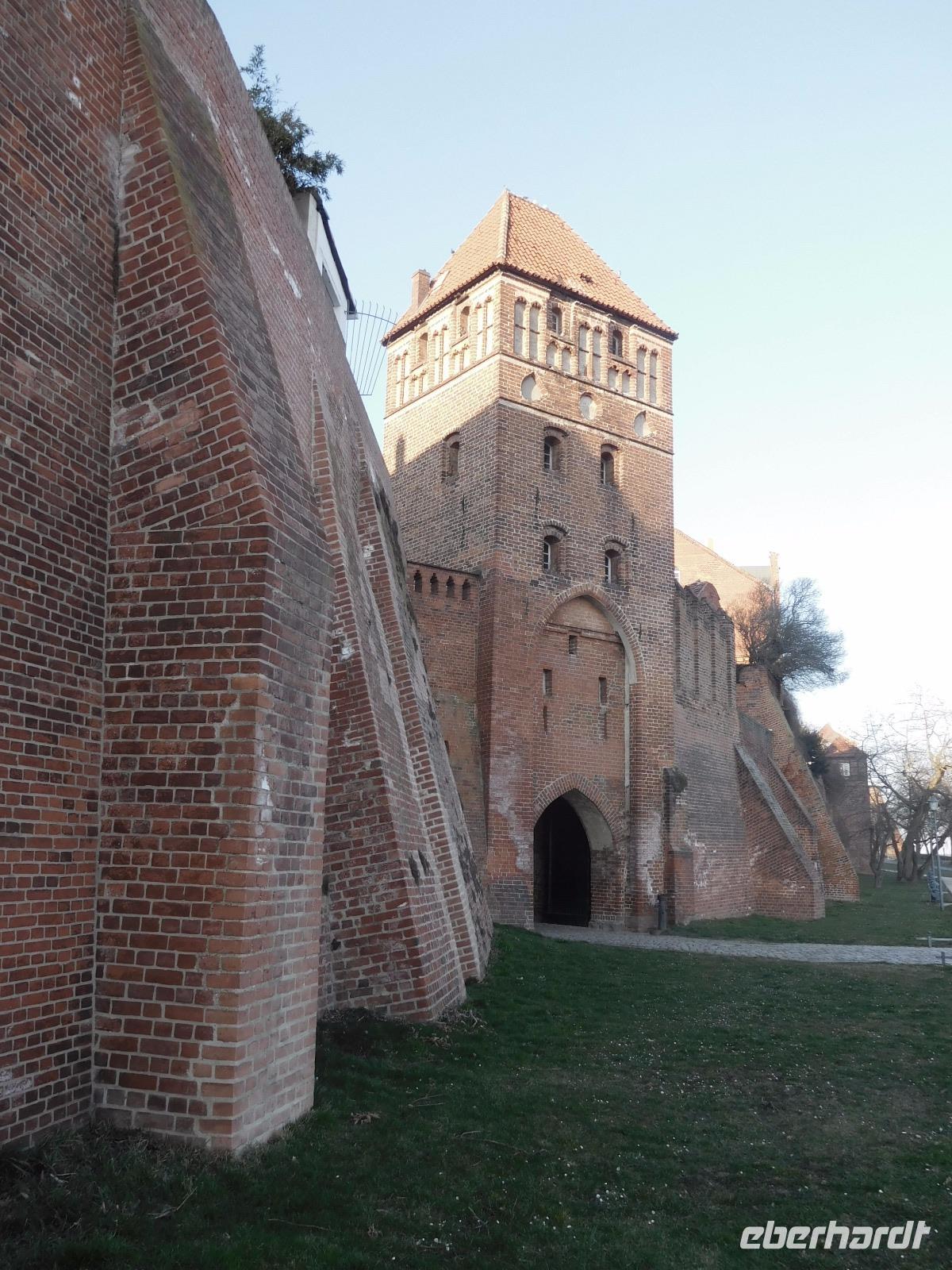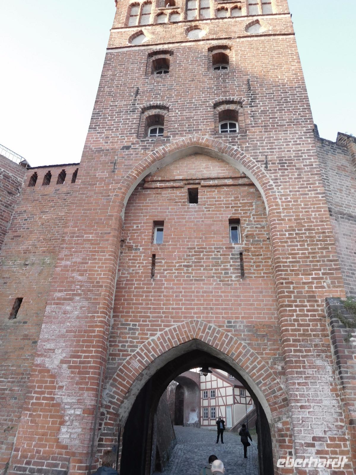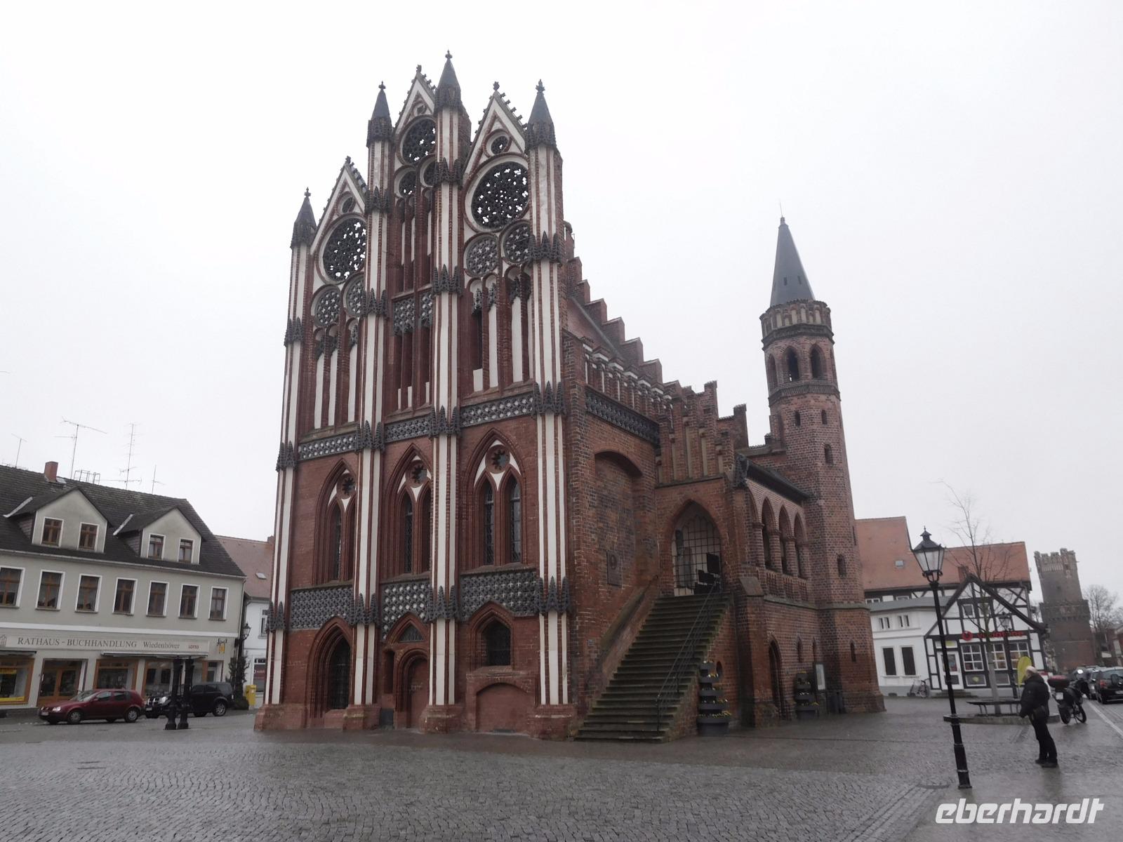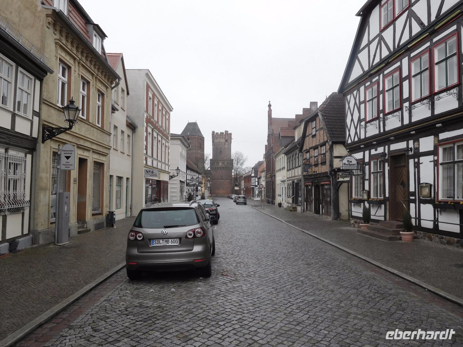 Nach Frühstück im Hotel und Koffer laden folgte noch einmal ein Spaziergang durch das alte Tangermünde. Was wir am Vortage aufgrund schwindender Lichtverhältnisse nicht mehr gesehen hatten, folgte heute: die Tangermünder Burg, die heute zum größten Teil vom Gelände des Schlosshotels eingenommen wird. Ursprünglich war das wuchtige Backsteinbauwerk ein Objekt zur Sicherung und Verteidigung der deutschen Außengrenzen, bis diese sich im Zuge der sog. „Ostexpansion" der deutschen Könige und Kaiser so weit nach Osten verschoben, dass das Hafenstädtchen weit im Landesinneren lag. Kaiser Karl IV., der überwiegend in Prag residierte, ließ die Burg als weitere Residenz schlossähnlich ausbauen und später taten es ihm die zunächst hier residierenden Hohenzollern gleich. Tor, alte Kanzlei und Bergfried, sowie einige weitere Details und Mauern der weitläufigen Anlage sind aus dieser Zeit noch erhalten. Von der Tangermünder Burg ging es, am Torturm, des Hühnerdorfer Tores und vielen Fachwerkhäusern vorbei die lange Hauptstraße entlang zum Neustädter Tor. Unbedingt bemerkenswert ist der Marktplatz, den sein Rathaus mit seiner prachtvollen Schaufassade beherrscht. Das Gebäude und seine malerische gotische Backsteinfassade werden dem im 15. Jh. in der Gegend wirkenden Baumeister Hinrich Brunsberg zugeschrieben. Auf jeden Fall bleibt das Bauwerk im Gedächtnis!