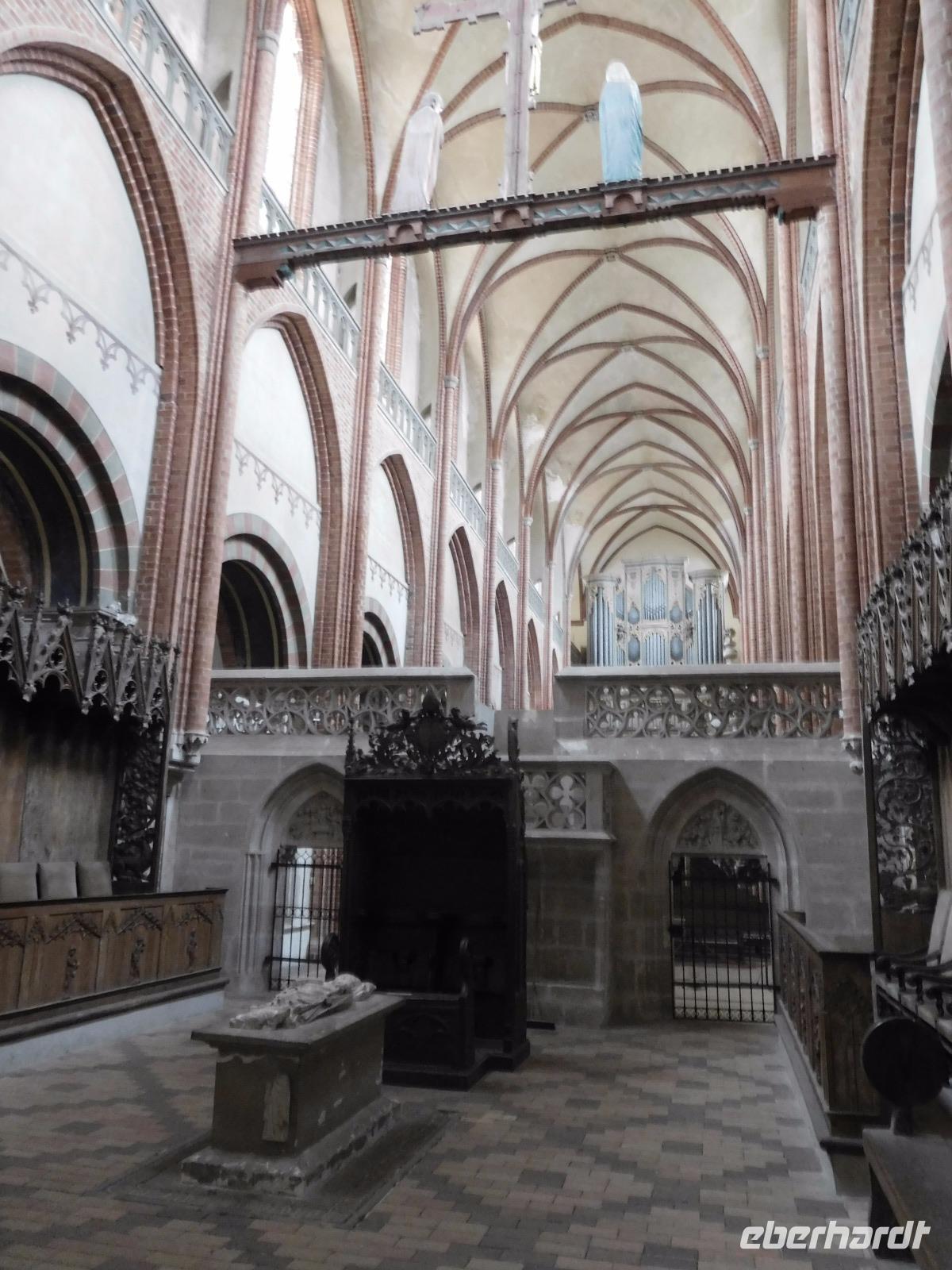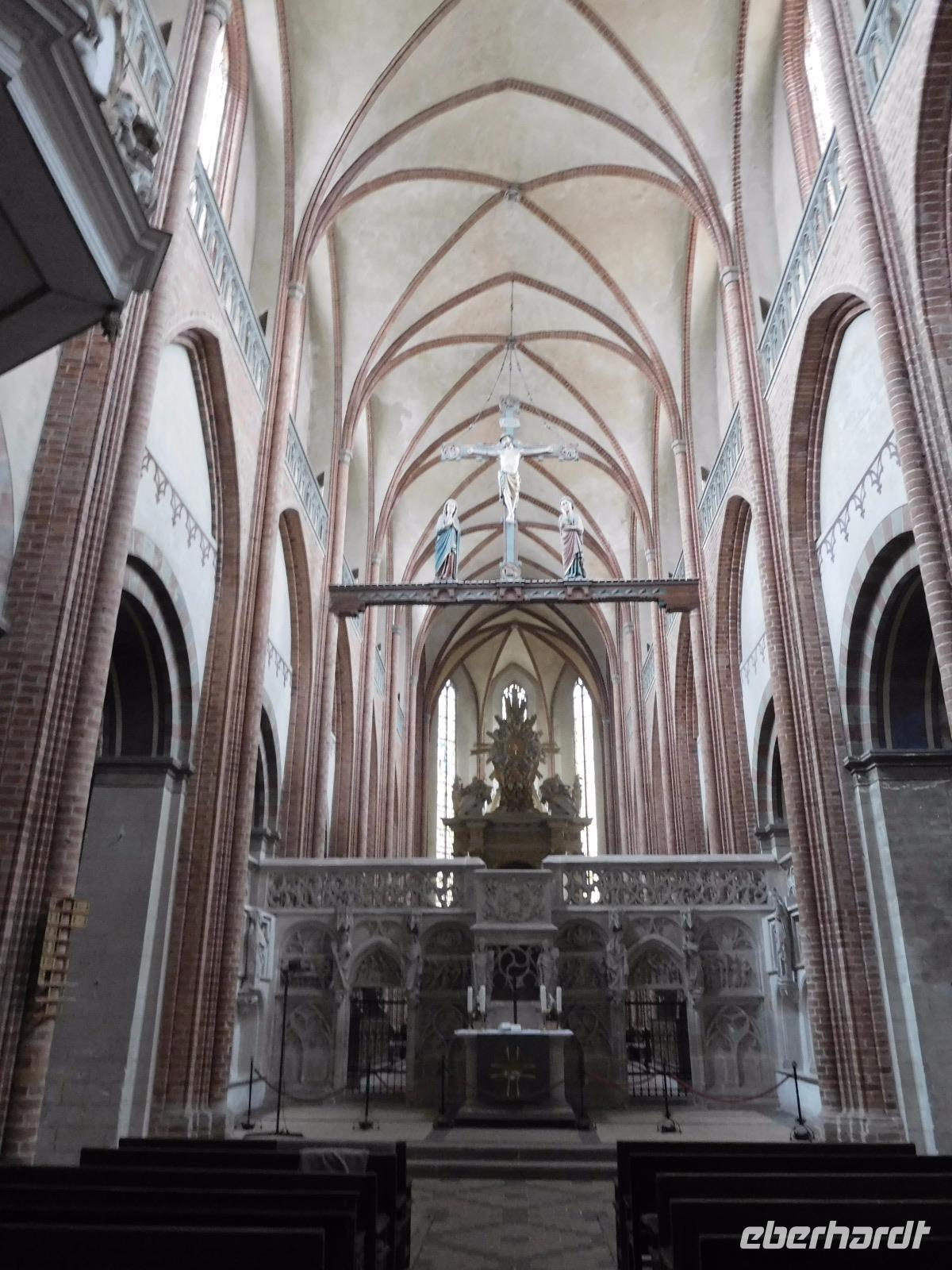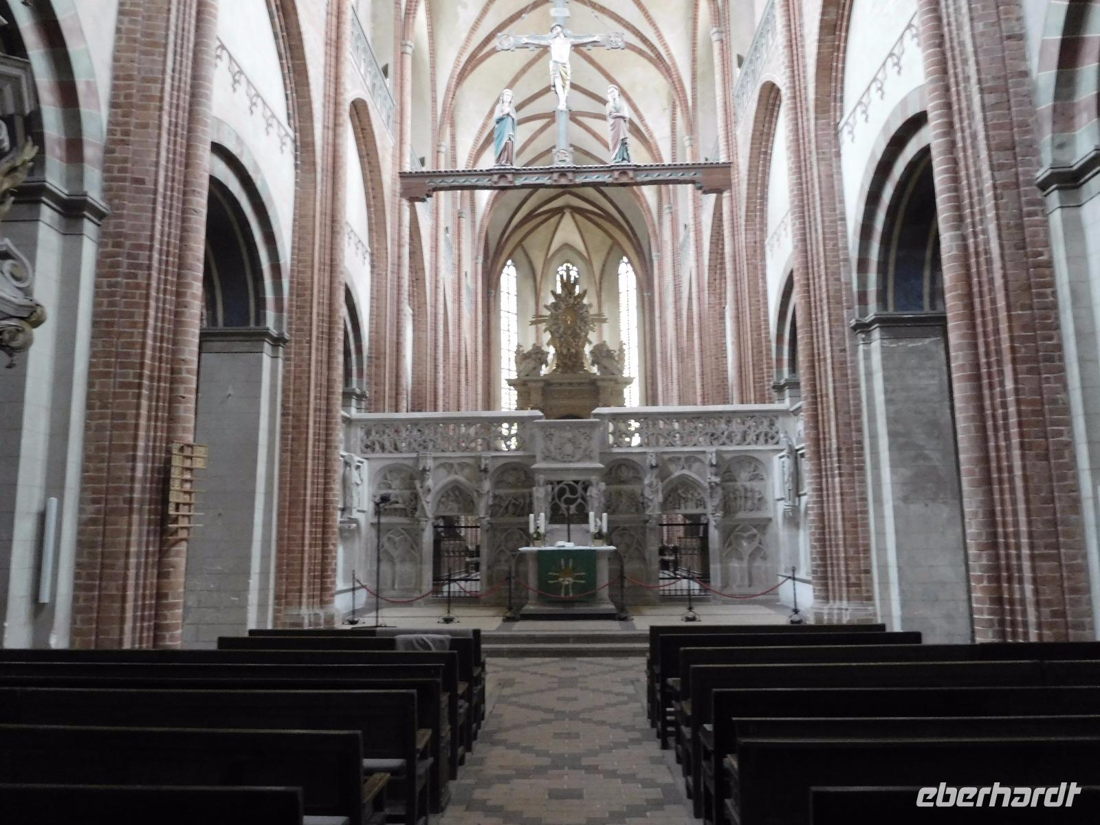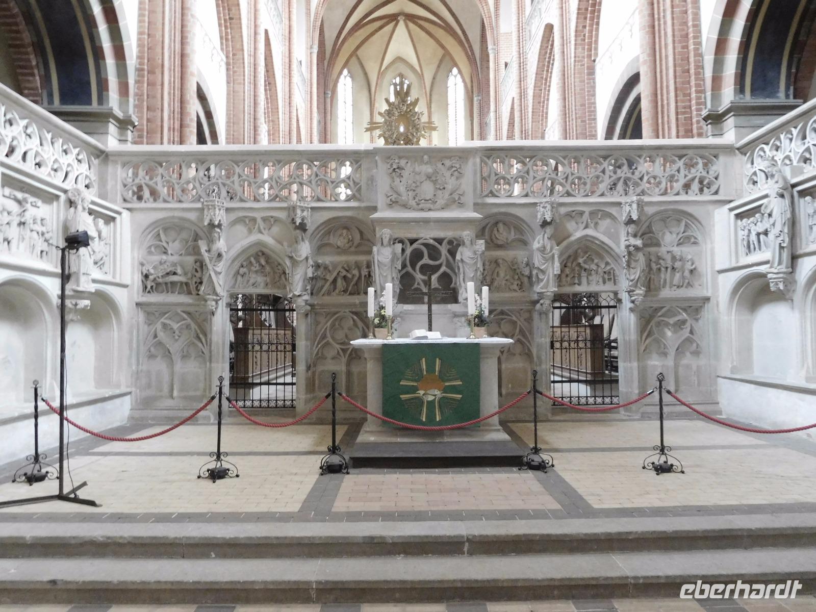 Ähnliches kann man gewiss auch von unserem nächsten Ziel sagen, dem Dom St. Marien zu Havelberg. Auch dieses mächtige Gebäude dominiert eine alte Hansestadt. Auf einem Bergsporn über der auf einer Havelinsel gelegenen Havelberger Altstadt stehend, ist es seit Jahrhunderten ein Zeichen für Missionsarbeit und Christianisierung. Zusammen mit den - ebenfalls damals neu gegründeten Bistümern Brandenburg und Lebus sollte von hier aus das Wort Gottes in Richtung Osten, zu den hier siedelnden Slawenstämmen verbreitet werden. So kam dem Havelberger Dom eine politische und historische Schlüsselrolle für ganz Nord- und Mitteldeutschland zu. Der Sakralbau hat denn auch eine immense Raumwirkung, die dennoch alle Blicke zu dem prachtvollen Lettner aus dem 15. Jh. lenkt. 20 Reliefs und 14 Skulpturen stellen insbesondere Szenen aus dem Leben Jesu Christi dar und dienten - wie in solchen Kirchen zumeist auch die kunstvollen Buntglasfenster - mit ihren Figuren und Szenereien wie ein Bilderbuch - mussten Sie doch das Wort Gottes und die hier gehaltenen Predigten für die Mehrheit der Bevölkerung, die nicht lesen und schreiben konnte, illustrieren.