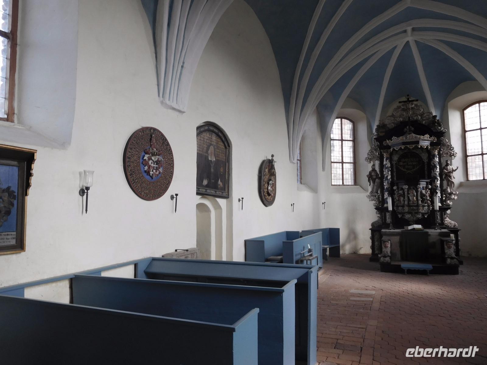 Anschließend an unseren Spaziergang fuhren wir auf der Autobahn nach Deutschland zurück, an Fürstenwalde dem Hauptort des Berliner Urstromtales und des Lebuser Landes, vorbei in das winzige Dörfchen Tempelberg. Die hiesige alte, 1244 gegründete Templerkirche gehört zu den Baudenkmalen, die dieser Orden der Mönchsritter in der Mark Brandenburg hinterlassen hat. Neben Tempelhof, heute Ortsteil von Berlin, ist nur das nahegelegene Lietzen, eines unserer nächsten Ziele, als historische Komturei belegt und erhalten. Mehrere Dependancen, Templerkirchen und Wirtschaftshöfe, vielleicht auch ehemalige Verwaltungsgebäude etc. hat der Orden im 13. Jh. von seinen Komtureien aus gegründet - fast immer etwas erhaben liegend und mit Fischteichen in der Nähe - unter anderem, um die Ernährung in Fastenzeiten und an Fasttagen - z.B. immer freitags - zu sichern. Da sich in Tempelberg sogleich der nette Herr einfand, der über den Kirchenschlüssel gebietet, konnten wir uns die Dorfkirche - wie alle ursprünglichen Templerkirchen als Saalkirche mit nur einem Hauptraum konzipiert - auch von innen ansehen. Nicht allzuweit entfernt liegt Marxdorf, dessen Dorfkirche ebenfalls auf eine Templergründuing zurückgeht, die wir aber nur von außen ansehen konnten. Der dritte Ort in der Nähe - auch er mit „sprechendem" und auf die Templer deutenden Namen, war die Neuentempel. Dessen wehrhafte Dorfkirche war wiederum offen, so dass wir an diesem Tag mehrere der historischen Räumlichkeiten ansehen konnten.