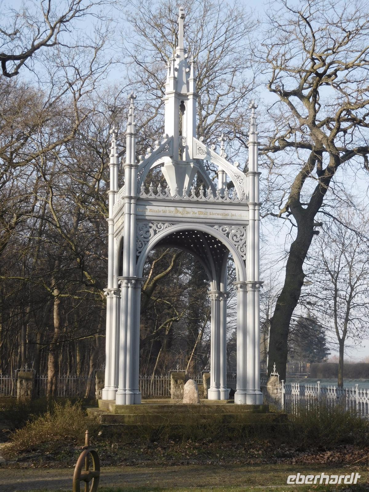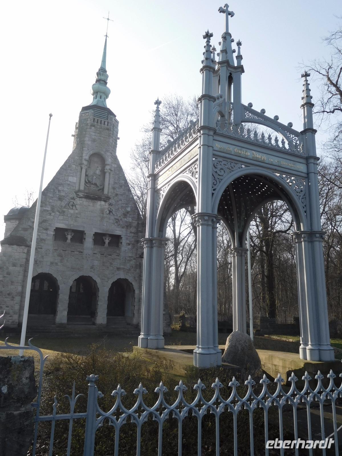 Unsere kleine Tour startete am Flughafen Dresden gegen 06.00 Uhr, und eine knappe Stunde später war am Busbahnhof Chemnitz mit dem letzten Zustieg unsere kleine Reisegruppe komplett. Wir fuhren in nördlicher Richtung an Leipzig vorbei und hatten dann schon den ersten Fotostopp: nicht nur an der Wasserburg im Zentrum des Städtchens Lützen, sondern gleich darauf auch an der Gedenkstätte, die bei Lützen für den hier 1632 in einer Schlacht des 30jährigen Krieges gefallenen Schwedenkönig Gustav Adolf II. errichtet wurde. Neben der erst 1907 aus einer Spende begüterter Schweden entstandene Gedenk-Kapelle, zieht vor allem der schlichte Gedenkstein für den Gefallenen und der darüber im 19. Jh. nach einem Entwurf Karl Friedrich Schinkels errichtete gusseiserne Baldachin die Aufmerksamkeit auf sich.