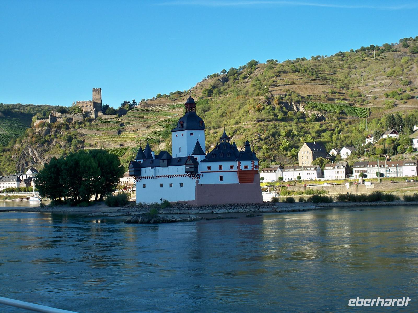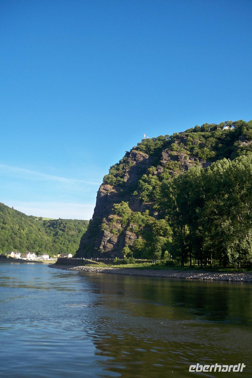 Malerisch direkt im Rhein gelegen, die Reichsgrafenpfalz, oder auch „Die Pfalz im Rhein" genannt. Dort wendete unser Schiff und wir fuhren in Richtung St. Goar. Unser Kapitän gab interessante Informationen zu den Sehenswürdigkeiten am Ufer des Rheins und schon bald erreichten wir den sagenumwobenen „Loreleyfelsen".