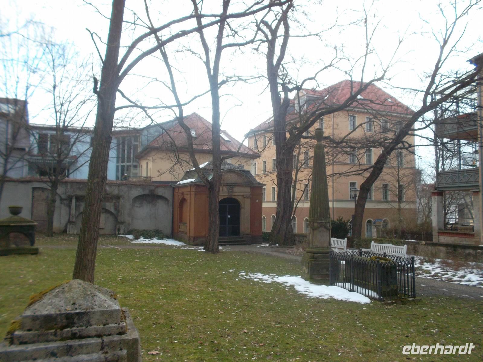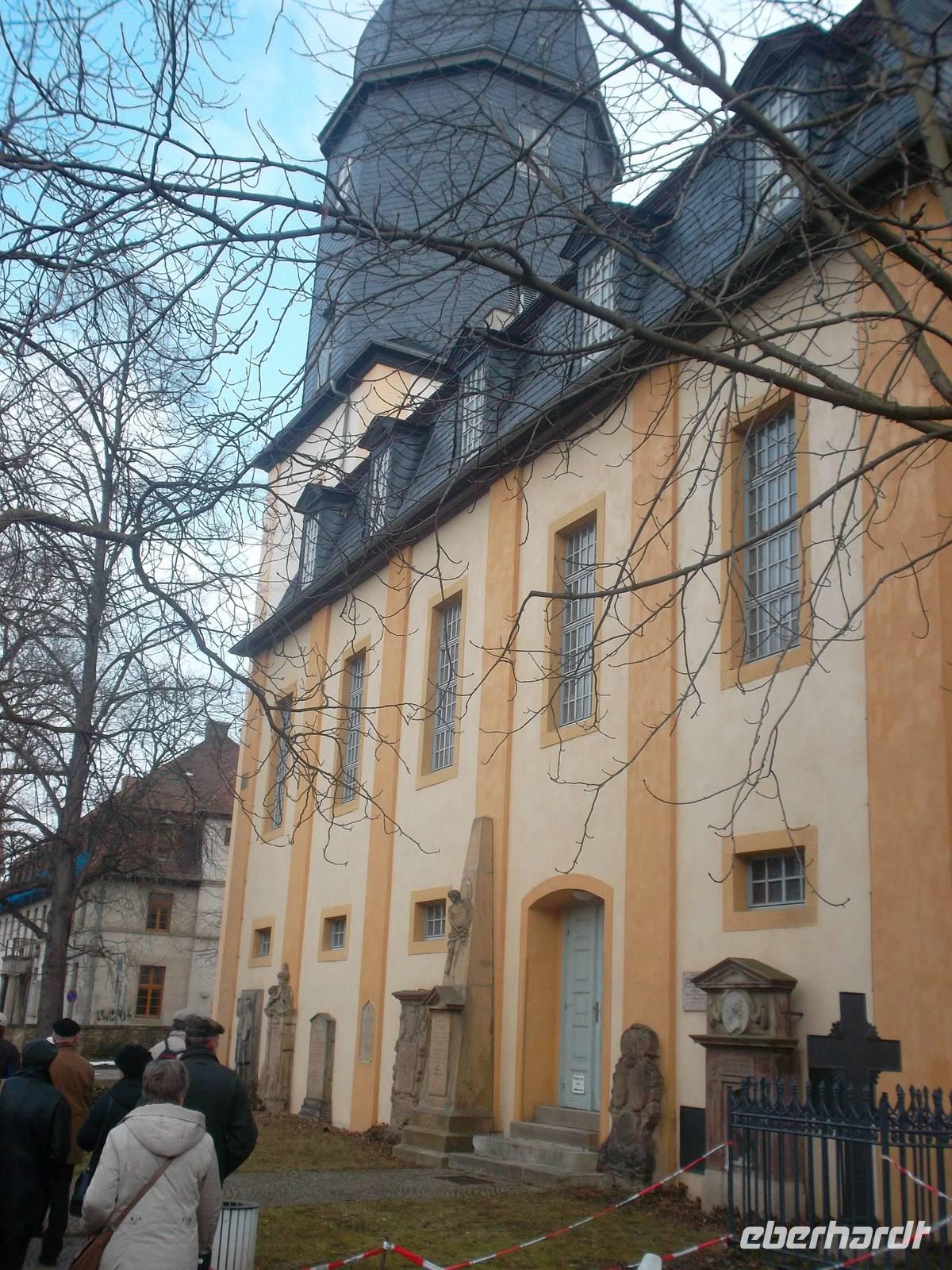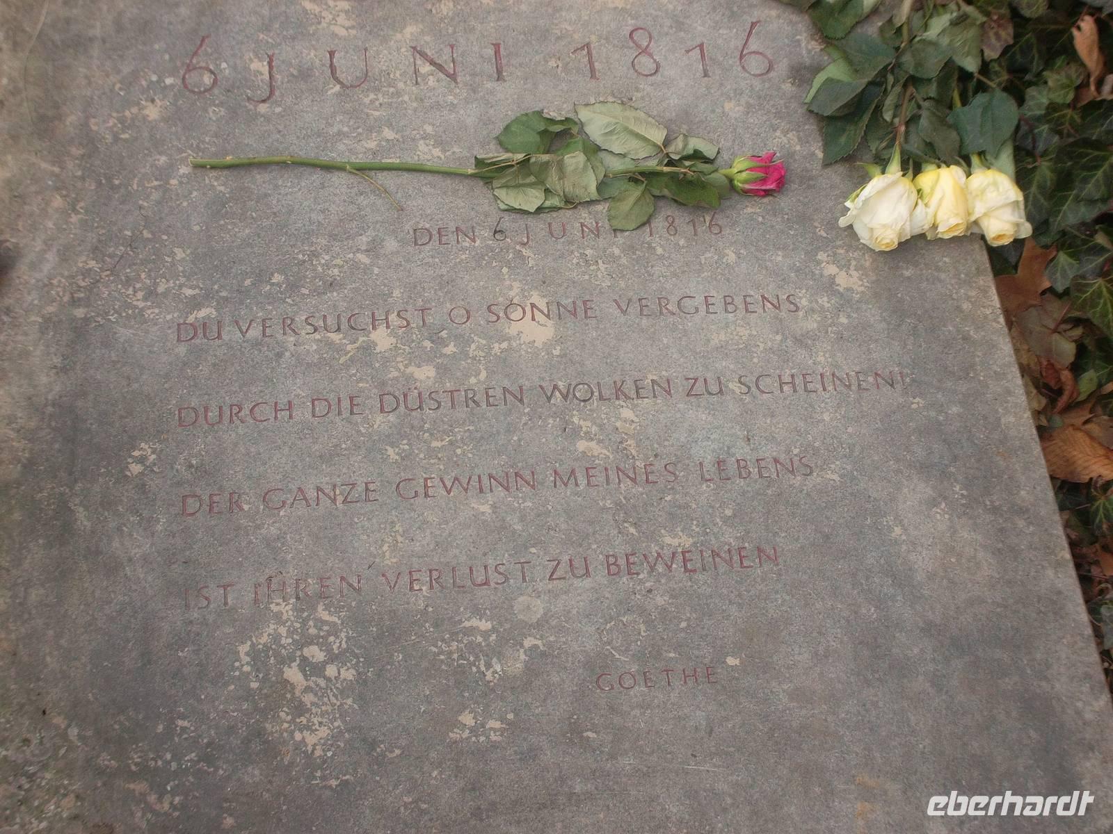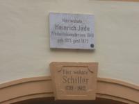Unsere Stadtführung erläuterte dies, begann aber unerwarteterweise nicht mit einem Einblick in die hohe Klassik, sondern mit einem Besuch des Umfeldes der barocken Jakobskirche, in deren Sakristei einst Johann Wolfgang von Goethe seine Christiane Vulpius heiratete, die einzige Frau, die ihm je angetraut wurde. Auch ihr Grabmal, auf dem Goethe mit schlichtem Spruch ihren Verlust betrauert, ist hier neben denen anderer berühmter Leute zu sehen. Natürlich gelangten wir auch noch in die „klassische" Innenstadt, sahen das Weimarer Nationaltheater mit dem berühmten Goethe- und Schiller-Denkmal, das 1857 der Dresdner Bilhauer Ernst Rietschel schuf und wir sahen Stadtschloß und Park Belvedere und das Wittumspalais, in dem Fürstin Anna Amalie ihre letzten Jahre verbrachte. Der Rundgang führte an der berühmten Herzogin-Anna-Amalie-Bibliothek vorbei, wir warfen einen - wenn auch entfernten - Blick auf Goethes Gartenhaus, entdeckten Schillers Wohnhaus und endeten schließlich an Goethes Wohnhaus am Frauenplan. Nach etwas Zeit zum individuellen Umgang mit der klassischen Stätte bestiegen wir wieder den Bus und waren bereits auf dem Weg zur nächsten Welterbestätte!
