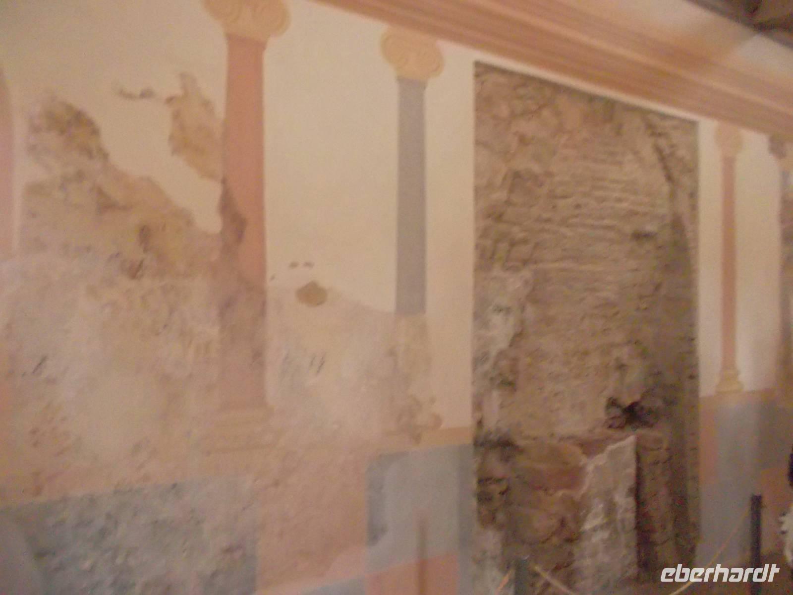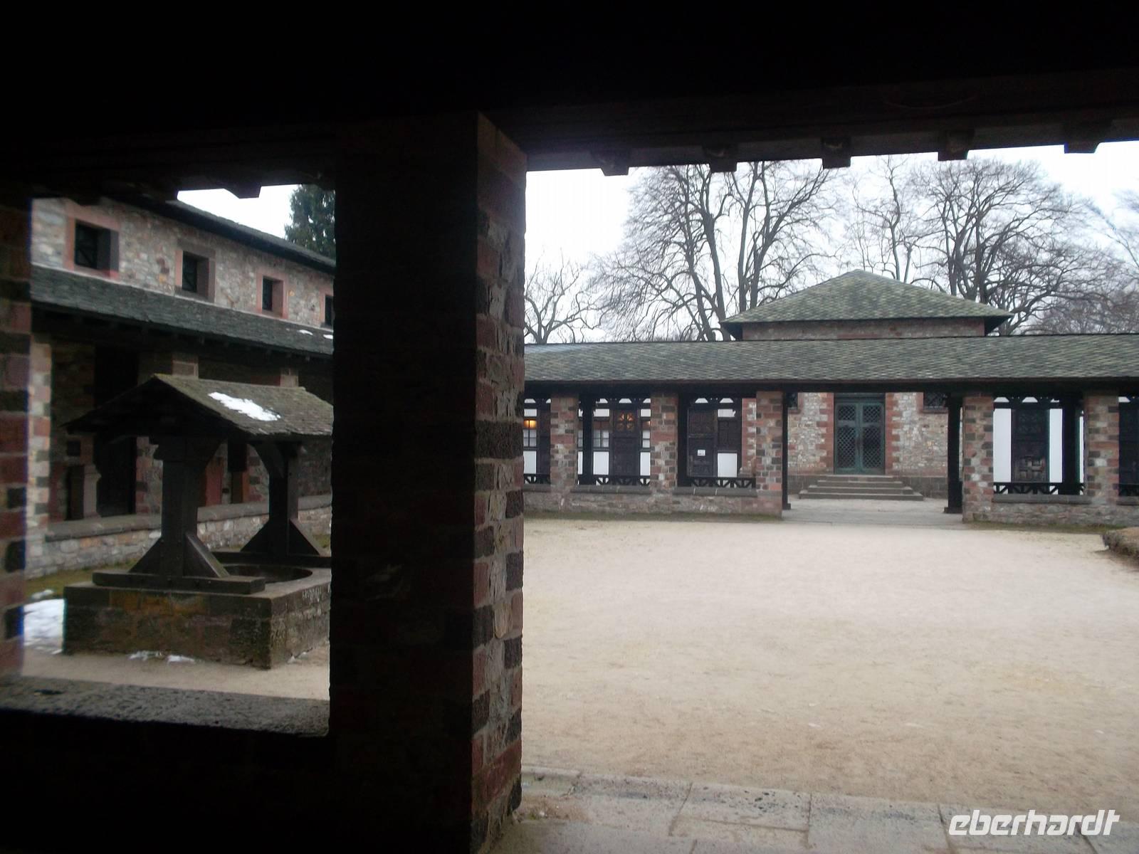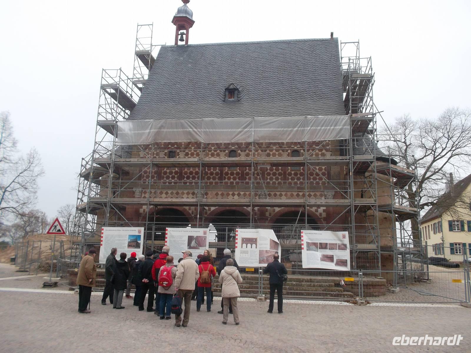 Unsere nächste Besichtigung führte auch in die Vergangenheit, auch wenn es diesmal nicht Jahrmillionen waren. Das Kloster Lorsch entstand zur Zeit Karls des Großen und vom ehemaligen Reichskloster ist noch eine Torhalle aus fränkischer Zeit enthalten. Eine kleine Führung zeigte uns das Klostergelände und den - derzeit leider wegen Renovierung eingerüsteten - karolingischen Torbau, den man auch die „Königshalle" nennt. Vielleicht ist es auf den ersten Blick nicht so spektakulär wie andere Klöster, da kaum noch Reste ausserhalb der Torhalle erhalten sind, aber an diesem Bau läßt sich für Experten vieles zur Geschichte und Architektur ablesen. Auch ein Originalblatt einer Handschrift aus der einst reichen Klosterbibliothek konnten wir noch in der Ausstellung des Klosters Lorsch sehen, das in der Sprach- und Literaturgeschichte auch für sein einst reichverziertes „Lorscher Evangeliar", eine karolingische Bilderhandschrift sowie für den in althochdeutscher Sprache abgefaßten „Lorscher Bienensegen" und den mittelhochdeutschen Codex mit der Klostergeschichte bekannt ist.