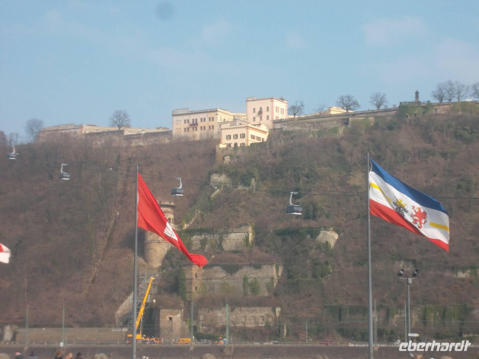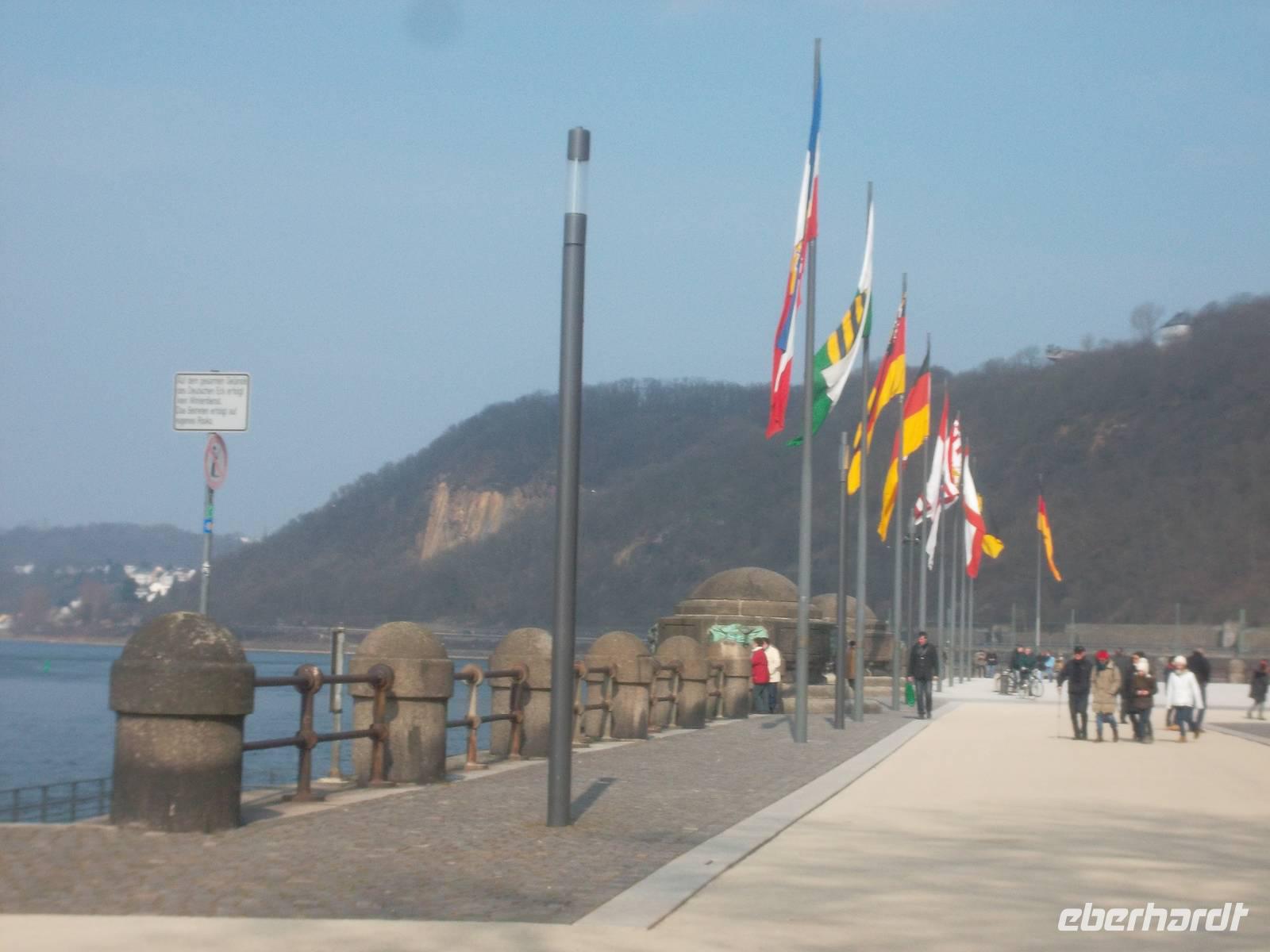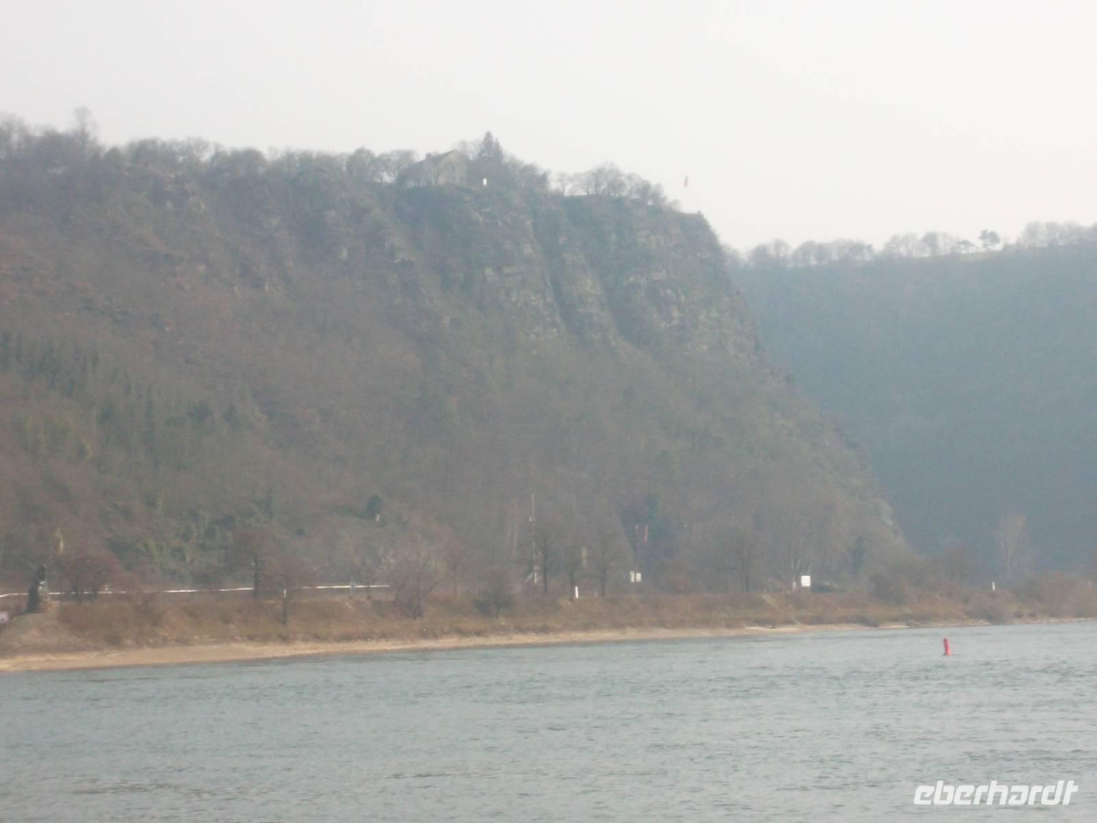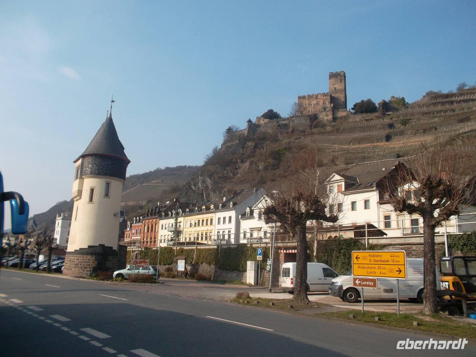 Nach Köln fuhren wir mit Dem Bus zunächst nach Koblenz und von dort ging es rheinabwärts weiter. Auch das Mittelrheintal ist UNESCO-Weltkultur- und Naturerbe - wgen des Erscheinungsbildes des Rheintals und der Kulturlandschaft mit Burgen, Schlössern, beschaulichen Orten und Weinbergen. Koblenz, mit seinem Wahrzeichen, dem Deutschen Eck am Zusammenfluß von Rhein und Mosel, erreichten wir nachmittags. Hier gab es natürlich eine Fotopause und ab hier gab es bis zum Abend Sonnenschein, auch wenn es immer noch kalt war. Eigentlich könnte man, am Rhein entlang fahrend, alle paar Meter stehenbleiben und Fotos machen. So mußten wir uns, nachdem wir nach dem Deutschen Eck wieder in den Bus gestiegen waren und auf dem rechtsrheinischen Ufer nach Rüdesheim fuhren, entscheiden, denn alles wäre beim besten Willen nicht zu schaffen gewesen. Daher hielten wir unterhalb der Marksburg und der Burg Katz zum Fotostopp und dann nochmals nahe dem Loreleyfelen, im Ort Lorch und an der Burg Pfalzgrafenstein, die wie ein steinernes Schiff mitten im Rhein liegt. Früher hat man von hier eine Kette zu den Rheinufern gezogen und der Schifffahrt den Weg versperrt, um Wegezoll zu kassieren. Abends waren wir dann im bekannten Weinort Rüdesheim und wohnten in einem Hotel am Rheinufer, genau neben der berühmten Drosselgasse.