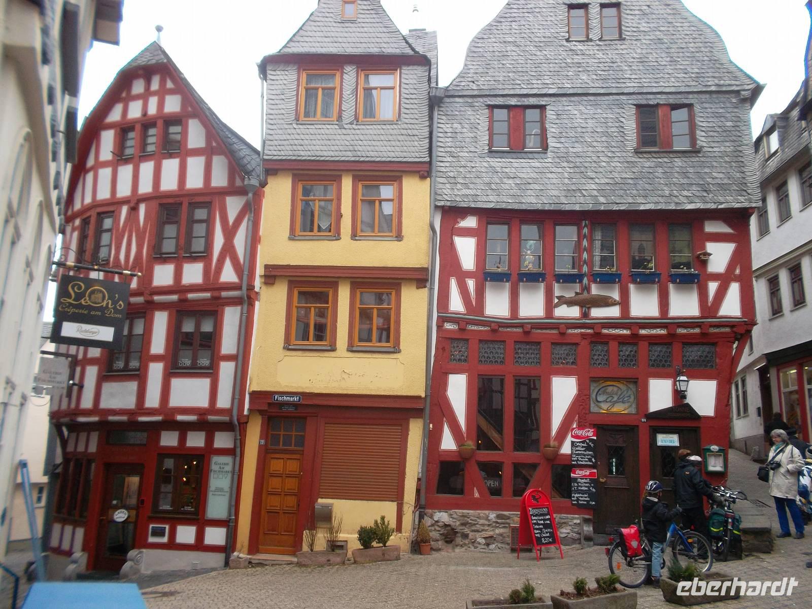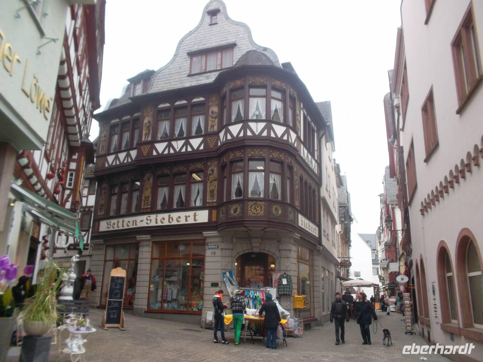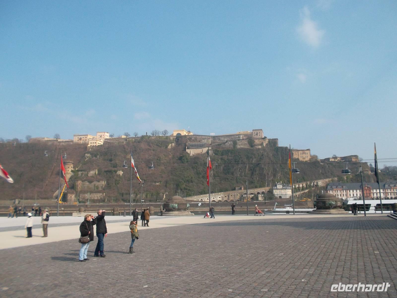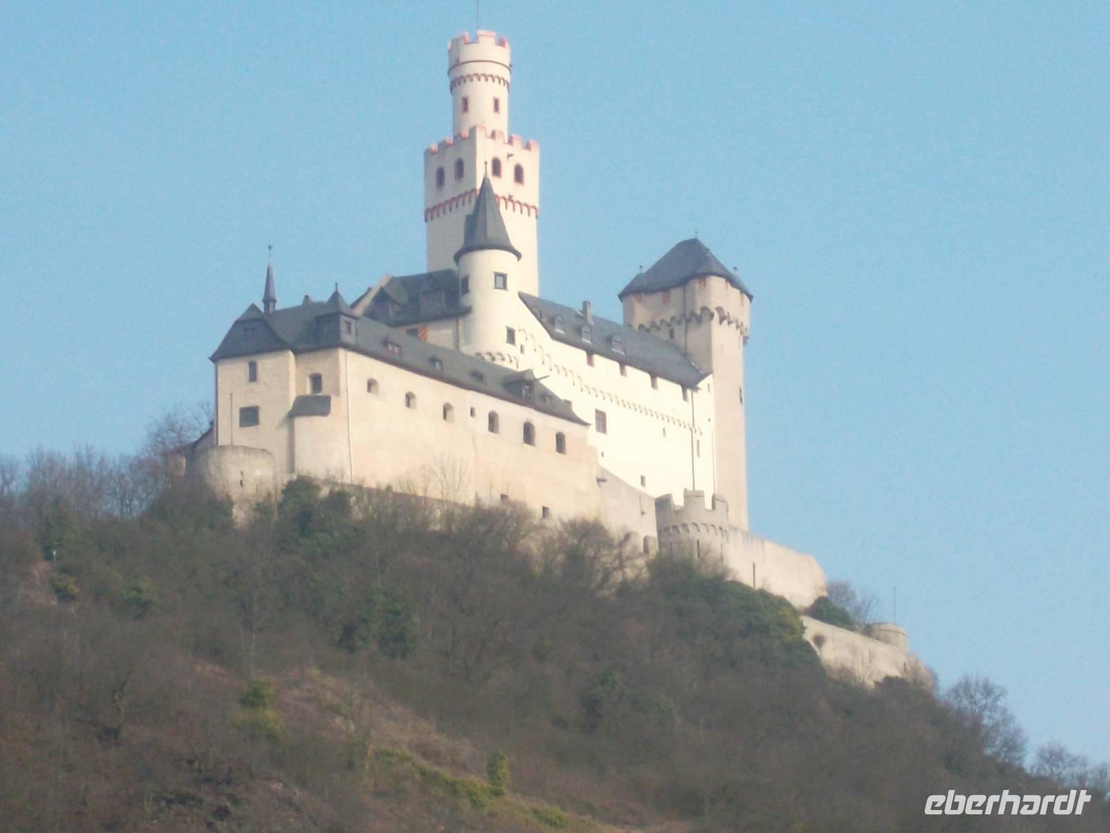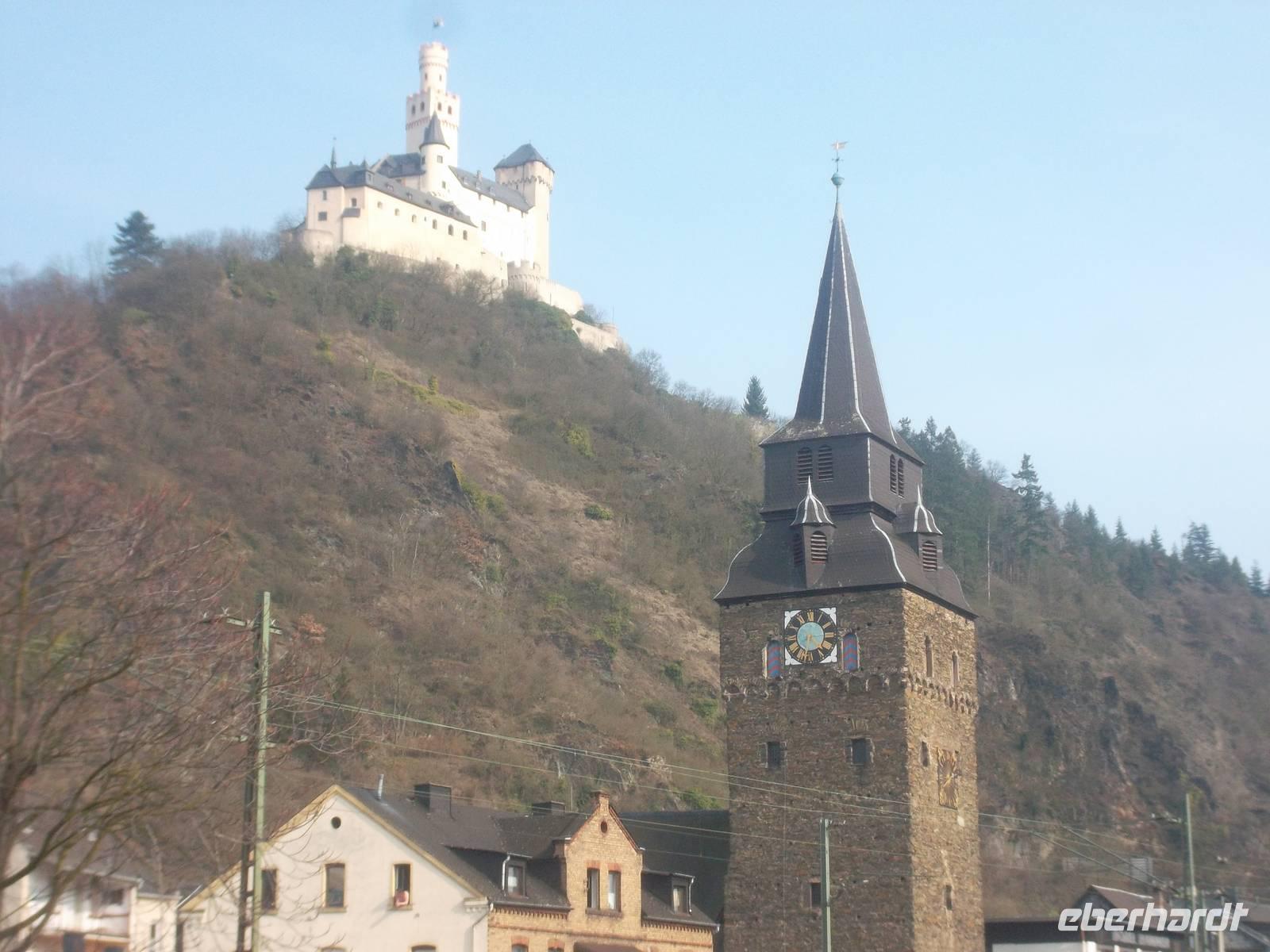 Nach Köln fuhren wir mit Dem Bus zunächst nach Koblenz und von dort ging es rheinabwärts weiter. Auch das Mittelrheintal ist UNESCO-Weltkultur- und Naturerbe - wgen des Erscheinungsbildes des Rheintals und der Kulturlandschaft mit Burgen, Schlössern, beschaulichen Orten und Weinbergen. Koblenz, mit seinem Wahrzeichen, dem Deutschen Eck am Zusammenfluß von Rhein und Mosel, erreichten wir nachmittags. Hier gab es natürlich eine Fotopause und ab hier gab es bis zum Abend Sonnenschein, auch wenn es immer noch kalt war. Eigentlich könnte man, am Rhein entlang fahrend, alle paar Meter stehenbleiben und Fotos machen. So mußten wir uns, nachdem wir nach dem Deutschen Eck wieder in den Bus gestiegen waren und auf dem rechtsrheinischen Ufer nach Rüdesheim fuhren, entscheiden, denn alles wäre beim besten Willen nicht zu schaffen gewesen. Daher hielten wir unterhalb der Marksburg und der Burg Katz zum Fotostopp und dann nochmals nahe dem Loreleyfelen, im Ort Lorch und an der Burg Pfalzgrafenstein, die wie ein steinernes Schiff mitten im Rhein liegt. Früher hat man von hier eine Kette zu den Rheinufern gezogen und der Schifffahrt den Weg versperrt, um Wegezoll zu kassieren. Abends waren wir dann im bekannten Weinort Rüdesheim und wohnten in einem Hotel am Rheinufer, genau neben der berühmten Drosselgasse.