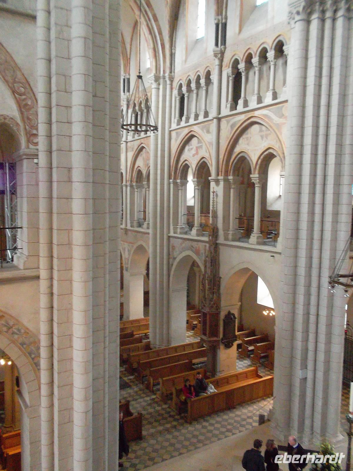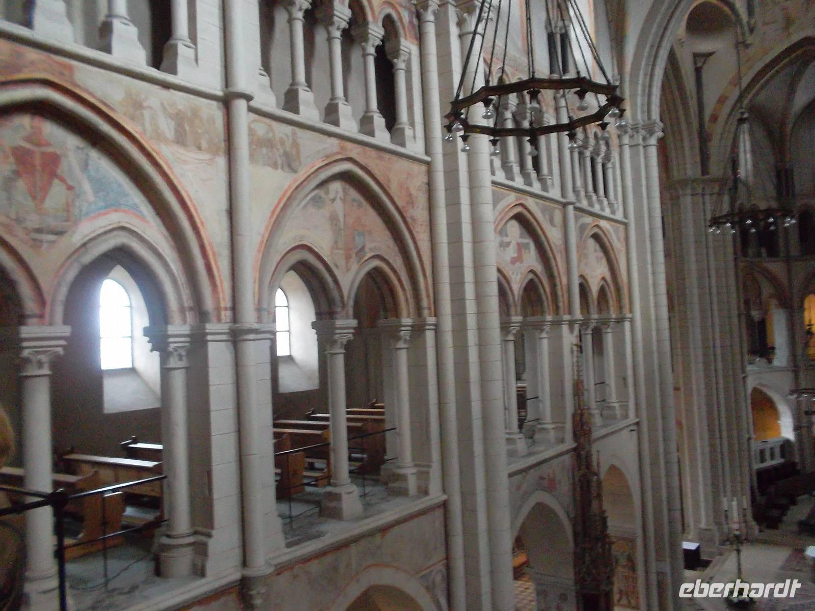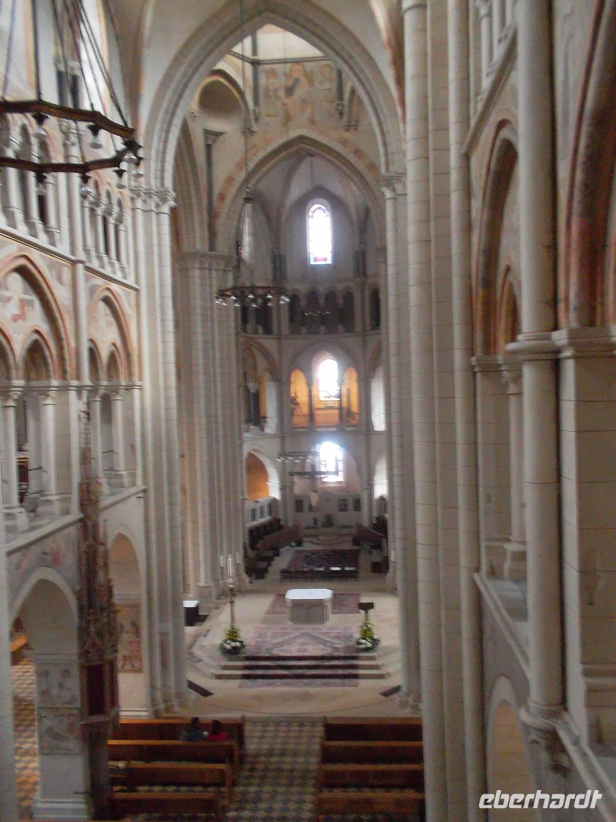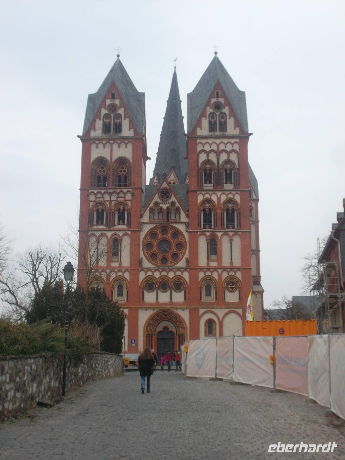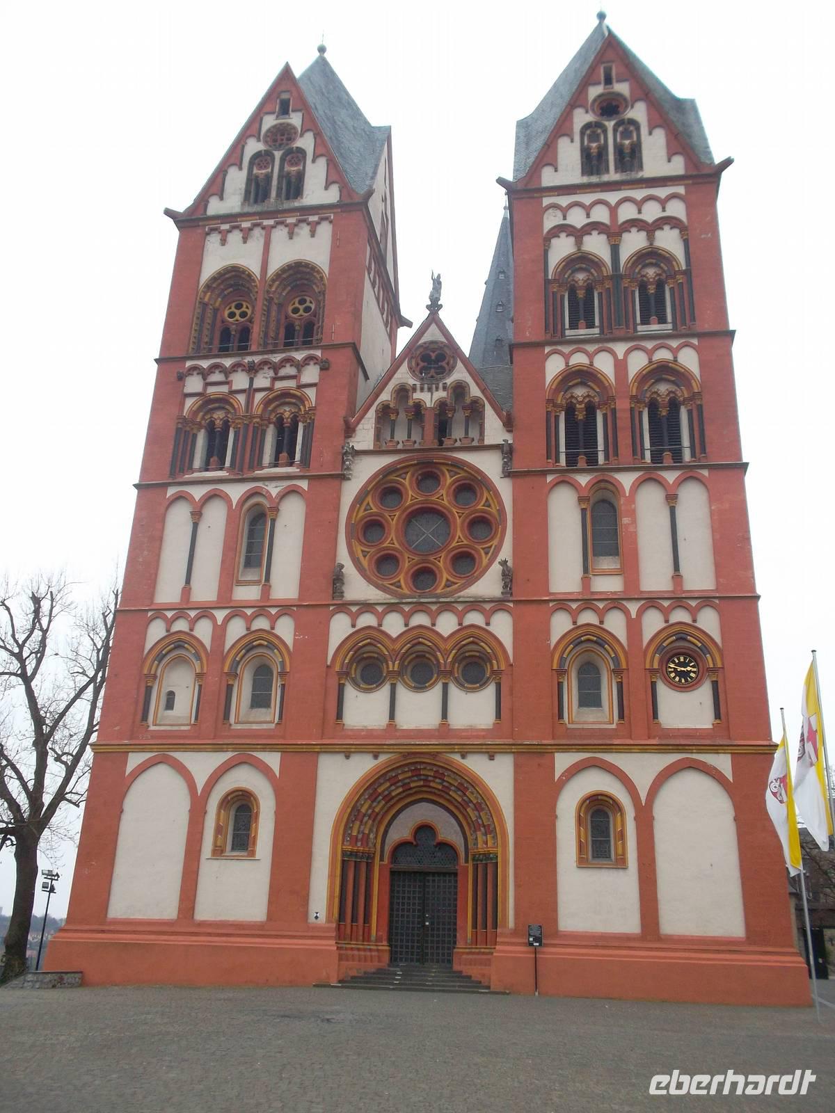 Gegen Mittag ging es weiter und wir erreichten kurz darauf die alte Stadt Limburg an der Lahn. Eine schöne Fachwerkaltstadt erwartete uns, vor allem aber ein herrlicher Kirchenbau, der den Ort überragt. Der Georgsdom in Limburg vereinigt spätromanische und frühgotische Elemente und entstand im ausgehenden 12. und beginnenden 13. Jh. Obwohl seine Ausmaße - verglichen mit anderen Domen - eher bescheiden sind, prägt er mit seiner reichgegliederten Westfassade und den immerhin sieben Türmen maßgeblich das Stadtbild. Baugeschichte und Besonderheiten des Gotteshauses wurden uns bei einer sehr engagierten Domführung durch Schwester Elisabeth vom Domstift nahegebracht. Sowohl die Fassadengliederung als auch ihr architektonisch überreich durchgestalteter Innenraum bringen eine gewaltige Wirkung dieser Prachtkirche hervor, die seit Gründung des Bistums Limburg 1827 auch dessen Kathedrale ist - errichtet in der für die Romanik so typischen Bauform, einer Basilika.