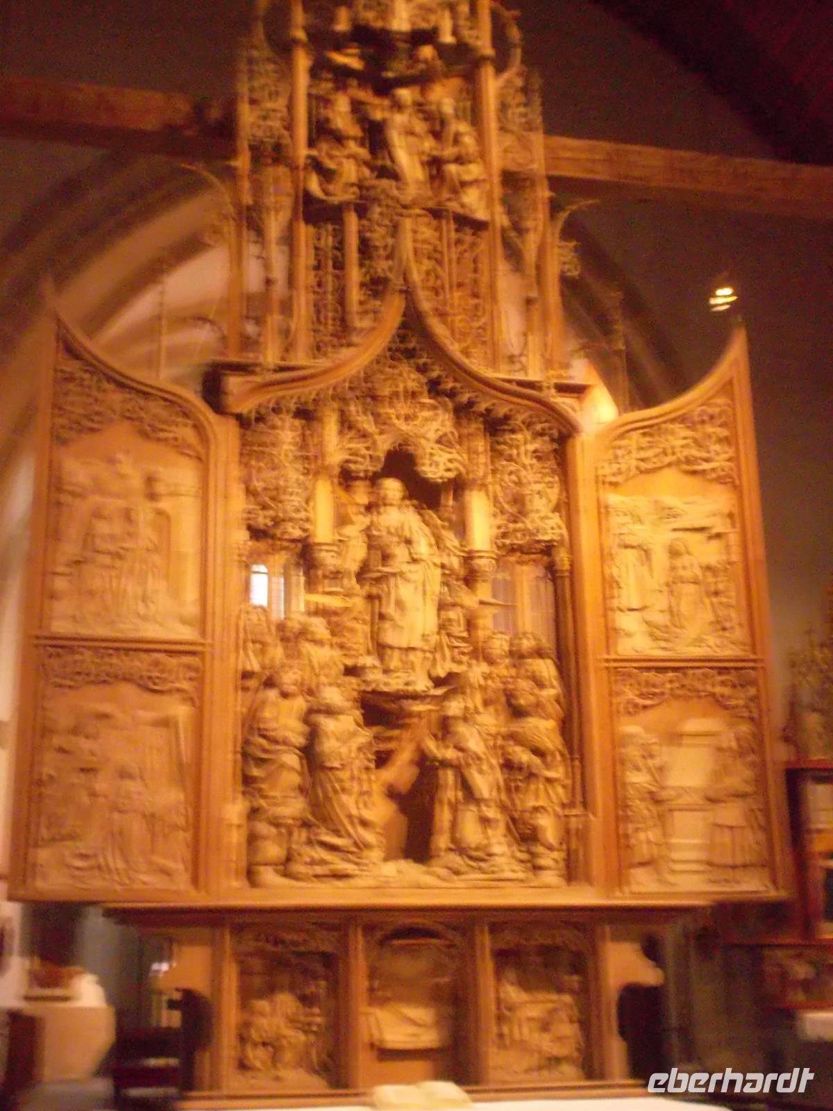 Auf der Weiterfahrt nach Würzburg konnten wir noch ein tolles „Extra" einbauen - wir fuhren ein Stück die „Romantische Straße" und das liebliche Taubertal entlang. Auch unser Tagesziel Würzburg lag an der Romantischen Straße, wir aber wollten nach Passieren der hübschen Orte Bad Mergentheim mit dem Deutschordensschloß und der Stadt Weikersheim mit ihrem Barockschloß, dem schönsten Schloß derer von Hohenlohe, den Reisegästen noch den herrlichen Schnitzaltar von Tilmann Riemenschneider in der Herrgottskirche des kleinen Ortes Creglingen zeigen. Einer Sage nach fand Ende des 14.Jh. ein Bauer beim Pflügen im Tal des Hergottstalbachs in der Nähe von Creglingen eine unversehrte Hostie. Dies galt natürlich als ein Wunder und um es zu ehren, wurde genau dort die Herrgottskirche errichtet, von einem Hohenlohe-Braunecker Fürsten gestiftet. Um 1505 schuf Tilman Riemenschneider, Würzburgs begnadetster Künstler, für diese Kirche den berühmten Marienaltar, den man wegen seines Standorts auch „Creglinger Altar" nennt. Bis heute gehört dieses Schnitzwerk zu den wundervollsten Kunstwerken, die je ein Bildhauer schuf - eigentlich hätte auch dieser Altar den Status als Weltkulturerbe verdient. Unsere Gäste waren davon jedenfalls sehr begeistert. Später erreichten wir unser an der Würzburger Innenstadt gelegene Hotel „Strauß", wo man dankenswerterweise für uns schon einen Busparkplatz reserviert hatte.