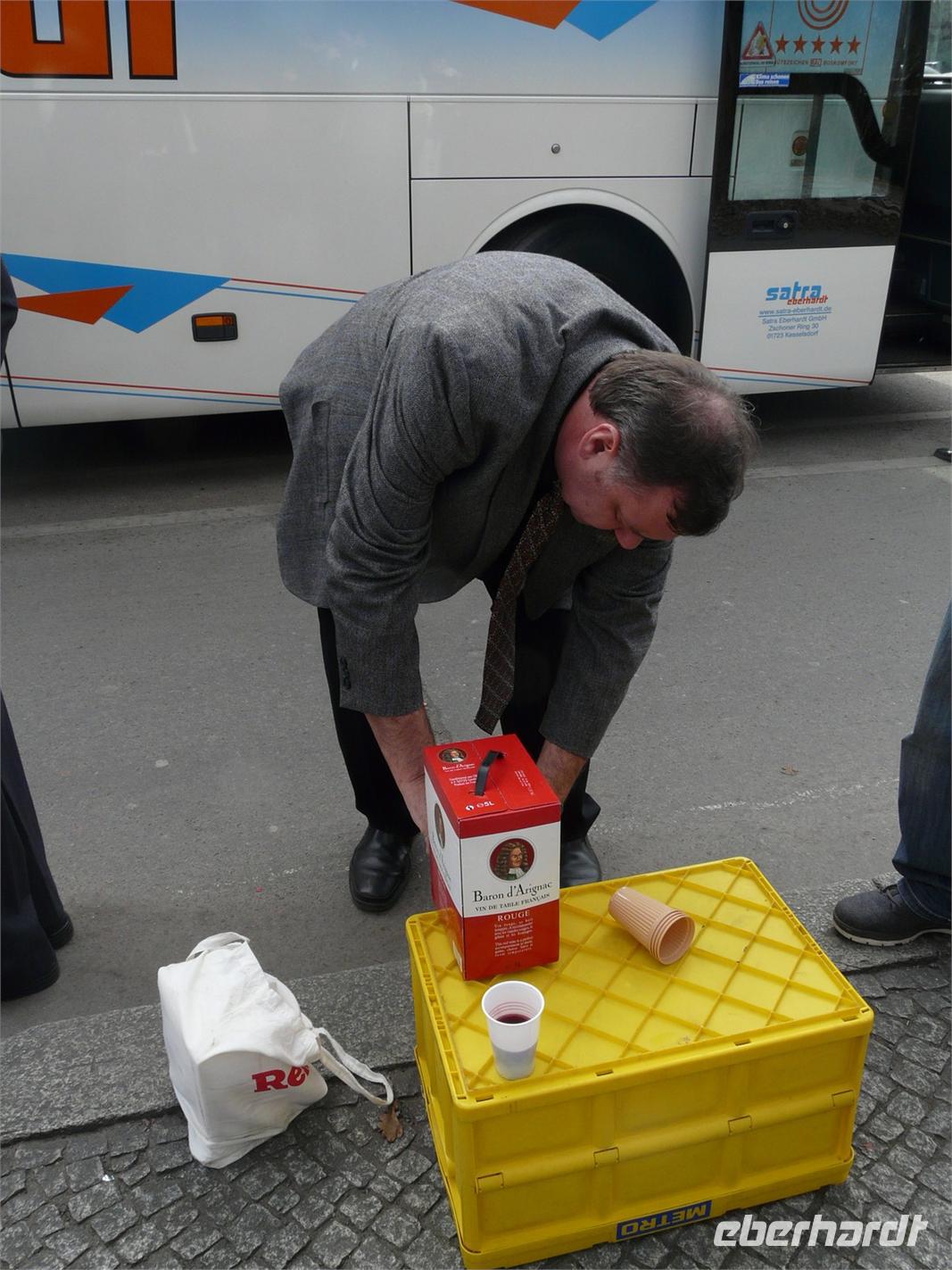 Nach kurzem Wegstück machten wir unsere Mittagsrast für eine knappe halbe Stunde auf dem Parkstreifen an der Siegessäule - wo es für jeden unserer Reisegäste eine wie bei Eberhardt üblichen Bordservice-Imbiß - Bockwurst mit Senf und Brot - gab und dazu einen französischen Rotwein.