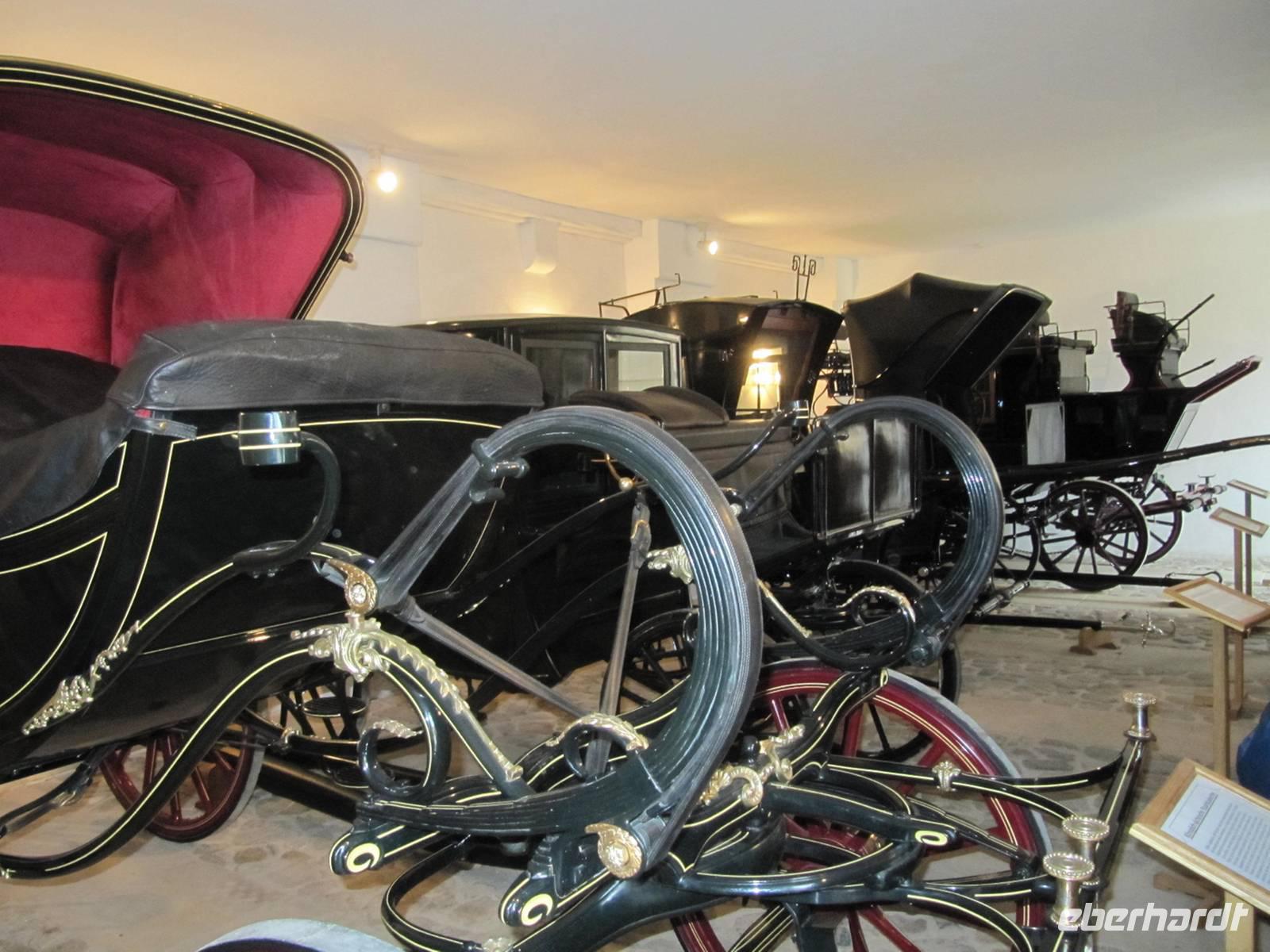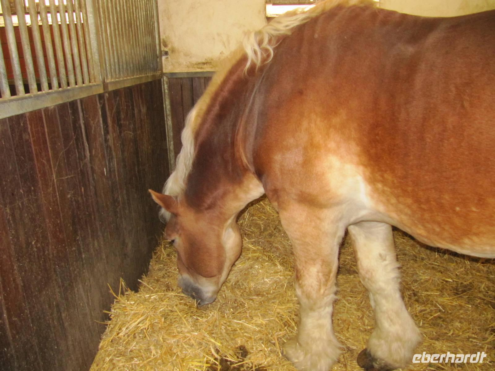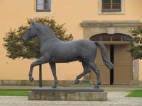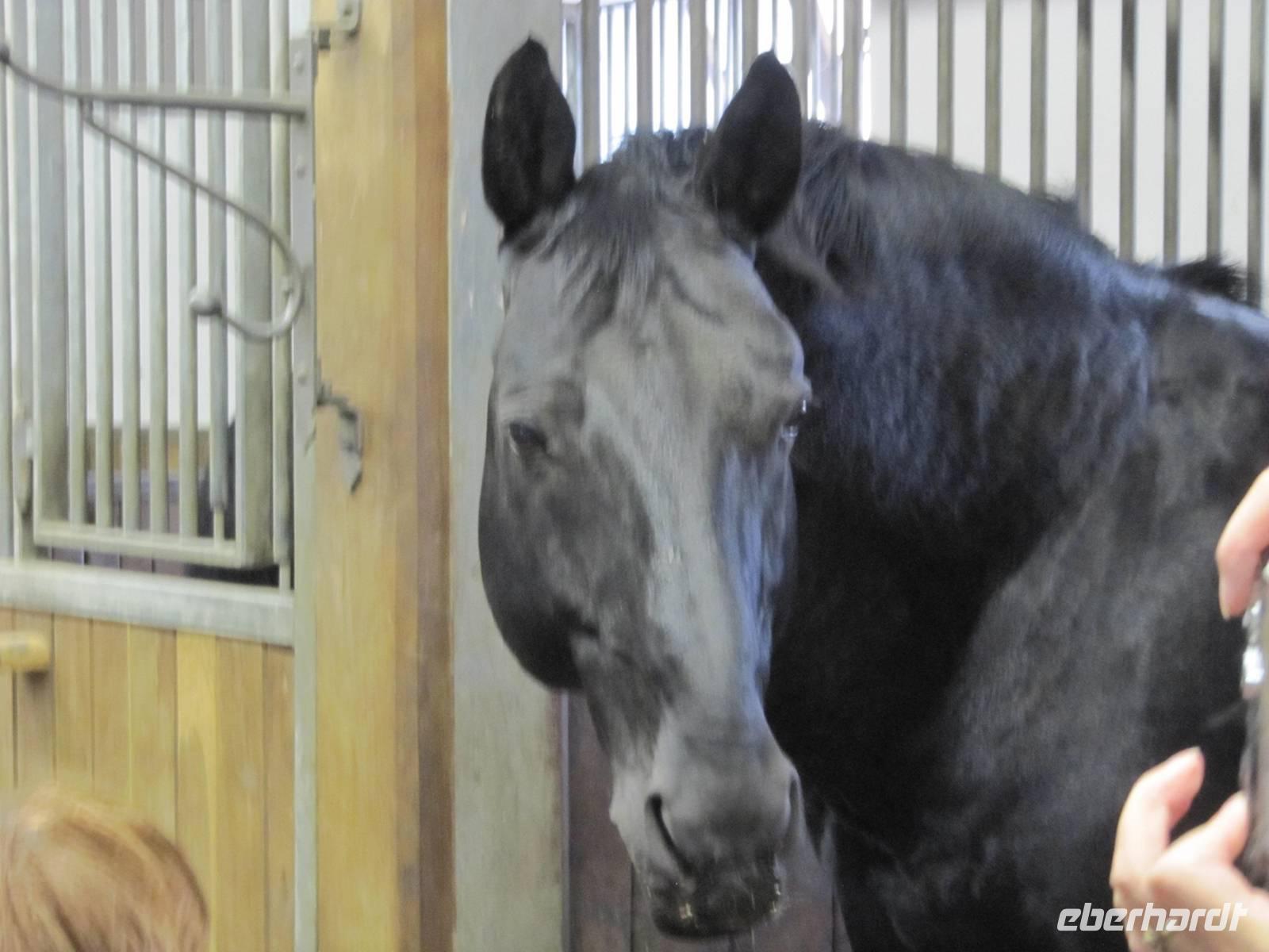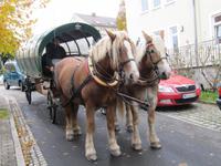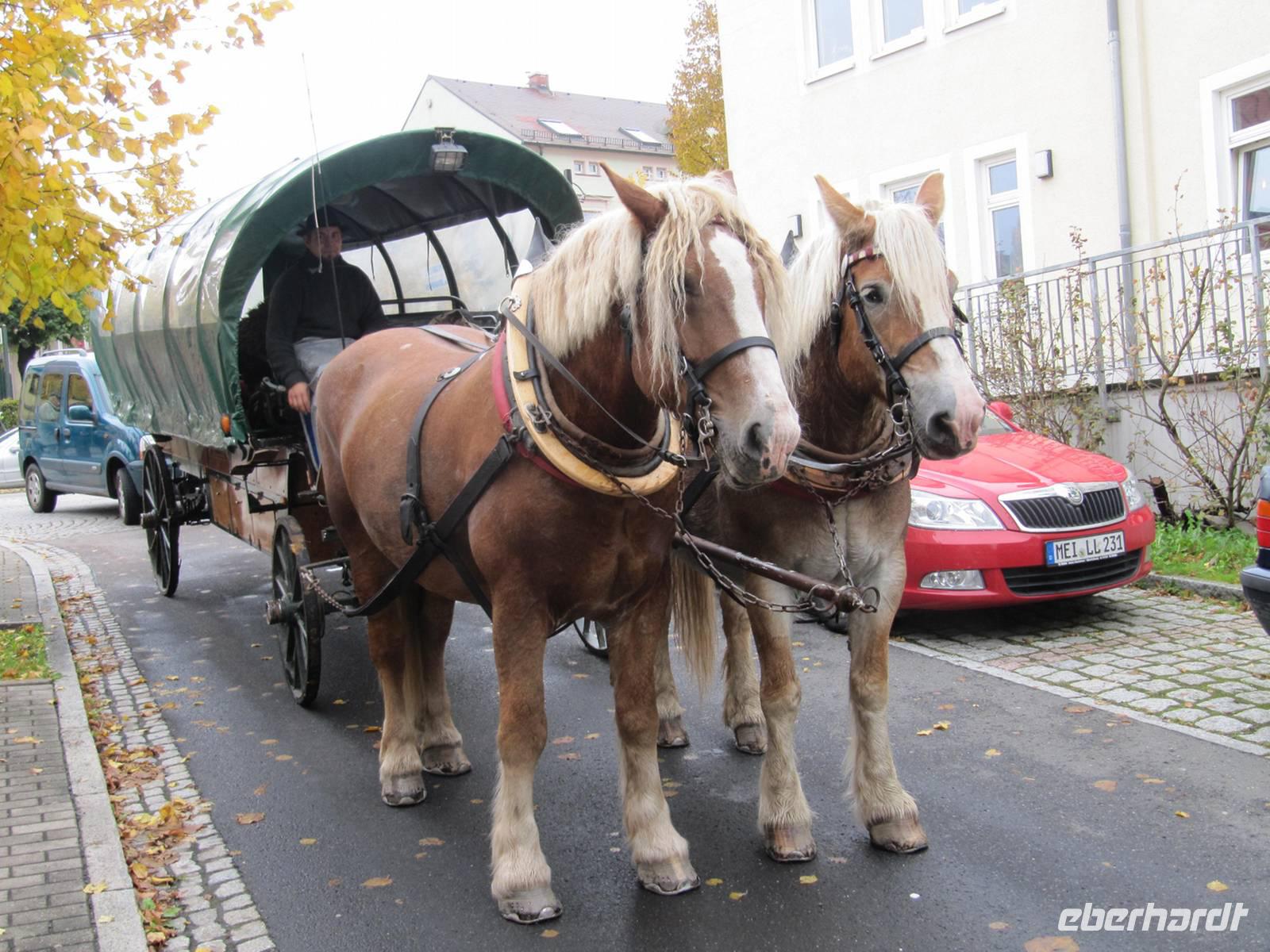 Unsere Treffen mit unseren lieben Reisegästen haben bei Eberhardt TRAVEL ja Tradition. Mal wandern wir in der Oberlausitz, mal radeln wir im Spreewald, aber heute hatten wir einen gemütlichen Tag vor uns. Wir trafen uns am geschichtsträchtigen Adams Gasthof in Moritzburg und begrüßten uns herzlich. Dann wartete schon eine überdachte Kutsche auf uns und zeigte uns die vielen Facetten Moritzburgs. Unser Kutscher war jungen Alters, aber konnte dennoch vieles über die Träume Augusts des Starken, der hier ein zweites Venedig aufbauen wollte, erzählen. Der anwesende Jäger konnte seine Ausführungen zu Rot- und Dammwild ergänzen, sodass wir umfassende Informationen bekamen. Aber natürlich darf bei einem solchen Ausflug auch ein wärmendes Getränk nicht fehlen, welches wir unter größten Anstrengungen abfüllten und tranken . Unser erster Glühwein der Saison! Unser Kutscher hatte Mitleid und stoppte sogar einen Moment, damit wir ohne rote Flecken, die Kutsche wieder verlassen konnten. Die Runde endete am Forsthaus in Moritzburg, wo schon der Mittagstisch für uns gedeckt war. Es gab leckere Kürbissuppe und im Anschluss leckeren Wildgulasch, Pute oder einen riesigen Salatteller. Dazu konnte man sich ein süffiges Bier oder auch einen Federweißen schmecken lassen. Frisch gestärkt spazierten wir nun zum Landgestüt Moritzburg, wo eine sehr interessante Führung über das Gelände auf uns wartete. Wir erfuhren den Unterschied zwischen Land- und Hauptgestüt, konnten etwas über die Arbeit auf dem Gestüt erfahren und kamen auch den "Hauptdarstellern" ganz nah - den anmutigen Pferden. Uns wurden Schwere Warmbluter und Kaltbluter vorgestellt und wir konnten den Hengsten einige Streicheleinheiten zukommen lassen. Wir sahen die Reithalle, die Besamungsstation und vieles mehr. Jede Frage wurde ausführlich und sehr ambitioniert beantwortet. Für alle war es eine sehr interessante Führung - vielen Dank dafür an dieser Stelle noch einmal! Als krönenden Abschluss wurde noch ein tolles Gruppenfoto an Eltons Statue geschossen, das uns immer an diesen schönen Tag erinnern wird. Elton hat sehr viel wertvolle Nachkommen hinterlassen, von denen auch heute noch einige auf dem Gestüt anzutreffen sind. Den nachgebauten Kutschen aus alten Zeiten schenkten wir ebenfalls gern unsere Aufmerksamkeit.