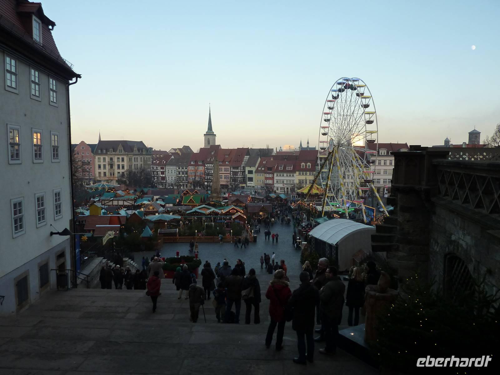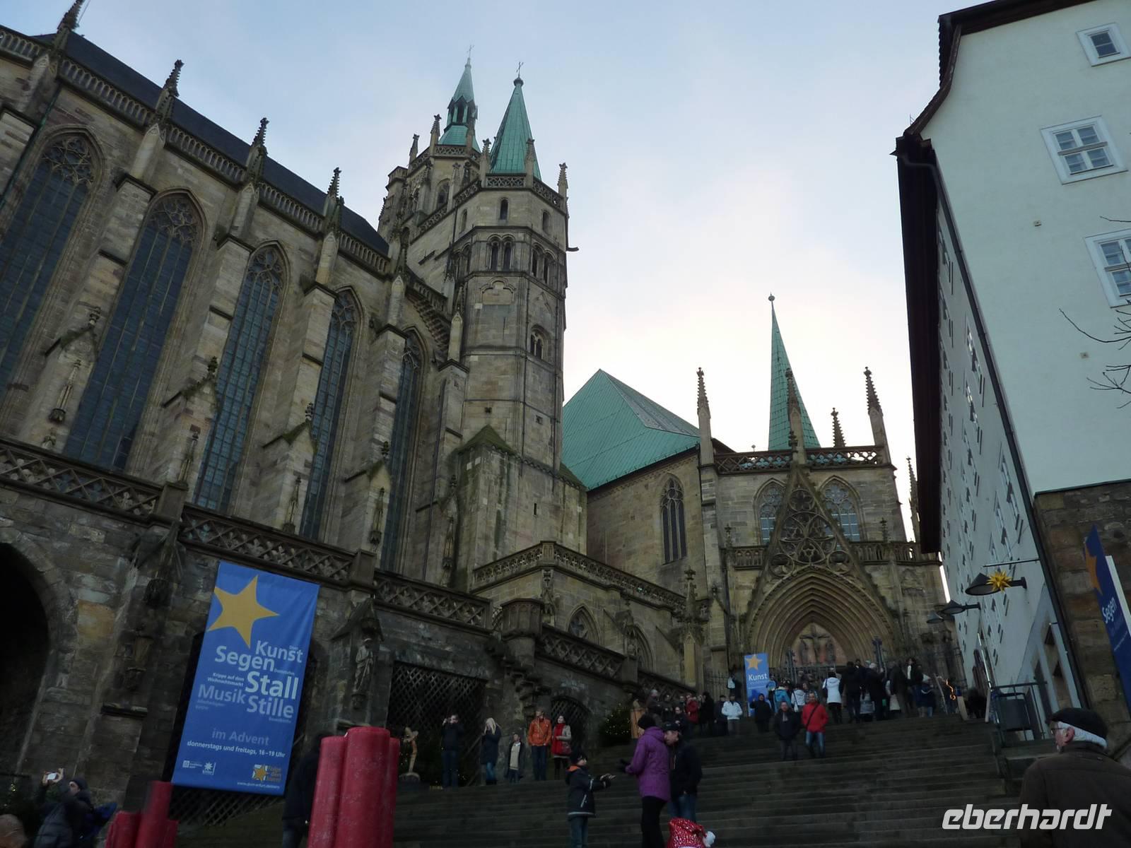 Nun schauten wir uns (endlich) die Barockstadt Fulda an. Mit zwei Gästeführerinnen besuchten wir Innenstadt, die Schatzkammer des Domes und die Michaeliskirche. Nach dem Mittagsessen im "Zum Ritter" traten wir, leider, die Heimreise an. Gern wären wir noch ein wenig geblieben, aber der Wagen, der rollt... Denn wir wollten noch eine kleinen Höhepunkt genießen: Bei einem Stopp in Erfurt besuchten wir den Weihnachtsmarkt und statteten auch dem Dom einen Besuch ab. Von hier oben hatte man einen wunderschönen Überblick über die weihnachtlich geschmückte historische Stadt. Nach dem obligatorischen Glühwein ging es aber nun wirklich zurück nach Dresden.