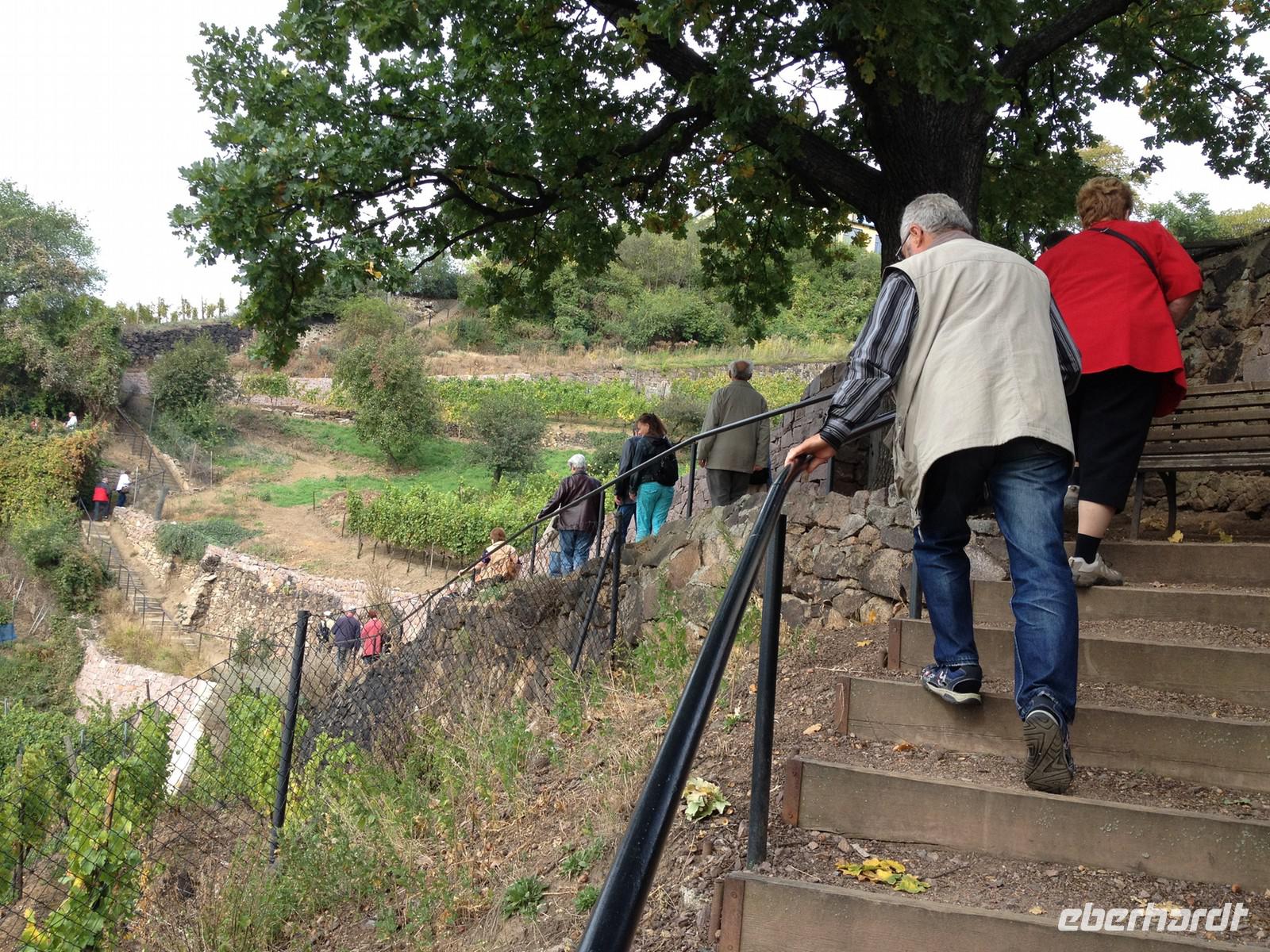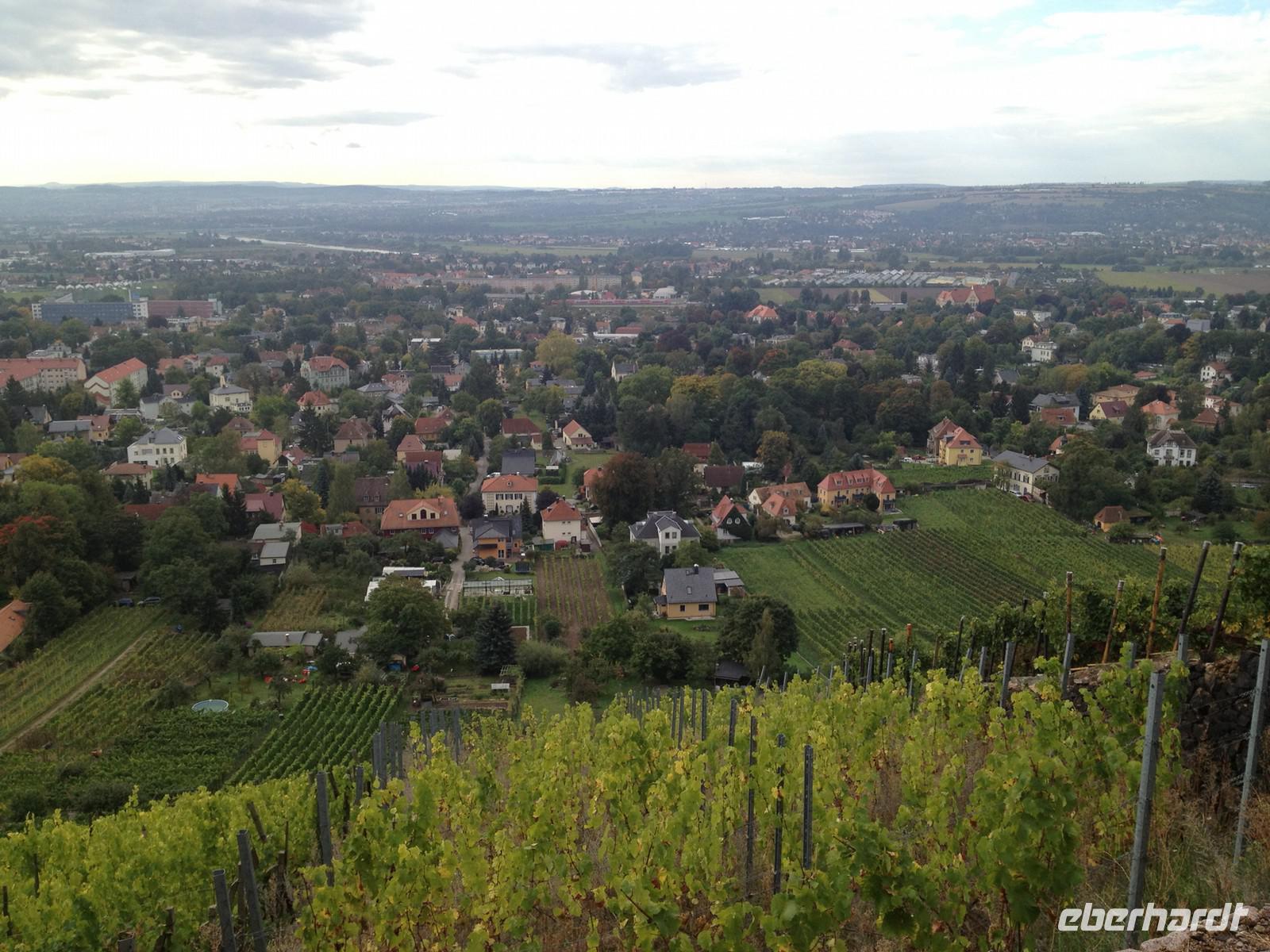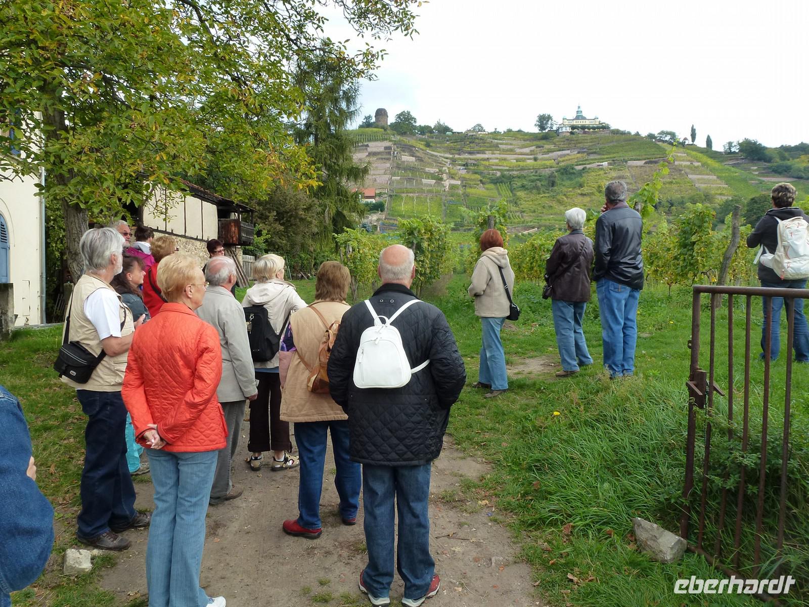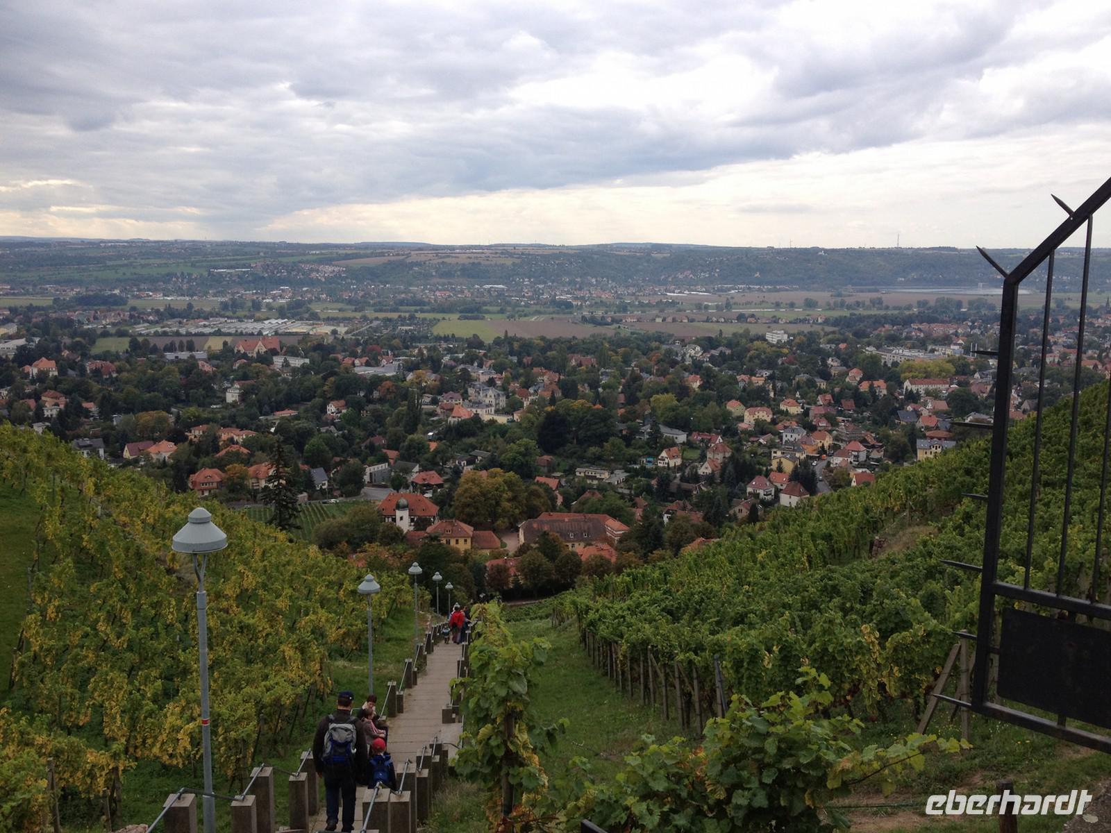 Anschließend starteten wir unsere Weinwanderung. Unser erster Besichtigungspunkt war das Weingut von Karl Friedrich Aust. Dieses befindet sich am Fuße der Prestige-Weinlage, dem "Radebeuler Goldener Wagen". Das denkmalgeschützte Winzerhaus, in dessen Keller die Weine ausgereift werden, stammt aus dem 17. Jahrhundert und ist als Meinholdsches Turmhaus bekannt. Begünstigt vom milden Klima des oberen Elbtals, wird in dieser Gegend bereits seit mehr als 850 Jahren Wein angebaut. Weiter ging es über die Weinbergstraße, vorbei an vielen kleinen Straußwirtschaften zur Weberstraße. Unser nächstes Ziel sollte das Spitzhaus sein. Ein steiler Aufstieg über den Eggersweg erwartete uns. Keuchend und schnaufend bezwangen wir die vielen Stufen und wurden dafür mit einem atemberaubenden Blick über Radebeul, Dresden und sogar bis zu den Tafelbergen der Sächsischen Schweiz belohnt.