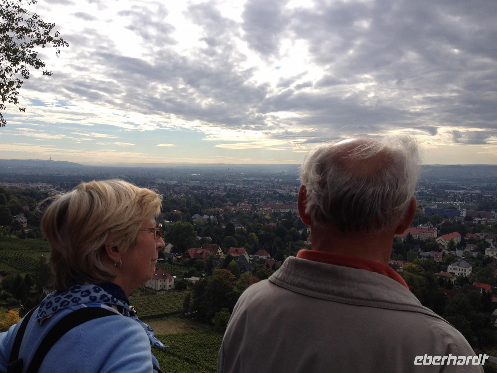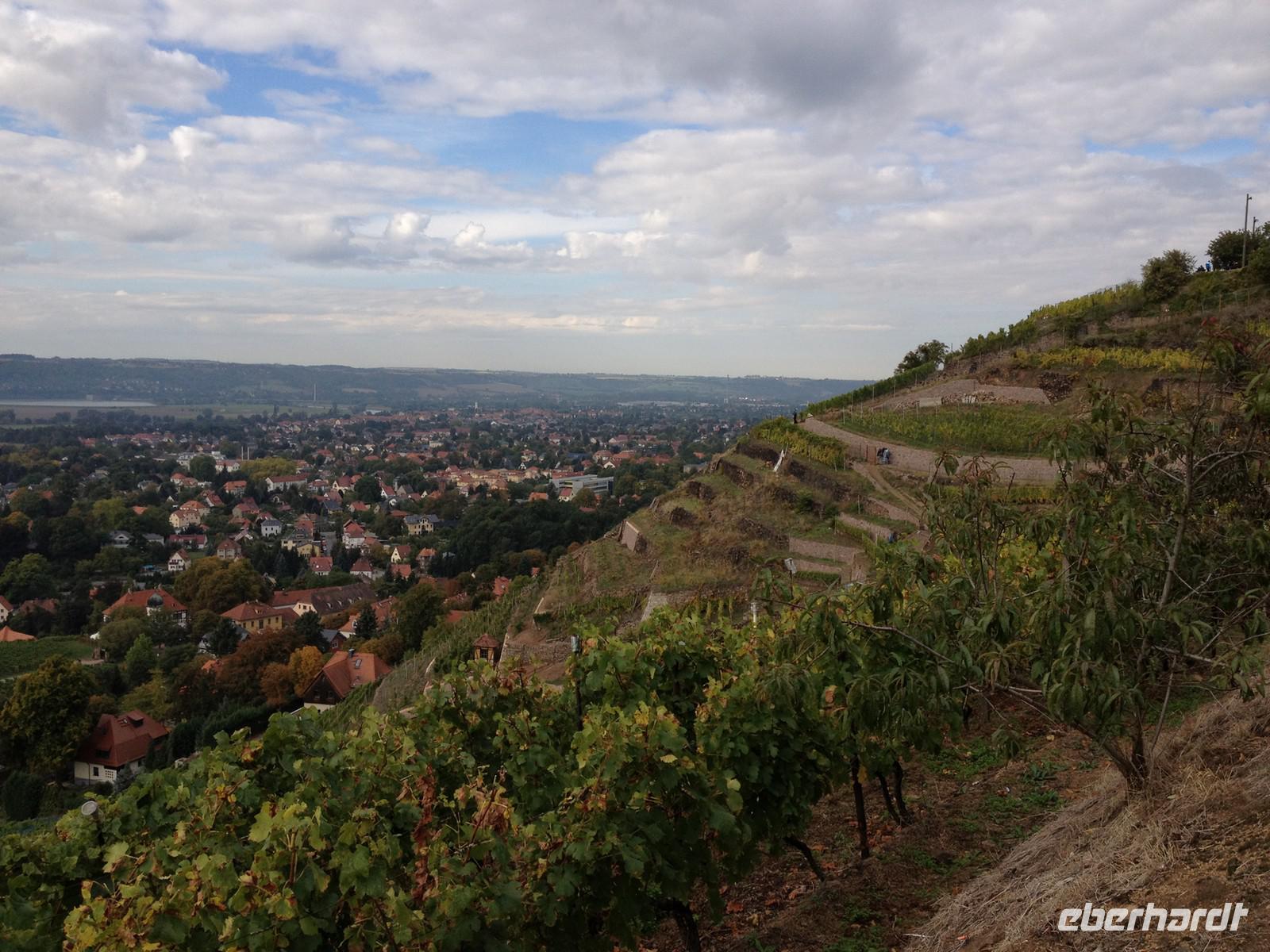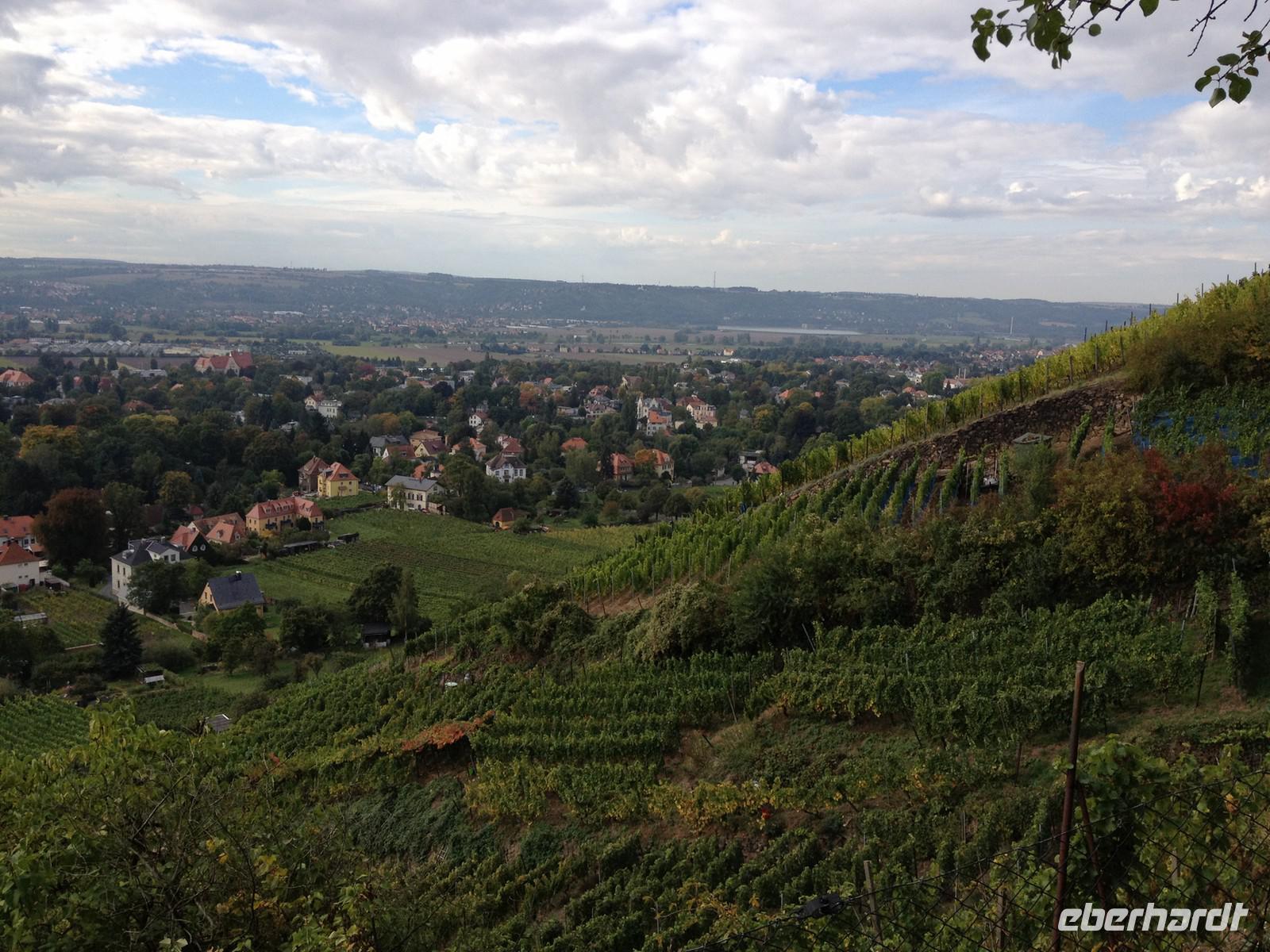 Anschließend starteten wir unsere Weinwanderung. Unser erster Besichtigungspunkt war das Weingut von Karl Friedrich Aust. Dieses befindet sich am Fuße der Prestige-Weinlage, dem "Radebeuler Goldener Wagen". Das denkmalgeschützte Winzerhaus, in dessen Keller die Weine ausgereift werden, stammt aus dem 17. Jahrhundert und ist als Meinholdsches Turmhaus bekannt. Begünstigt vom milden Klima des oberen Elbtals, wird in dieser Gegend bereits seit mehr als 850 Jahren Wein angebaut. Weiter ging es über die Weinbergstraße, vorbei an vielen kleinen Straußwirtschaften zur Weberstraße. Unser nächstes Ziel sollte das Spitzhaus sein. Ein steiler Aufstieg über den Eggersweg erwartete uns. Keuchend und schnaufend bezwangen wir die vielen Stufen und wurden dafür mit einem atemberaubenden Blick über Radebeul, Dresden und sogar bis zu den Tafelbergen der Sächsischen Schweiz belohnt.