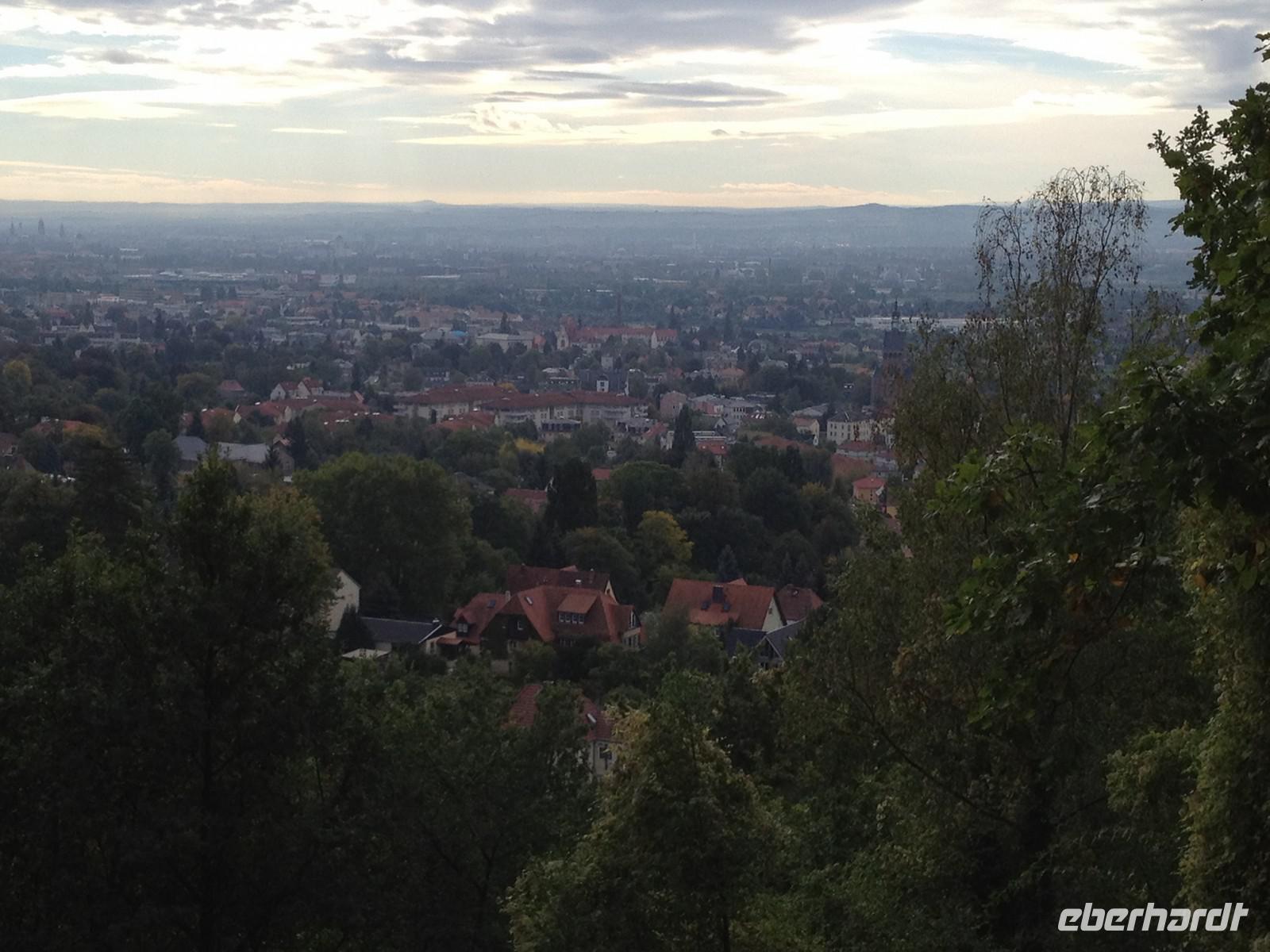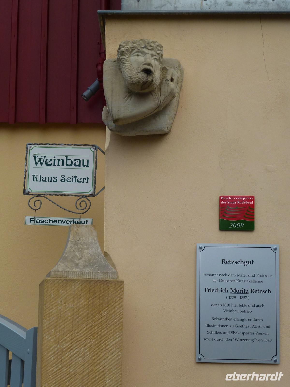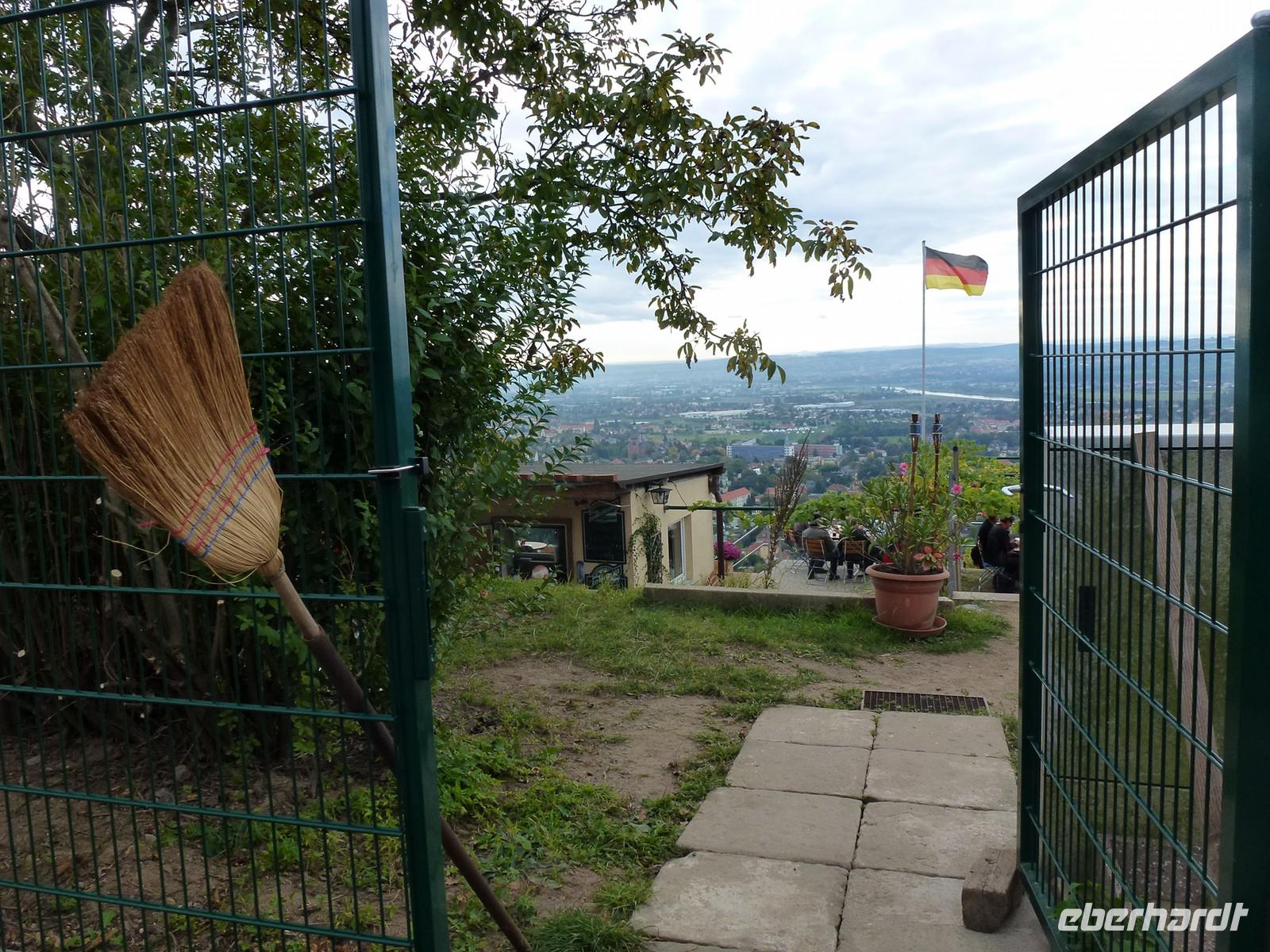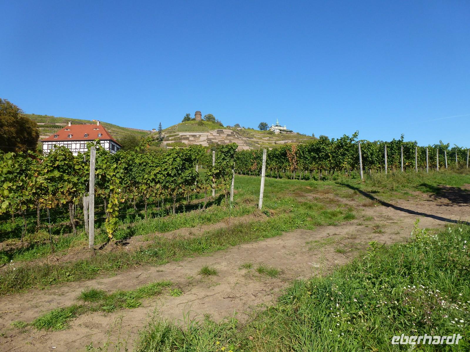 Anschließend starteten wir unsere Weinwanderung. Unser erster Besichtigungspunkt war das Weingut von Karl Friedrich Aust. Dieses befindet sich am Fuße der Prestige-Weinlage, dem "Radebeuler Goldener Wagen". Das denkmalgeschützte Winzerhaus, in dessen Keller die Weine ausgereift werden, stammt aus dem 17. Jahrhundert und ist als Meinholdsches Turmhaus bekannt. Begünstigt vom milden Klima des oberen Elbtals, wird in dieser Gegend bereits seit mehr als 850 Jahren Wein angebaut. Weiter ging es über die Weinbergstraße, vorbei an vielen kleinen Straußwirtschaften zur Weberstraße. Unser nächstes Ziel sollte das Spitzhaus sein. Ein steiler Aufstieg über den Eggersweg erwartete uns. Keuchend und schnaufend bezwangen wir die vielen Stufen und wurden dafür mit einem atemberaubenden Blick über Radebeul, Dresden und sogar bis zu den Tafelbergen der Sächsischen Schweiz belohnt.