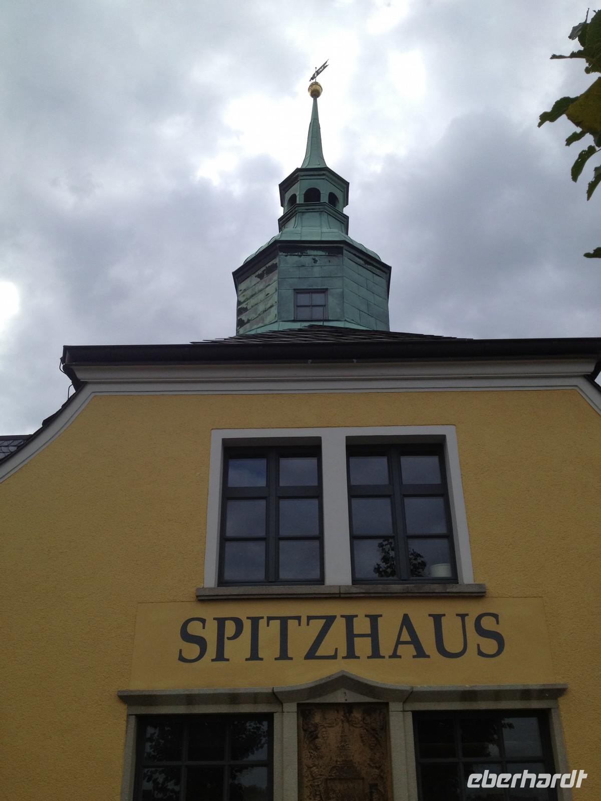 Am Spitzhaus angekommen, erzählte uns Regina wichtige geschichtliche Hintergründe zu dem heutigen Ausflugslokal. 1622 wurde das Spitzhaus als kleines Weinberghaus auf dem Landsbergischen Weinberg erbaut. Es wurde an Stelle eines kurfürstlichen Vorwerks errichtet. Dieses Gebäude wurde wegen der Höhenlage auch „Hochhaus" genannt. Später trug es etliche Zeit den Namen „Hohes Haus". Seine einst eindrucksvolle Umrisslinie mit der kühn geschwungenen Dachhaube brachte ihm den Namen „Spitzhaus" ein. Kurfürst Johann Georg I. soll es errichtet haben. Die Besitzer wechselten oft, manchmal geschah dies im Jahrestakt. Jedenfalls kam es irgendwann in den Besitz der Gräfin Cosel, welche es 1710 ihrem Gönner, August dem Starken, übergab. Dieser feierte daraufhin hier auf der Bergeshöhe glänzende Feste. Nach der politischen Wende 1990 wurde es wieder eine private Gaststätte und ging nach der Schließung 1995 in den Besitz der Stadt Radebeul über. Heute wird es von der Familie Andreas bewirtschaftet.