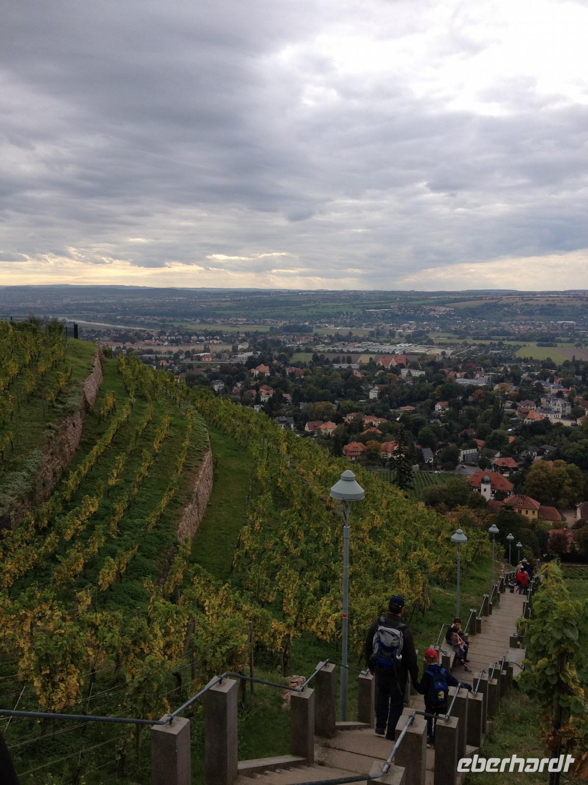 Nach dem wir mit unserem Glas in der Hand und dem wundervollen Ausblick die Momente genossen haben, begaben wir uns Richtung Spitzhaustreppe. Am Muschelpavillon machten wir unser obligatorisches Gruppenfoto und bereiteten uns für den Abstieg vor. Die Spitzhaustreppe (auch Jahrestreppe oder Himmelstreppe) verbindet das Weingut Hoflößnitz mit dem Spitzhaus beziehungsweise dem Bismarckturm. Der Aufstieg, einschließlich des Muschelpavillons, ist denkmalgeschützt.Für August den Starken entwarf Matthäus Daniel Pöppelmann eine zu je sieben Stufen bei 52 Absätzen umfassende Jahrestreppe. Realisiert wurden nach Pöppelmanns Tod von 1747 bis 1750 sogar 390 Stufen, womit es sich um die größte barocke Treppenanlage Sachsens handelt, die auf 220 Metern Länge gradläufig 76 Meter Höhe überwindet.